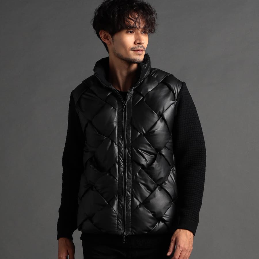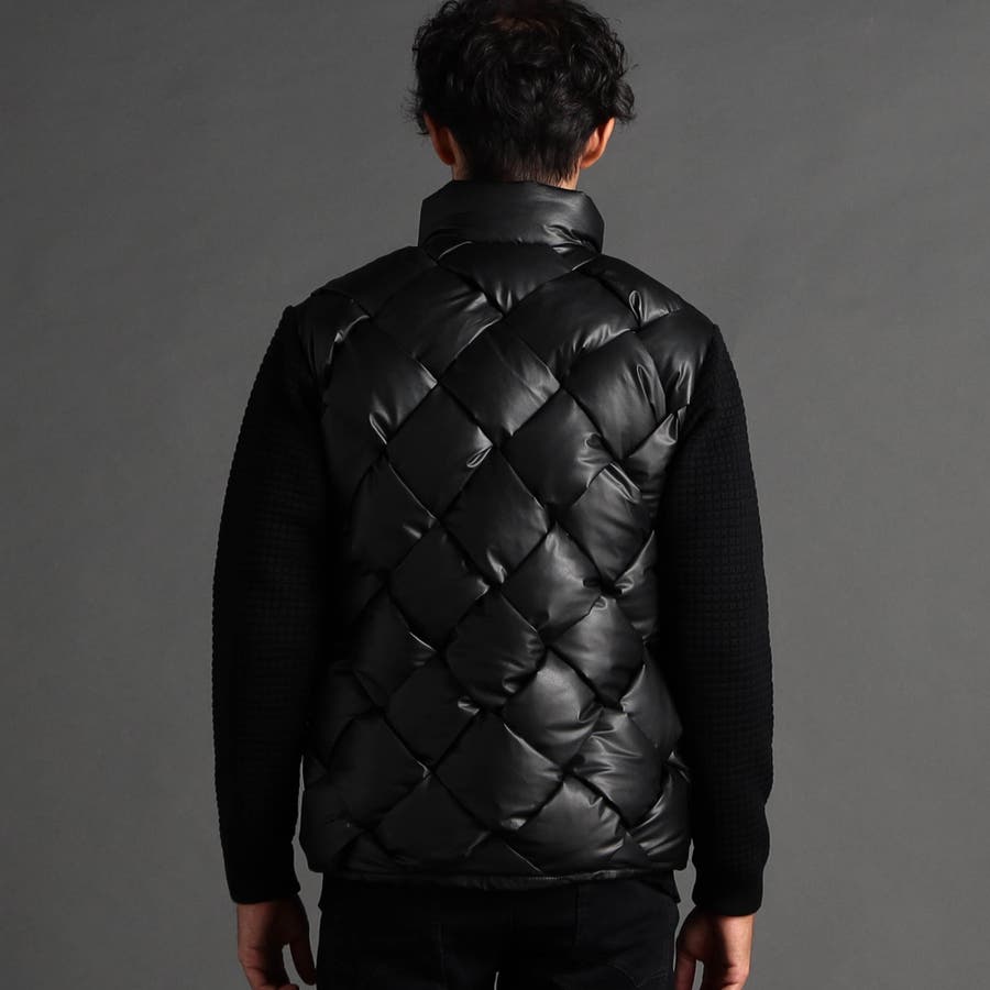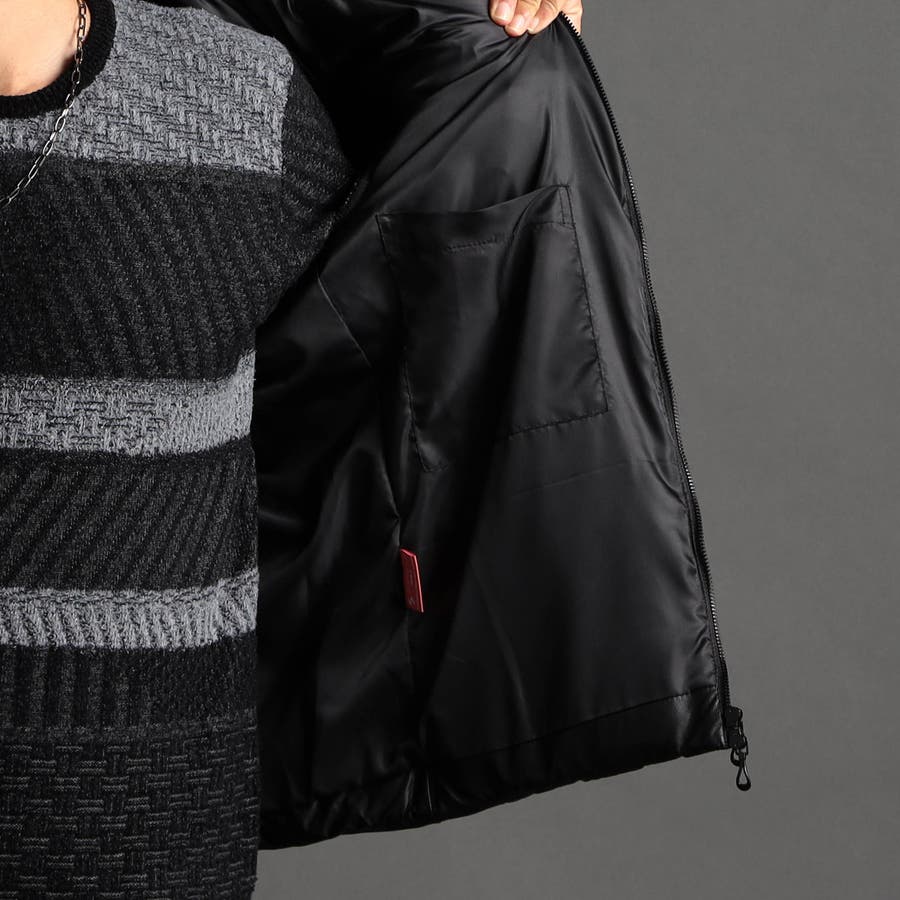 イントレチャートデザインを取り入れたのパテッドブルゾン。表地をチューブ状に縫製、その中にボール状の粒中わたを詰めてから編み込んでいます。表地側の脇にスラッシュポケット、裏地側には左内パッチポケットがあります。表地と裏地の間にもう1枚裏地があるのですが、表側の編み込みからの入れられる隠しポケットを付けています。袖は目付(重み)のあるニット袖。裏地を付けていないので、身頃に負けない様にミドルゲージで度目を詰めて肉感を出しています。衿裏も生地を劣化しにくくする為にニット素材で切り替えています。