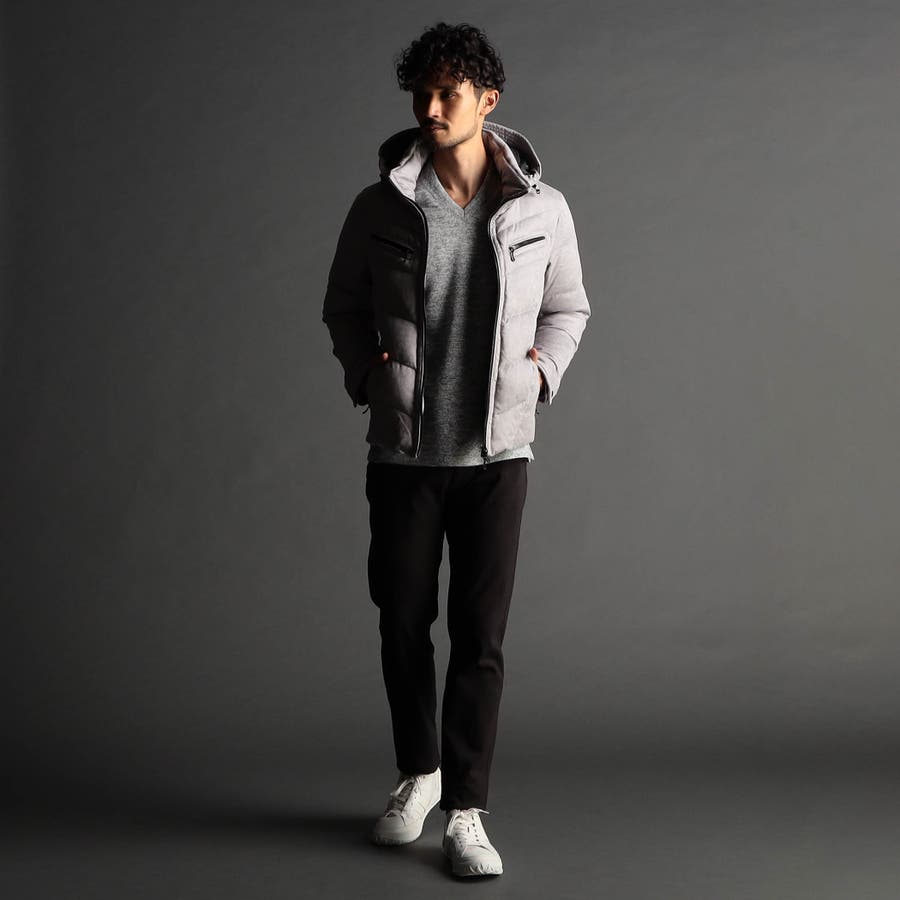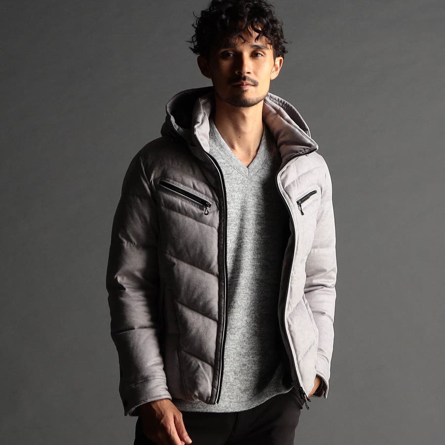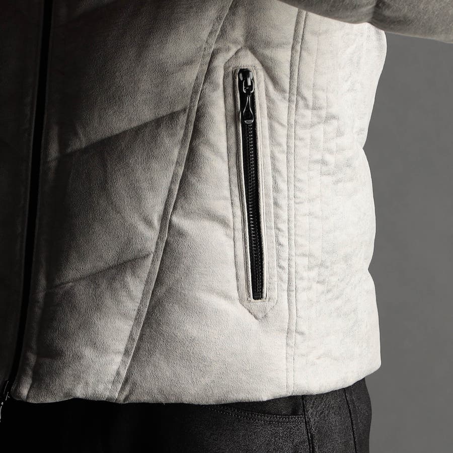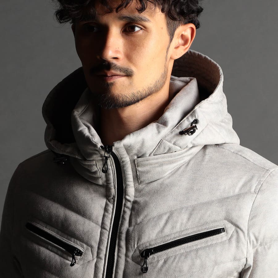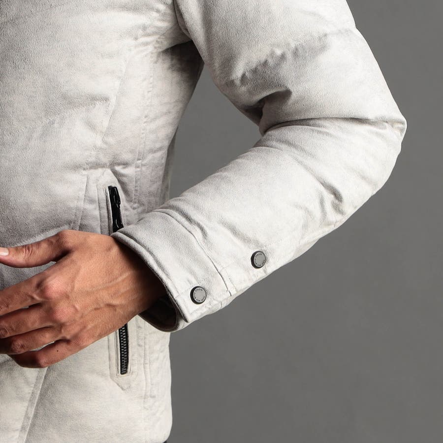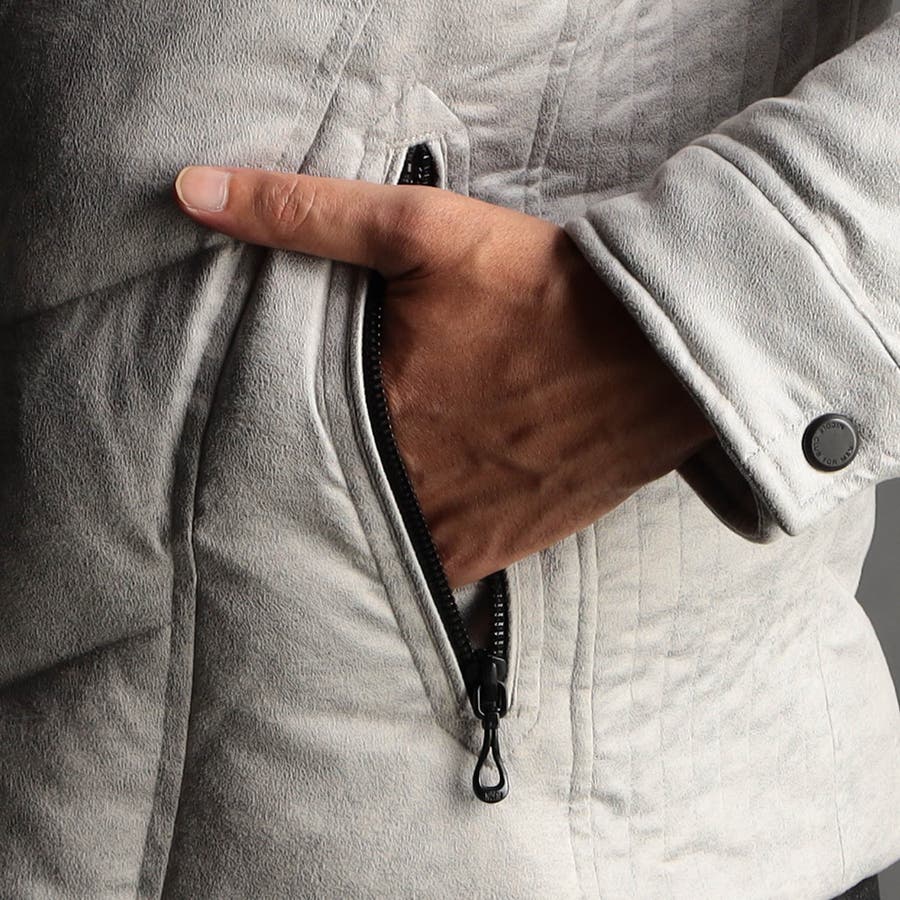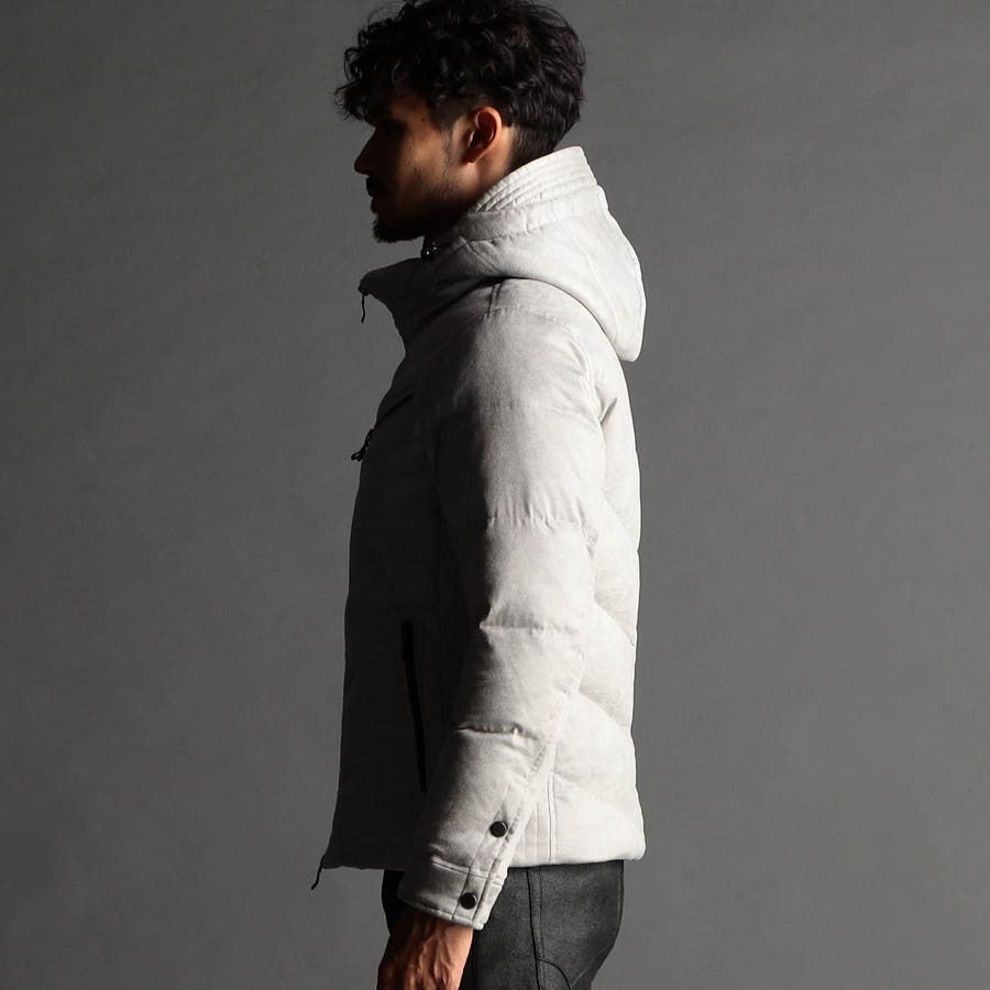 マイクロファイバーで織られた薄手のポリエステル生地を起毛加工したのスウェード素材をベースに、微光沢の同色系ムラプリントを施しています。奥行きのある見え方に、マイクロスウェードの滑らかなタッチ感と上品な光沢感が特徴です。ストレッチ性もあるので、程良いダウン分量でも適度な張り感とフィット感を高めます。生地加工で撥水効果を高め、中身のダウンには撥水加工を施したシルバー(グレー)ダックダウンを採用する事で家庭洗濯を可能にしています。衿や細腹、小パーツにはシートタイプの中わたを採用して型崩れしにくくしています。