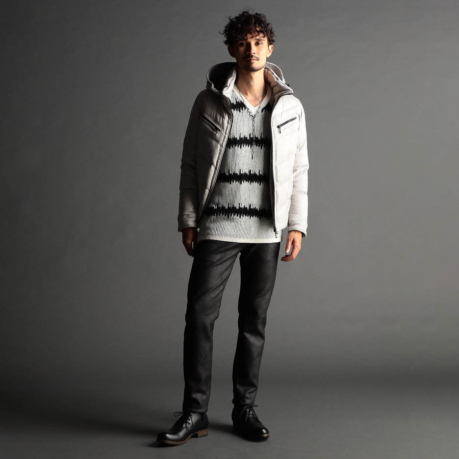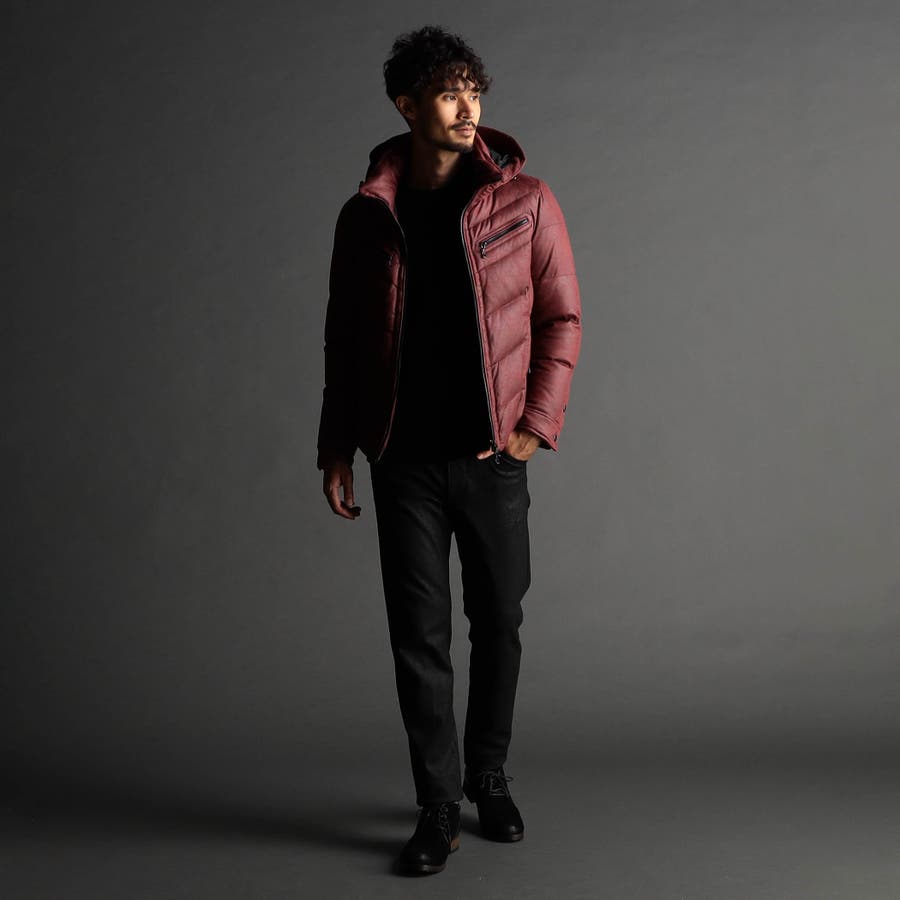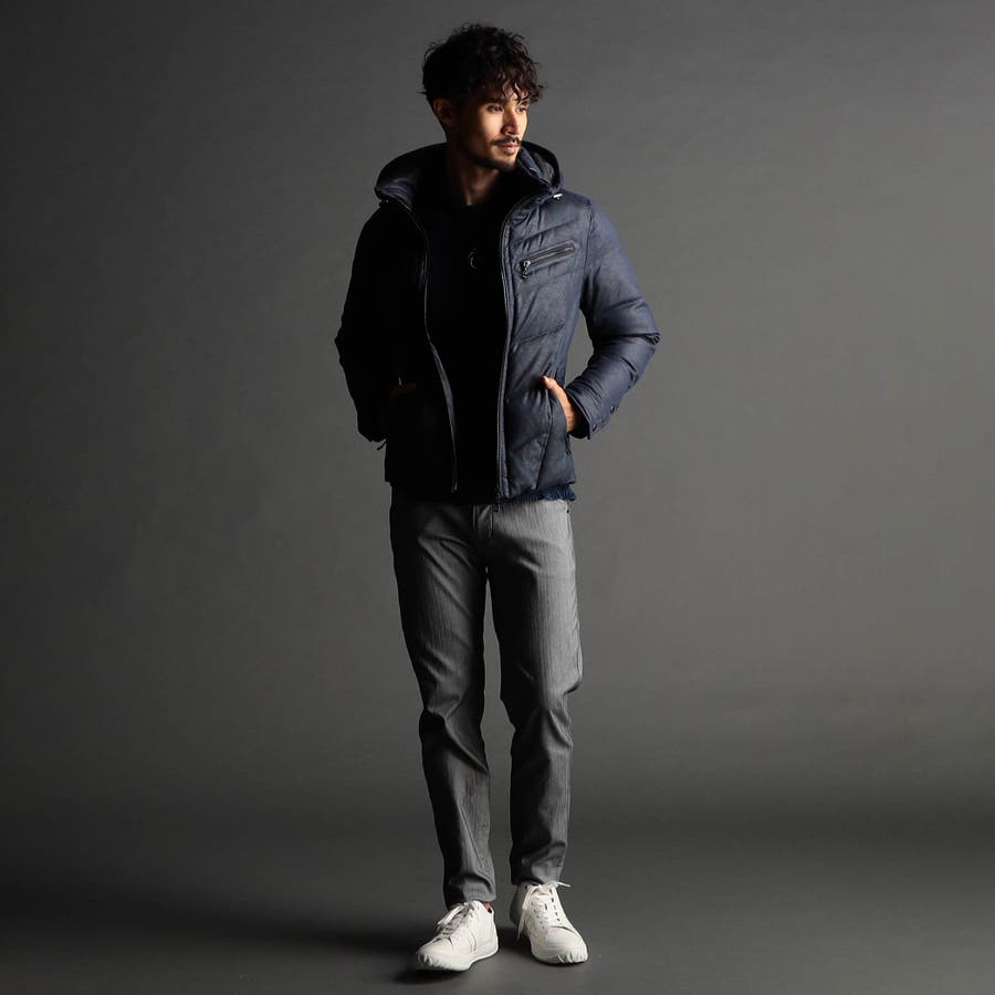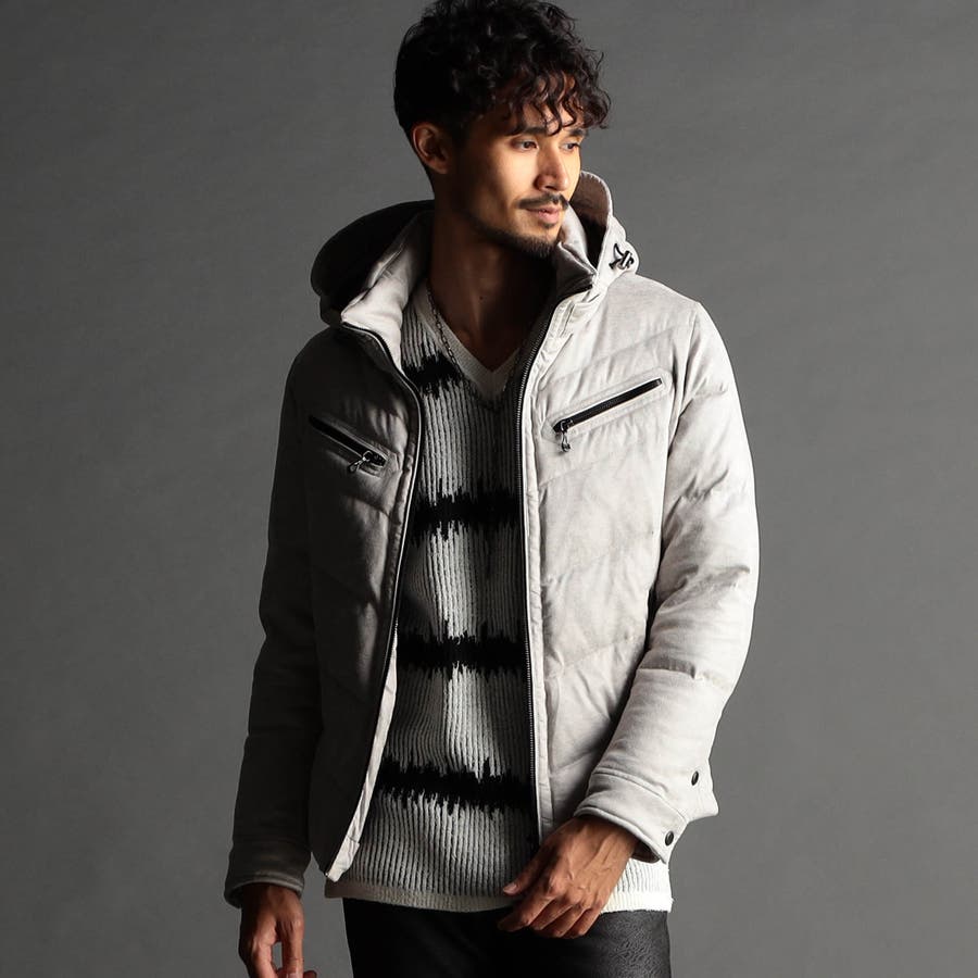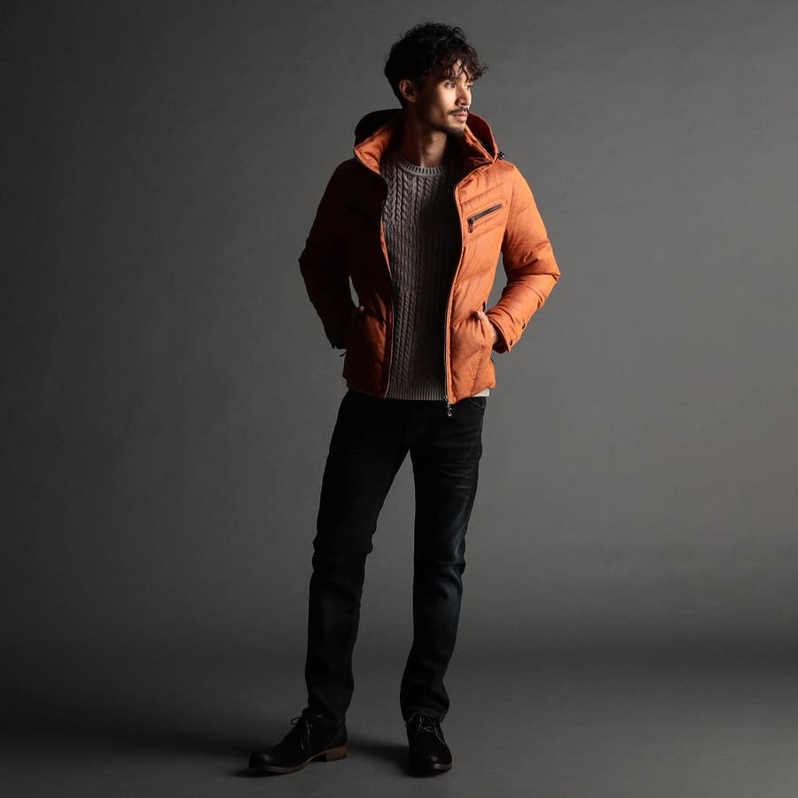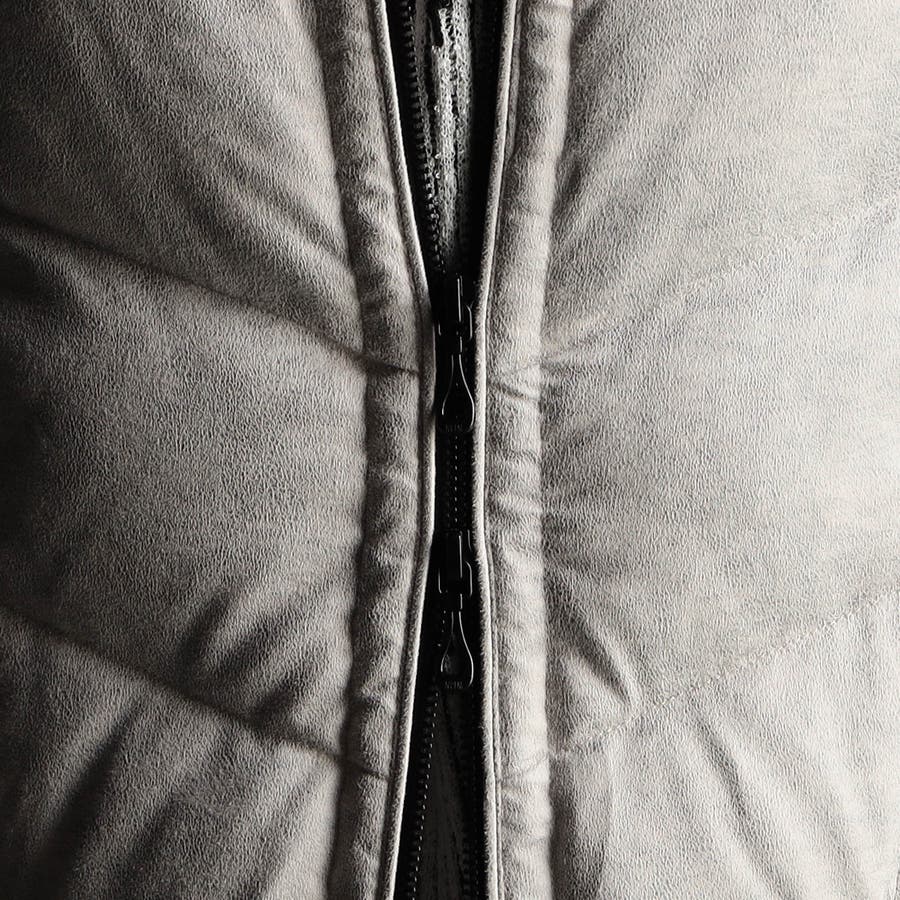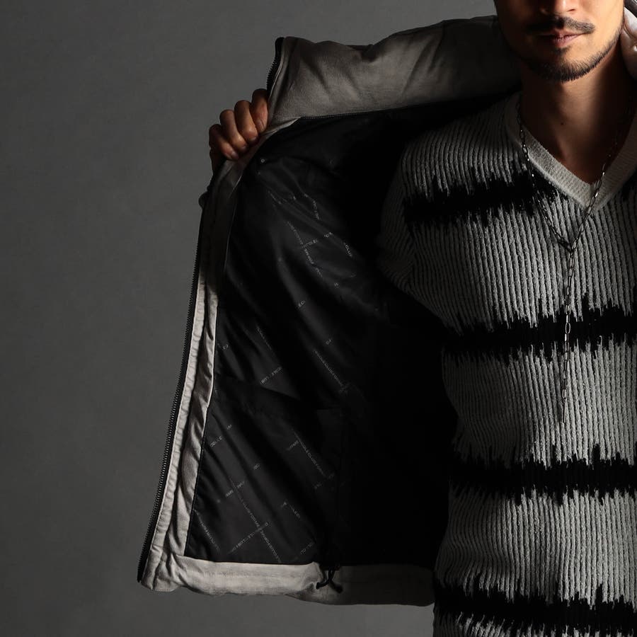 マイクロファイバーで織られた薄手のポリエステル生地を起毛加工したのスウェード素材をベースに、微光沢の同色系ムラプリントを施しています。奥行きのある見え方に、マイクロスウェードの滑らかなタッチ感と上品な光沢感が特徴です。ストレッチ性もあるので、程良いダウン分量でも適度な張り感とフィット感を高めます。生地加工で撥水効果を高め、中身のダウンには撥水加工を施したシルバー(グレー)ダックダウンを採用する事で家庭洗濯を可能にしています。衿や細腹、小パーツにはシートタイプの中わたを採用して型崩れしにくくしています。