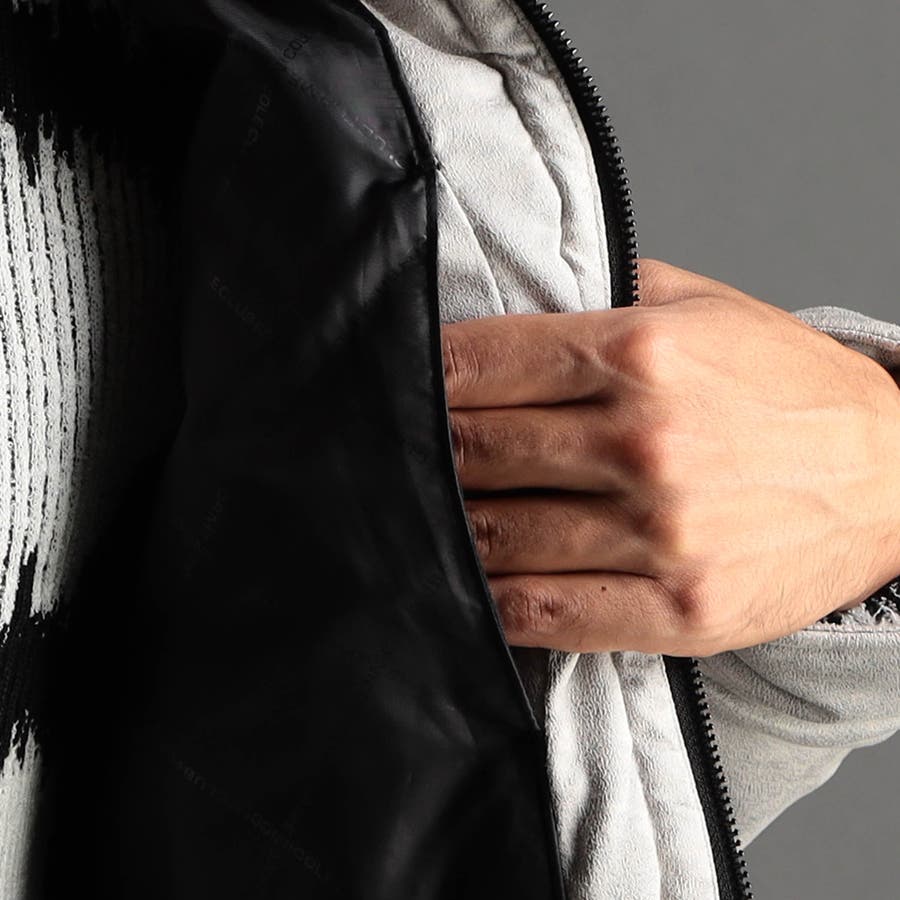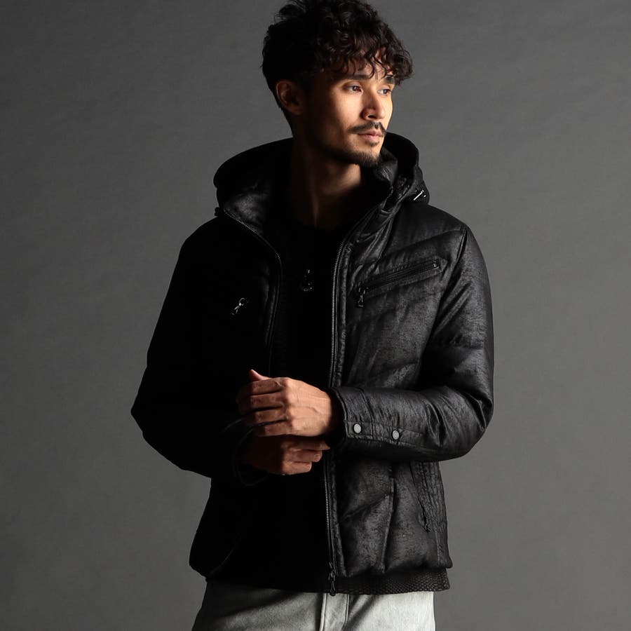 ウエストシェイプが綺麗なシャープなシルエットのライダースダウンブルゾン。逆三角形に見える切り替えデザインとダウンステッチ、細腹のタテステッチで綺麗なシルエットを強調。特徴的な前振りのライダース袖は脇下部分のダウンを抜く事で落ち着きを良くし、更にマチ布を作って動きやすさと見栄えを良くしています。背中の裏地と袖の裏地をバイアス裁断して表地のストレッチ性、腕の動きに追従するようにしています。YKK別注のブラックエナメルファスナーやブランドロゴのエンボスプリントを入れた裏地、オリジナルドット釦をアクセントに、着脱出来るフード仕様、蓄熱機能裏地を部分的に使用、衿吊りの帯電防止用テープなど細かいディテールまで拘った仕様です。内ポケットはパッチポケットと、胸辺りに身返しとの切り替えを利用したスラッシュポケットを両身に配置しています。トップメゾンも取り扱うベトナムのダウン専門工場で作っていますので、細かい縫製仕様も仕上がりも良く出来ています。