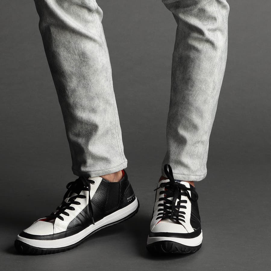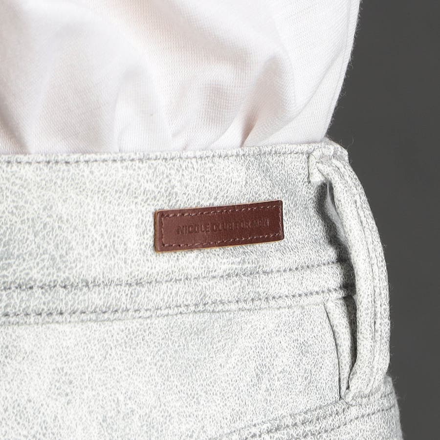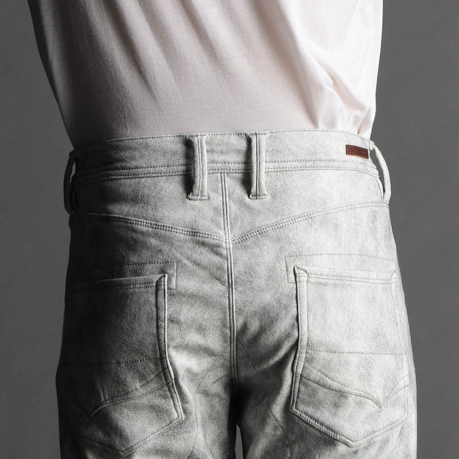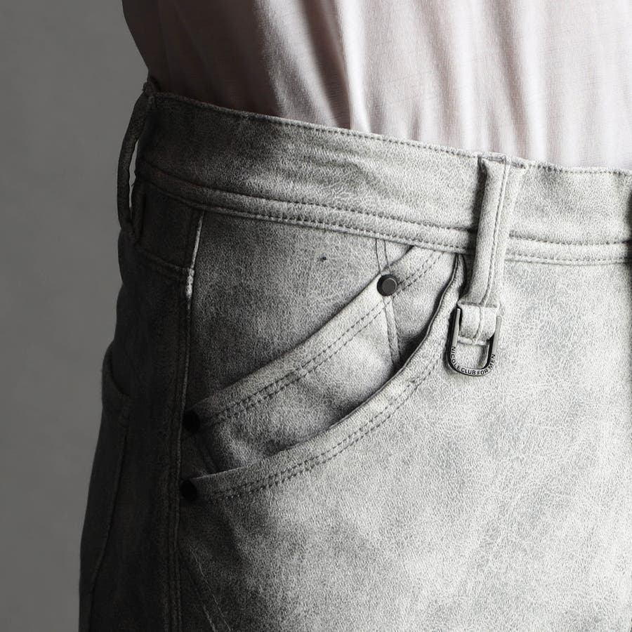 吸湿性の高い再生繊維のレーヨン糸とプリッとしたコシを出すナイロン糸を使用したハイパワーストレッチ素材をベースに、革の表面のシボの様なムラ柄プリントを施してレザー調の質感を表現しています。更に裏側を微起毛して風合い、肌触りを良くし、保温性を高めています。ポリウレタン混の良く伸びてキックバックが利いたストレッチ感が抜群です。