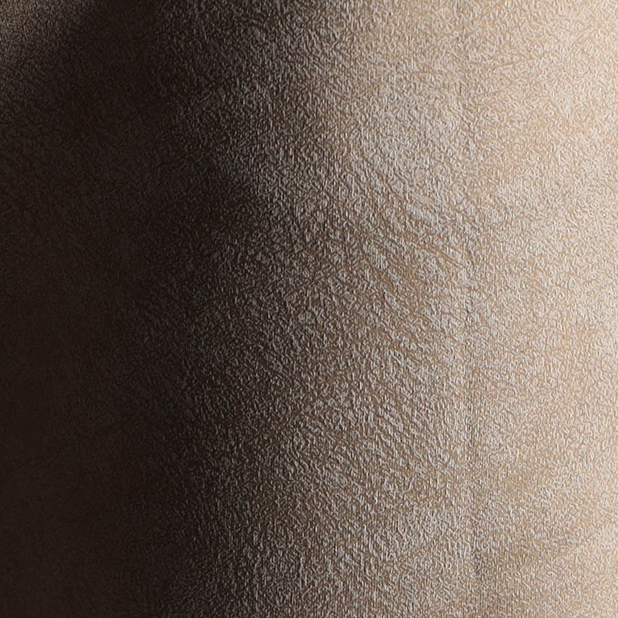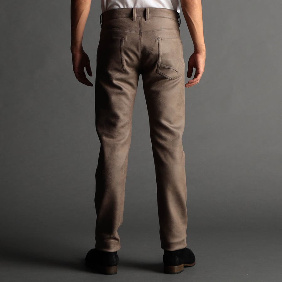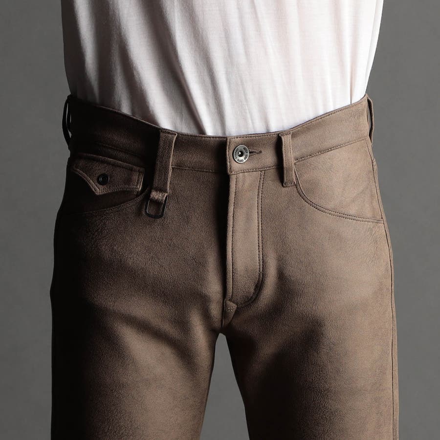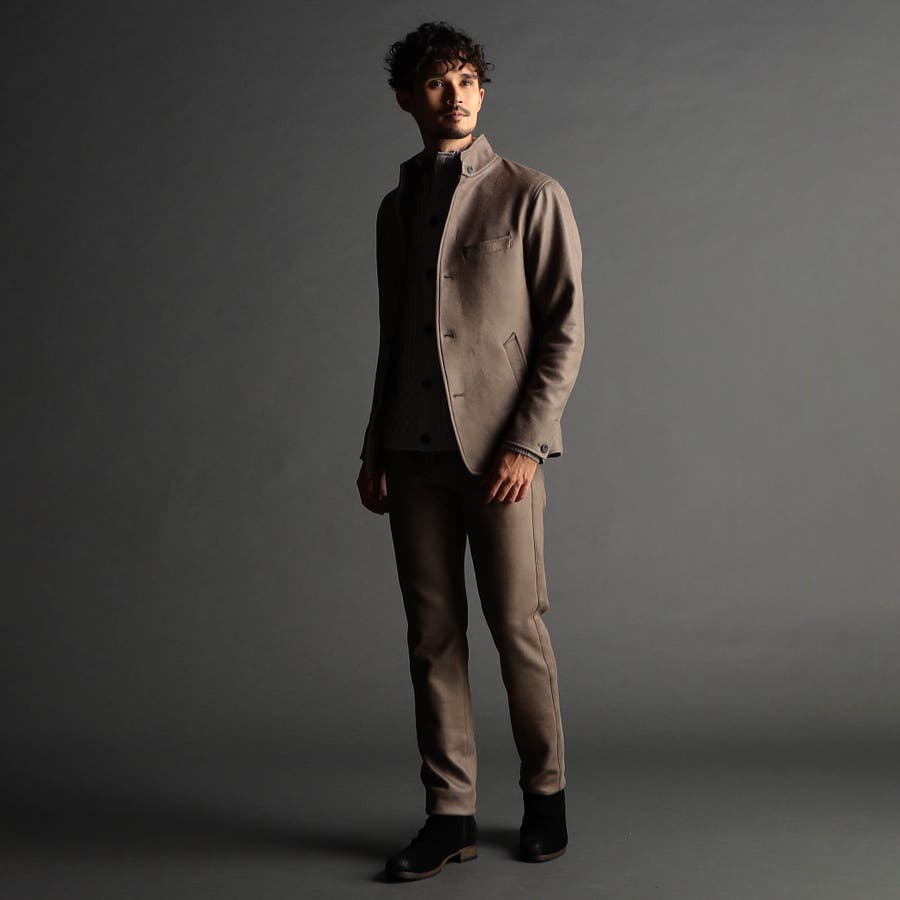 ポリエステルのマイクロファイバーで編まれたポンチ(ジャージ)素材の表面をスウェード起毛、トーン違いの同色系ムラプリントを施してレザー調の見え方に作っています。滑らかなタッチとソフト風合い、マルチなストレッチ性が特徴。ジャージ素材なのではのプリッとした横張り感もあり、シルエットを綺麗に作ります。更に生地加工で撥水効果をプラス、防汚効果を高めています。
