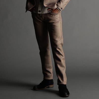 右前のフラップ付コインポケットをアクセントにした5ポケットデザイン。素材にあわせてウエストベルトも少し伸びる様に縫製しています。ストレッチ裏地を別布に使用していますので穿き着心地も抜群です。