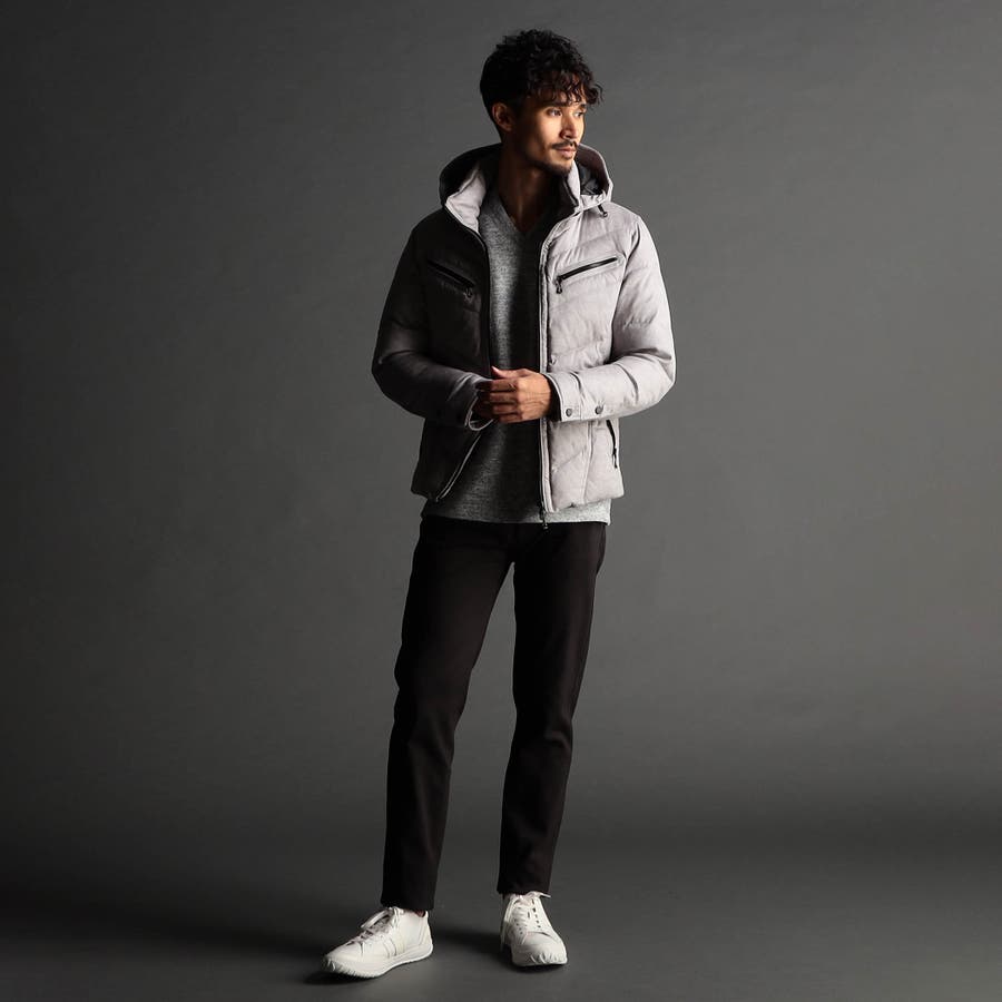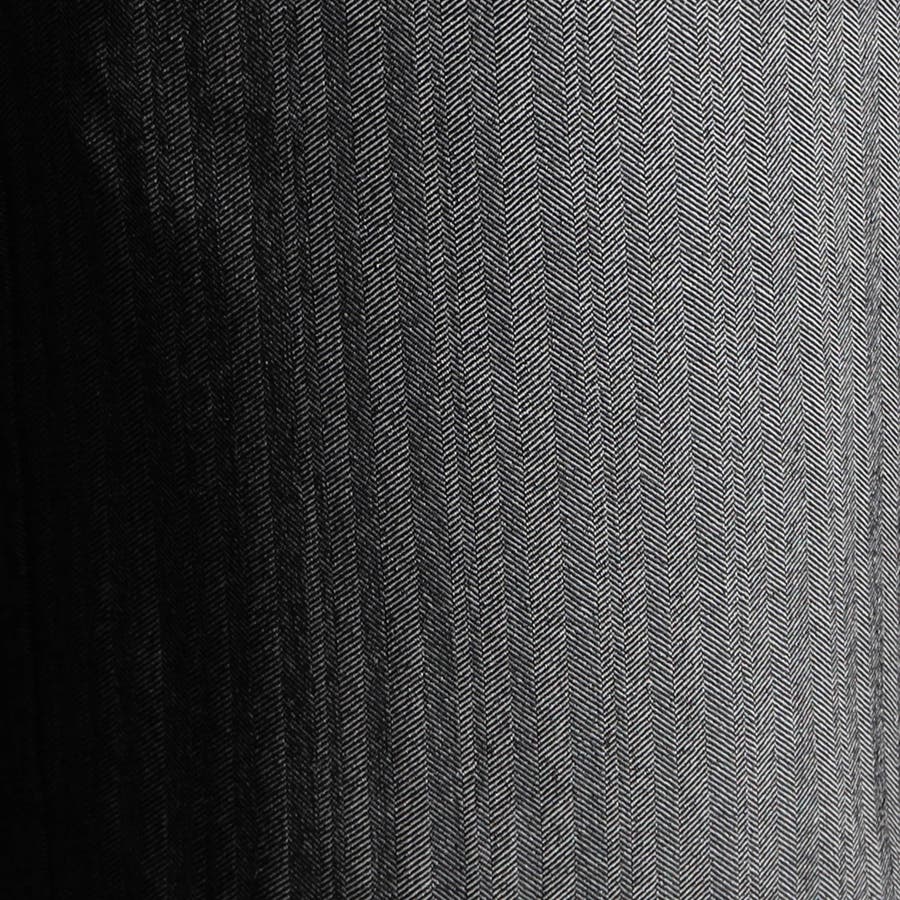吸湿性の高い再生繊維のレーヨン糸とプリッとしたコシを出すナイロン糸を使用したヘリンボン柄のハイパワーストレッチ素材がベース。生地の裏面を起毛加工し、仕上げでポリウレタンコーティング加工を施して光沢感をプラスしています。ポリウレタン混の良く伸びてキックバックが利いたストレッチ感は抜群、裏起毛した肌触りは暖かく、光沢感のある見栄えは高級感があります。09ホワイトは、白の経糸と黒の緯糸で交織したシャンブレー調の薄いライトグレーカラーです。49ブラックは、無地に見えるまっ黒です。67ネイビーは、白の経糸と濃紺の緯糸で交織したシャンブレー調の白勝ちに見えるネイビーカラーです。