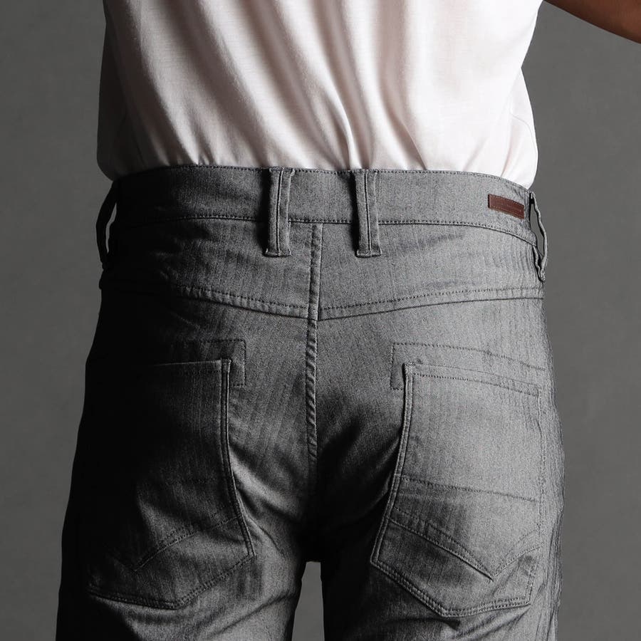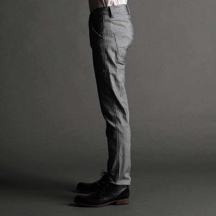 ウエストと腰周りは少しタイトめ調整し、裾口にかけて細くしたスキニーシルエットの細身の綺麗なラインです。股下はフルレングスなので裾上げして調整してくだ