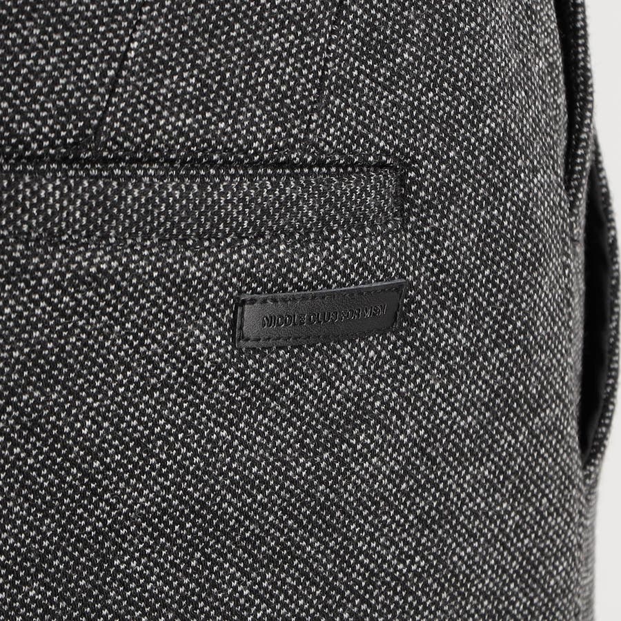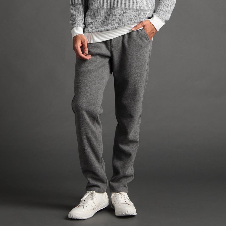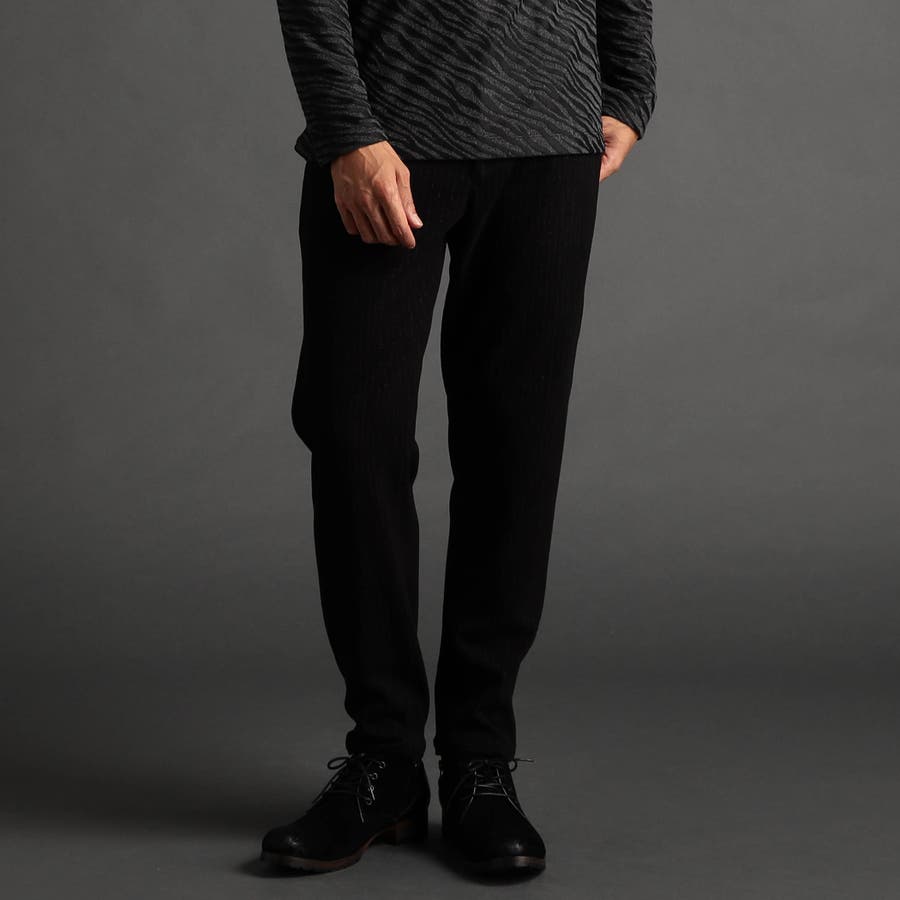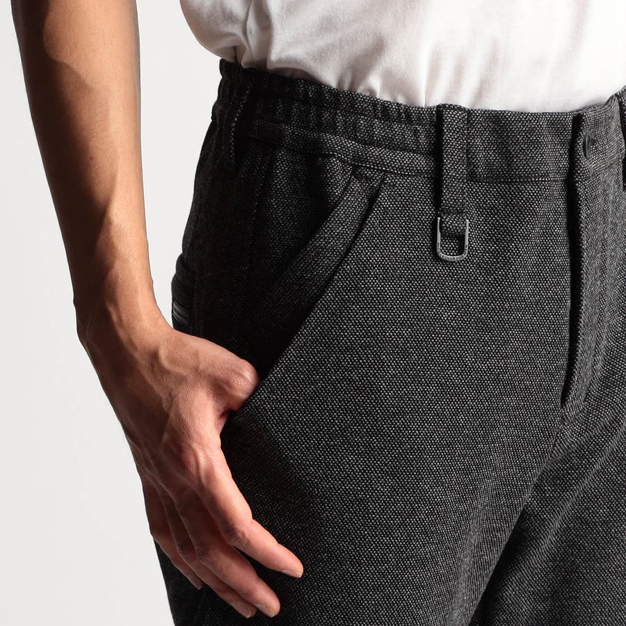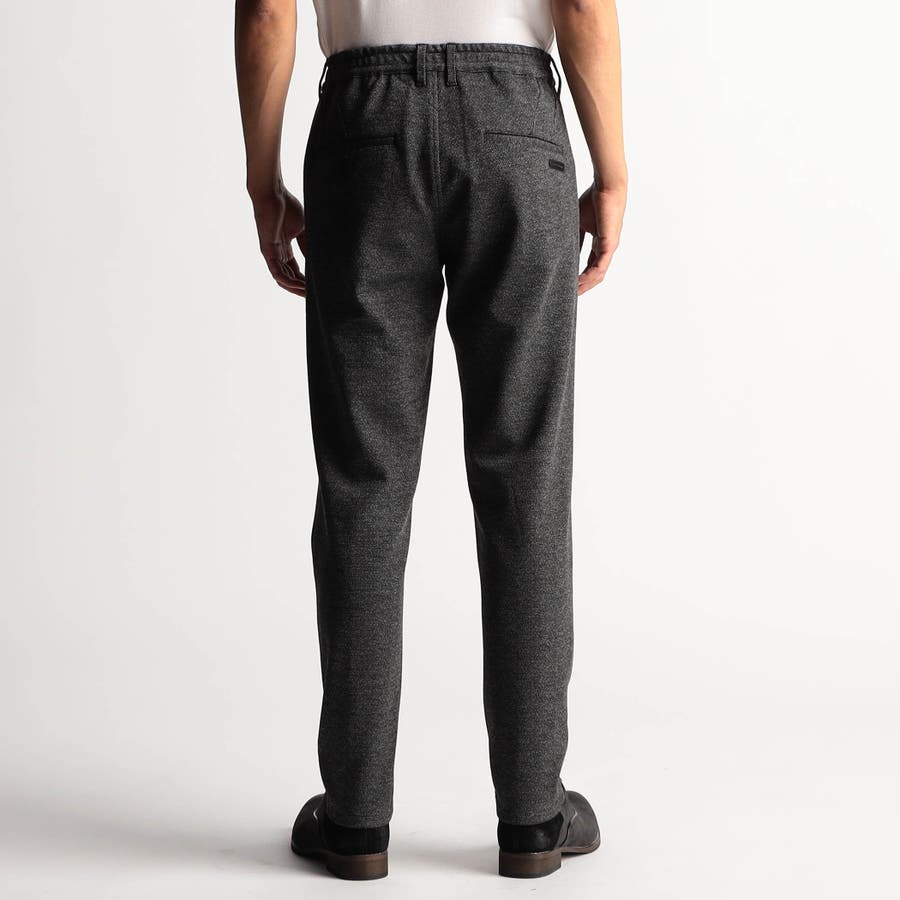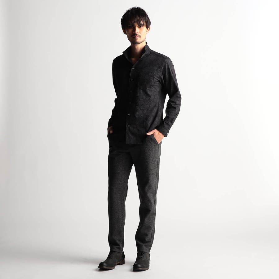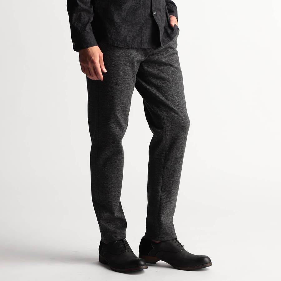 ジャカード織のカットソー素材。キックバックの効いた伸縮性と保形性があり、表面を微起毛加工しているのでウールパンツの様な高級感ある見え方です。地厚でしっかりした素材は、シワになりにくく、もっちりした張り感もあるのでシルエットを綺麗に見せます。素材の特性上、少し重たく感じますが、着用すると気になりません。29ライトグレー/39チャコールは、杢調に見えるオックス調の織柄。91その他2は、ランダムな掠れストライプ調の織柄です。