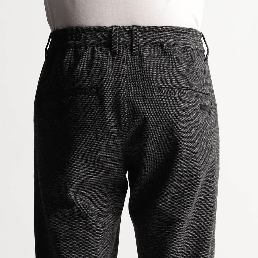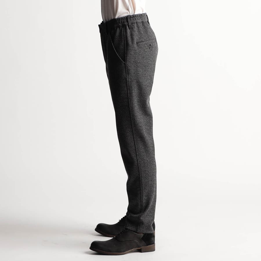 イージーパンツ仕様のスラックスデザイン。中はストレッチ裏地を使用して表地に追従する様に馴染みを良くしています。ジャージ素材なのでキックバックの利いたテンションを特徴に、細身のシャープなスリムテーパードシルエットです。前から見た時にスラックスの様にスッキリした見え方に仕上げにしています。