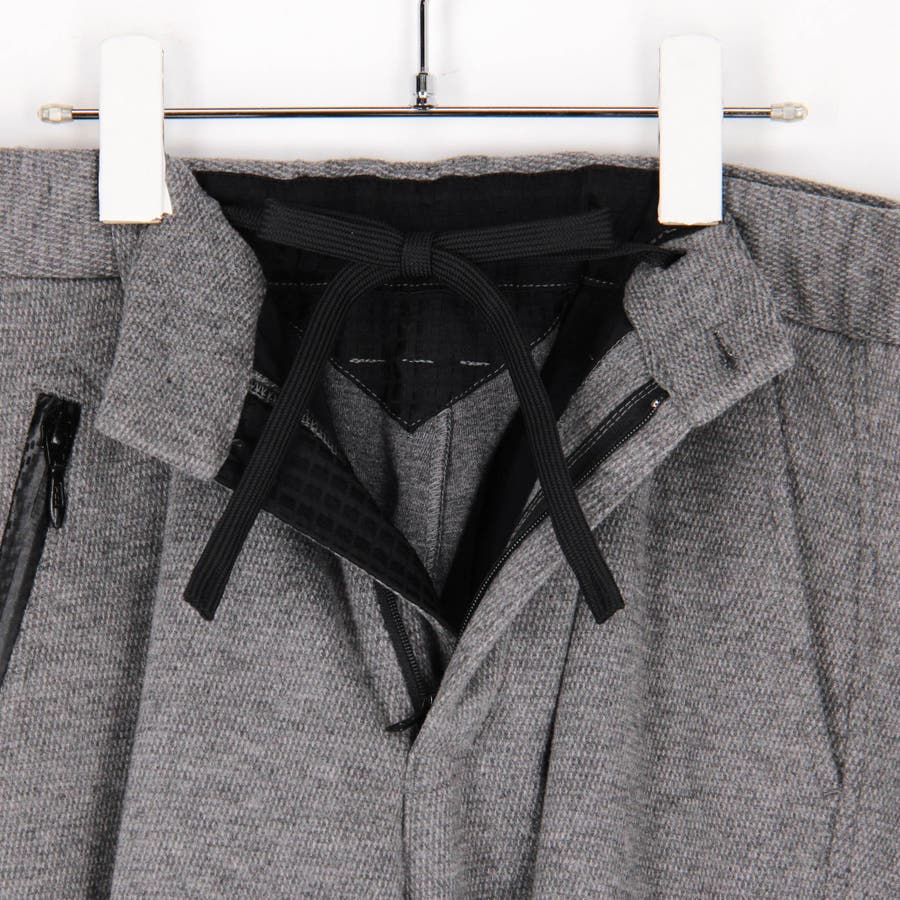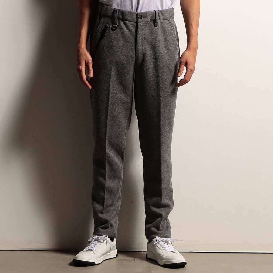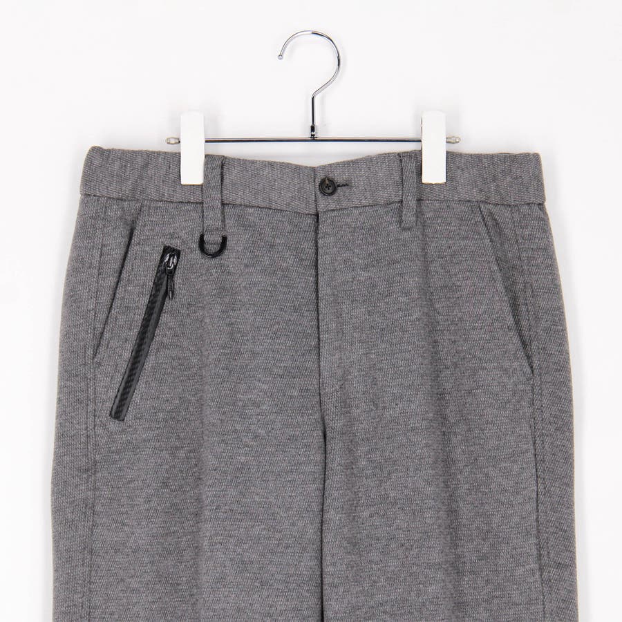 折山プレスを入れたスラックス風のイージーパンツ。ウールパンツの様な見え方で、良く伸び、防寒性に優れた穿き心地です。リエラボならではのバックスタイルにこだわった3本ループとオリジナル水牛調釦を使用した玉縁ポケット、右前にはカーボンプリントの止水ファスナーポケットを設け、少しスポーティーなイメージもプラス。裏の別布もストレッチ裏地を使用する事で馴染みを良くして、穿き心地を高めています。