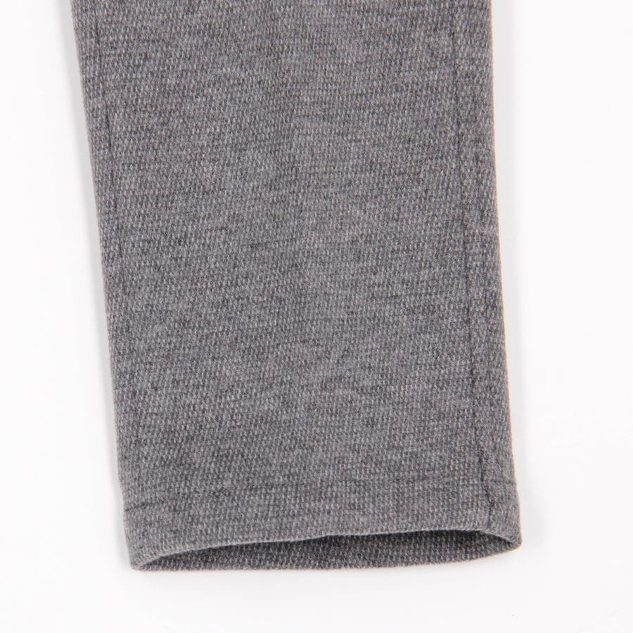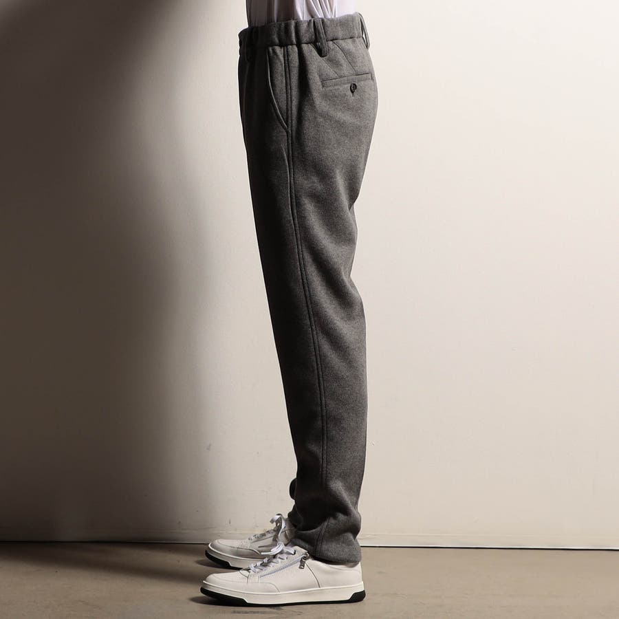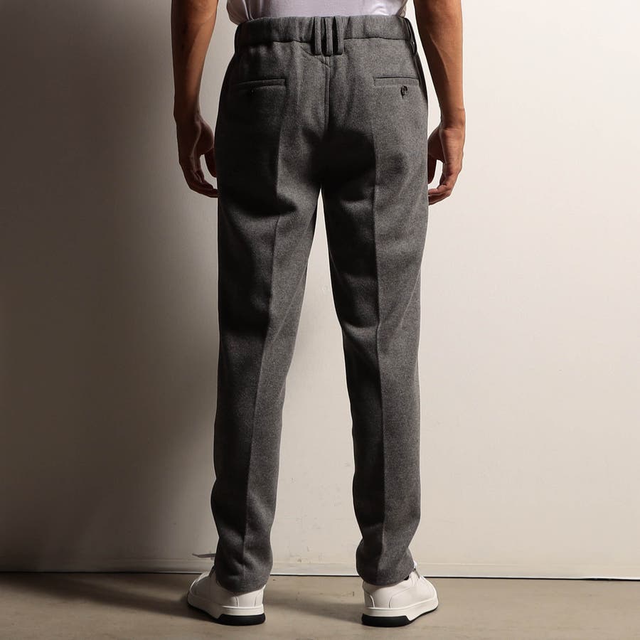 ウエストベルトには平ゴムとスピンドルを通していますのでサイズ調整しやすくしたイージーパンツ仕様。裾口に向けてテーパードした綺麗なシルエットのノータックパンツになります。股下は少し短めの9分丈設定です。
