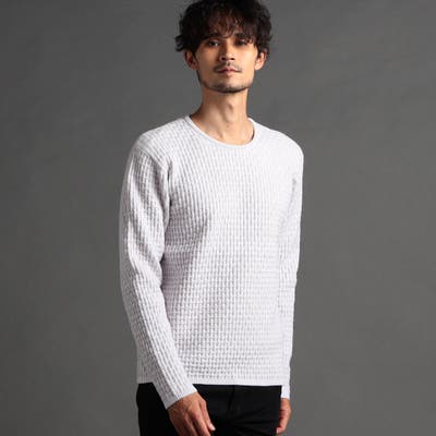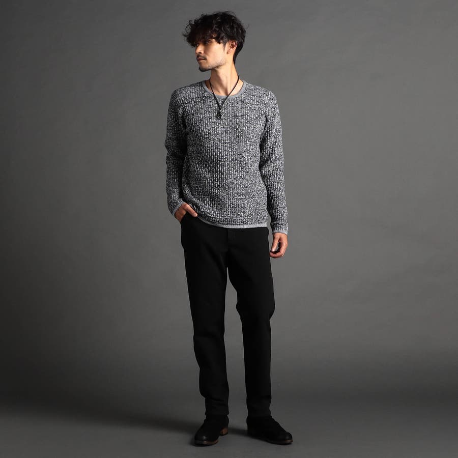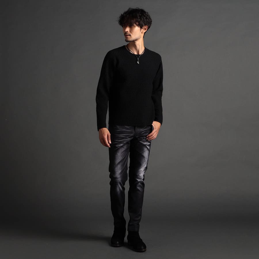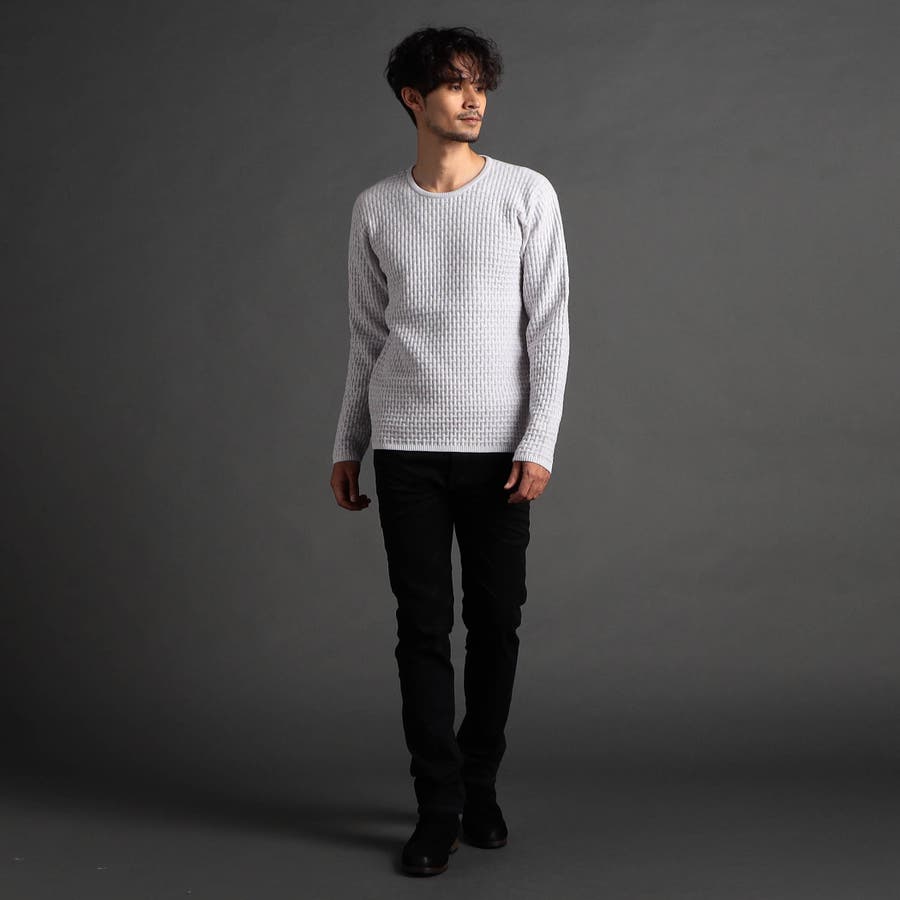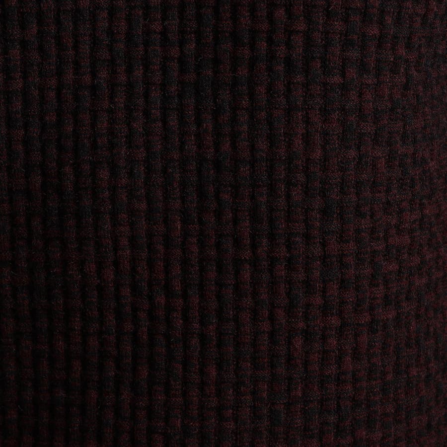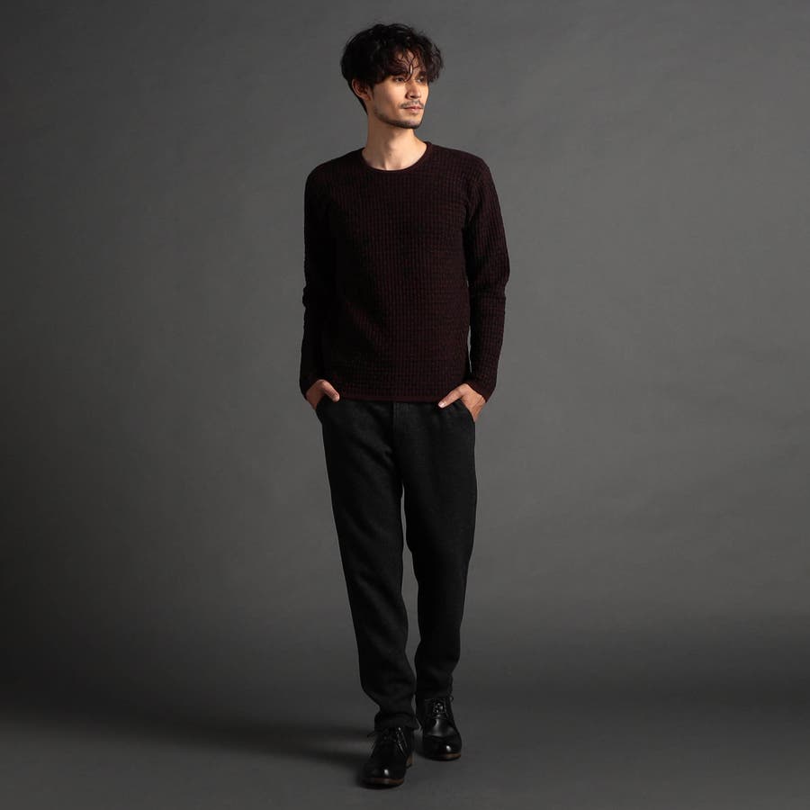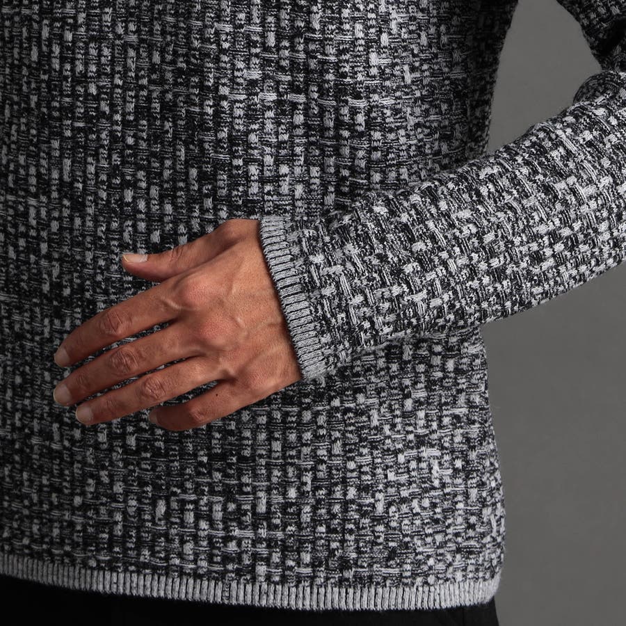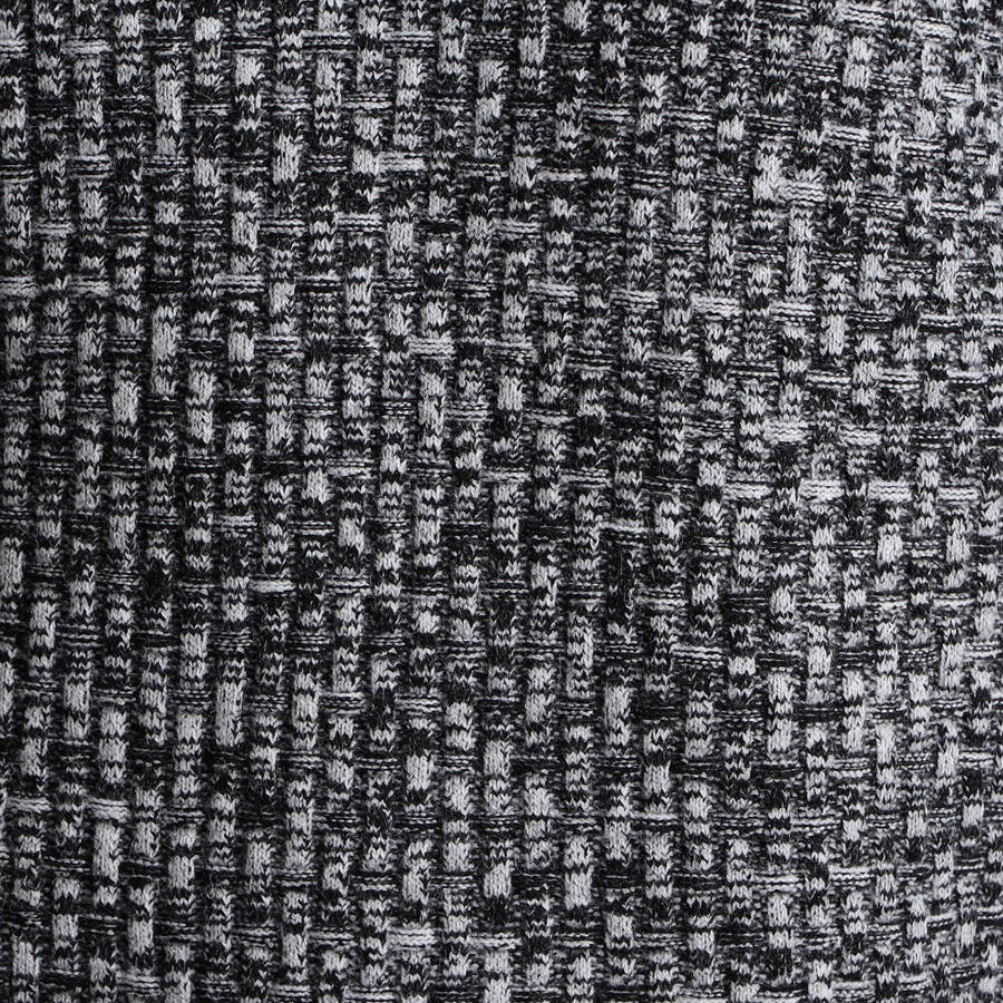 綺麗めな光沢感が特徴の三者混(アクリル・ポリエステル・ナイロン)の糸を使用し、一見特殊に見えるバスケット柄をリンクス編みで表現しています。大人っぽい地柄感が上質な仕上りでほどよい肉感と凹凸感がマルチに着回せるアイテムです。