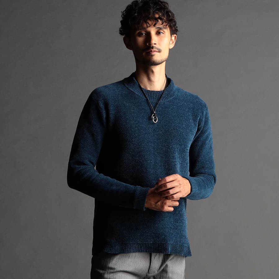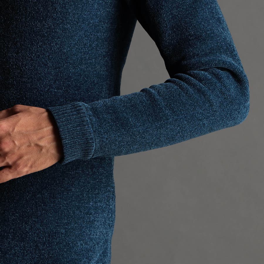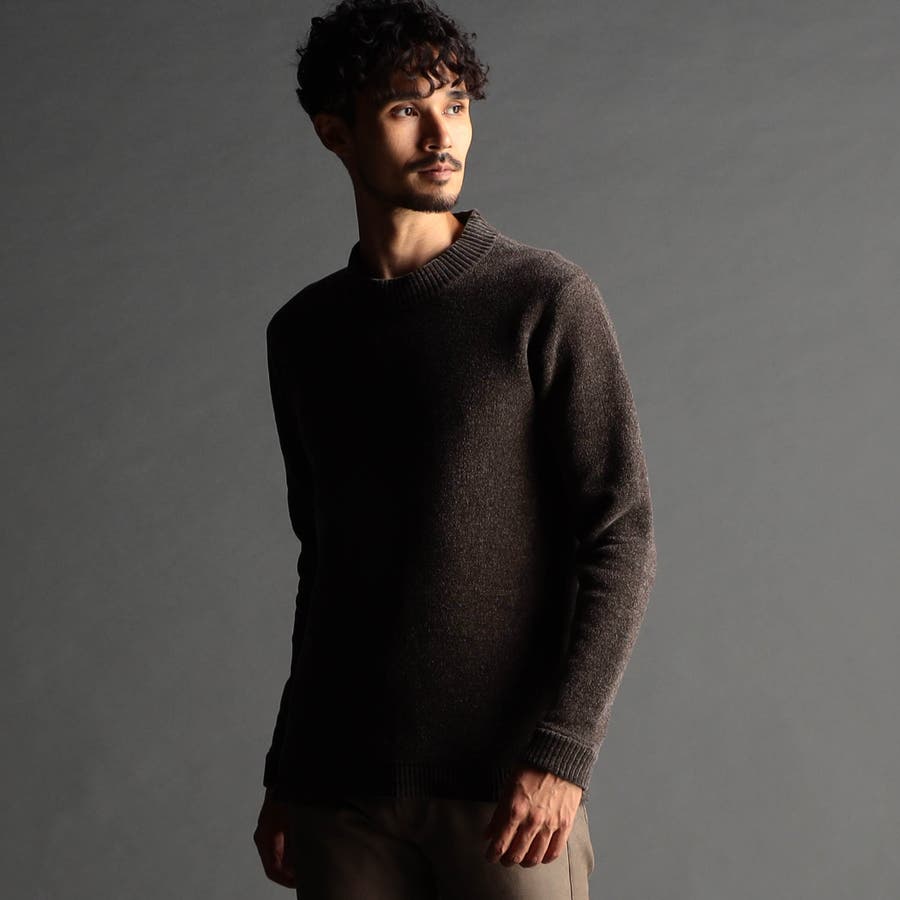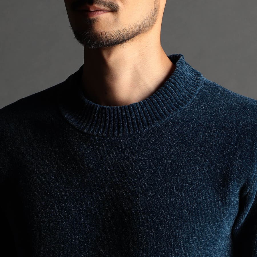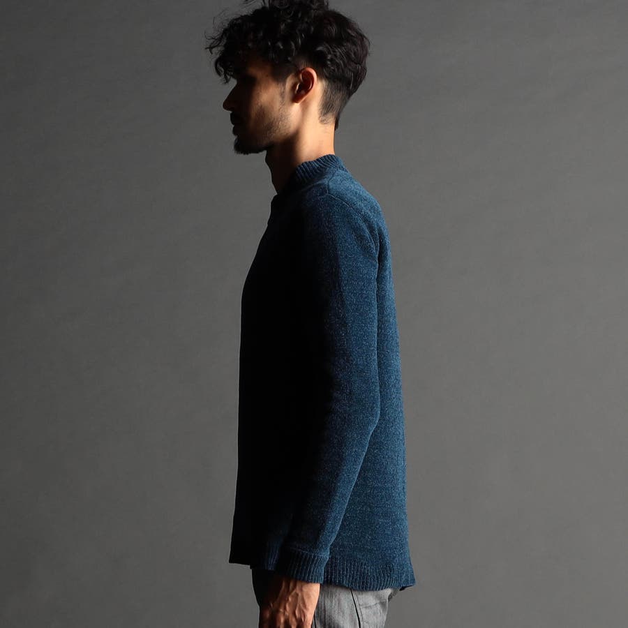 表面にモール糸を使用したWフェイス素材のモックネックニット。カフス、衿部分を総針リブにする事で全体の印象を引き締めています。