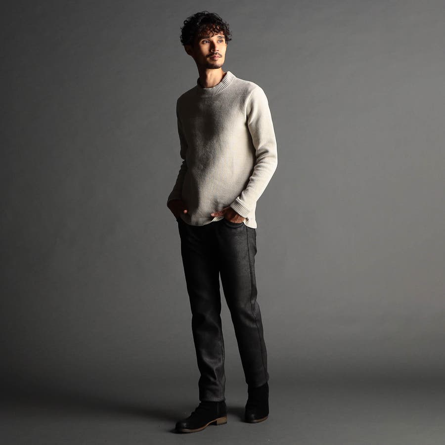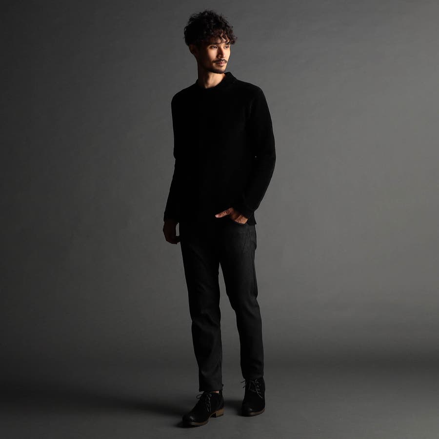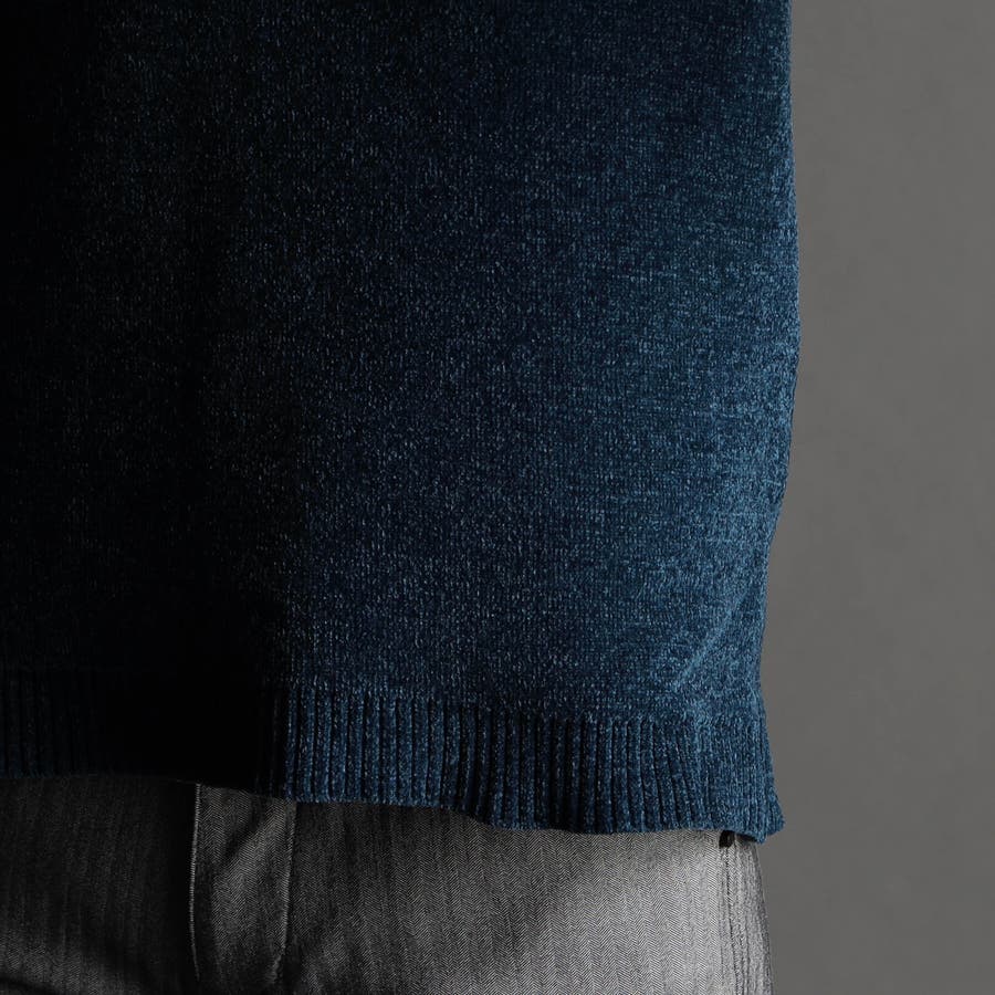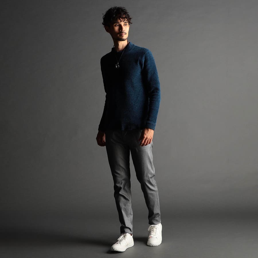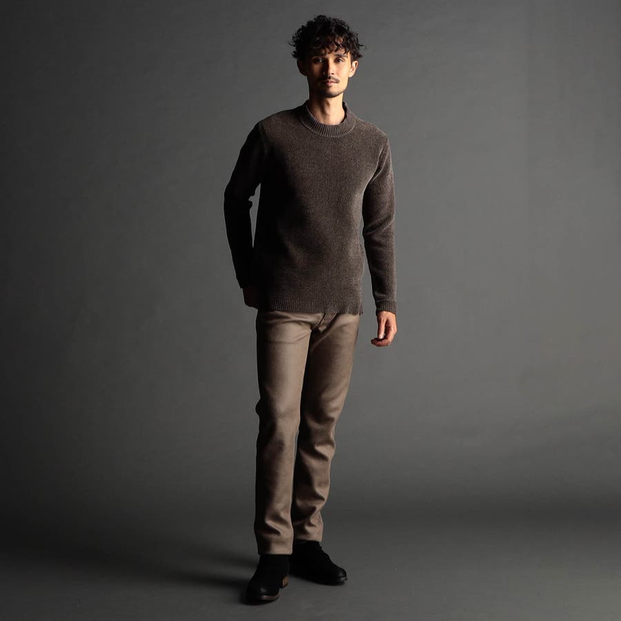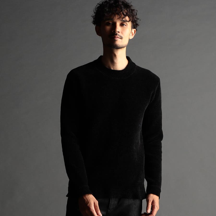 表面にモール糸を使用したWフェイス素材のモックネックニット。カフス、衿部分を総針リブにする事で全体の印象を引き締めています。