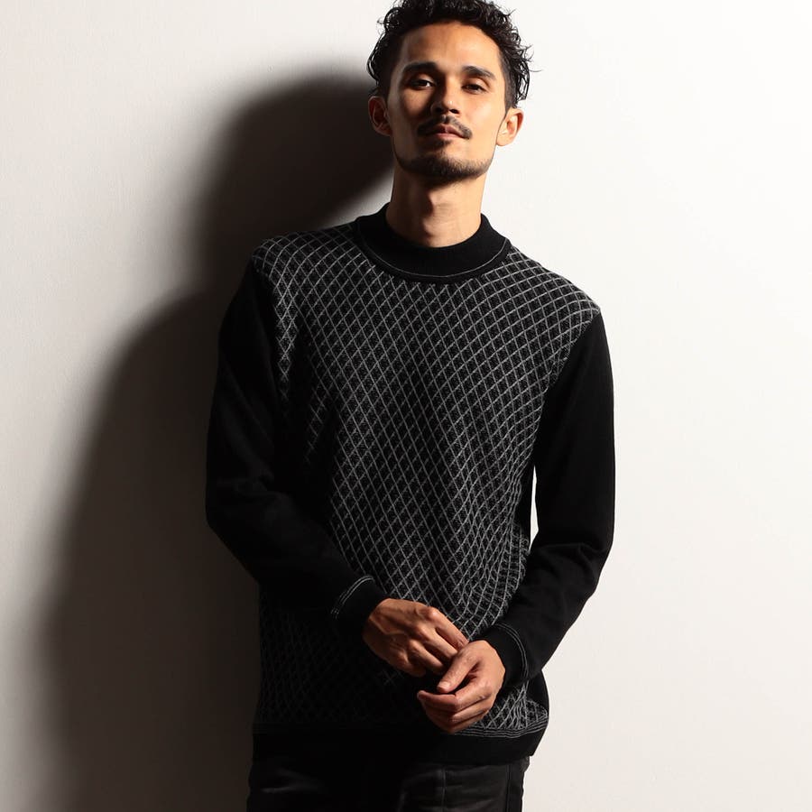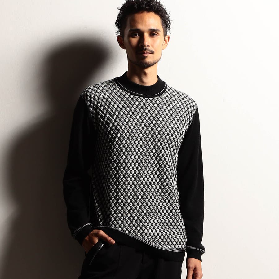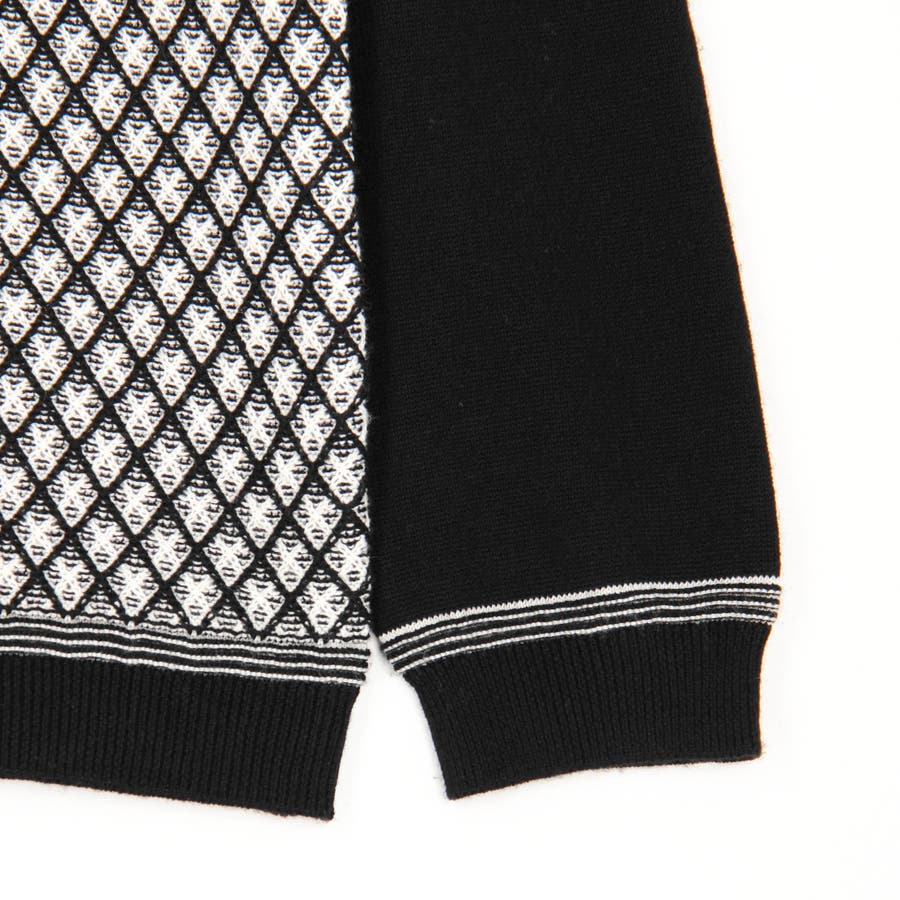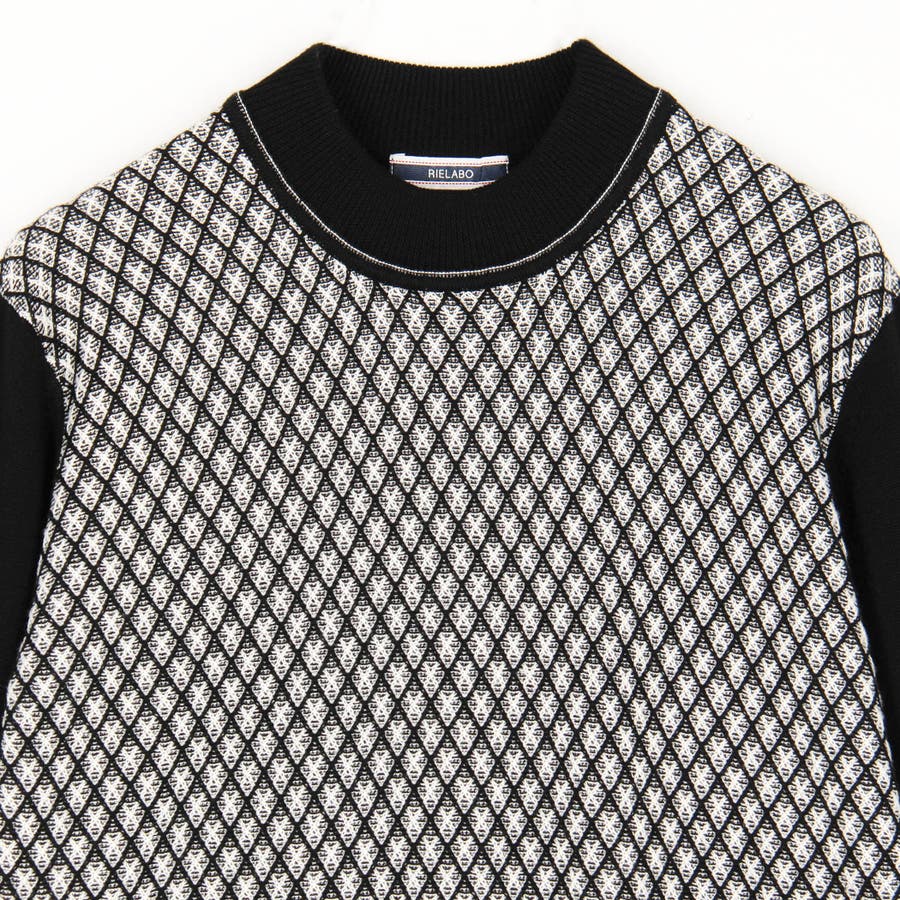 カットソー感覚で着られるモックネックプルオーバーニット。前身には細やかなリブ柄を立体的に組み合わせてダイヤ柄を表現しました。配色にすることで陰影感のある洗練された印象に仕上げました。衿付けと袖口、裾のリブ切り替え部分には配色ラインのリンクス編みを入れたニットらしい遊び心ある一着です。