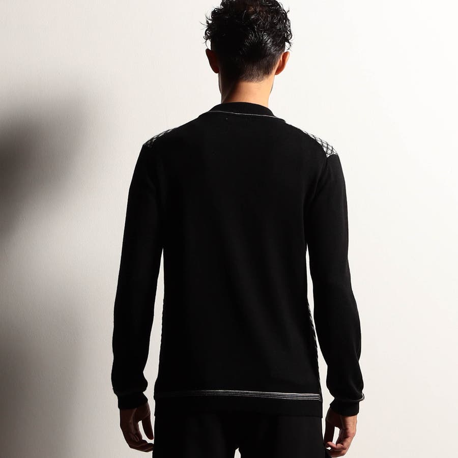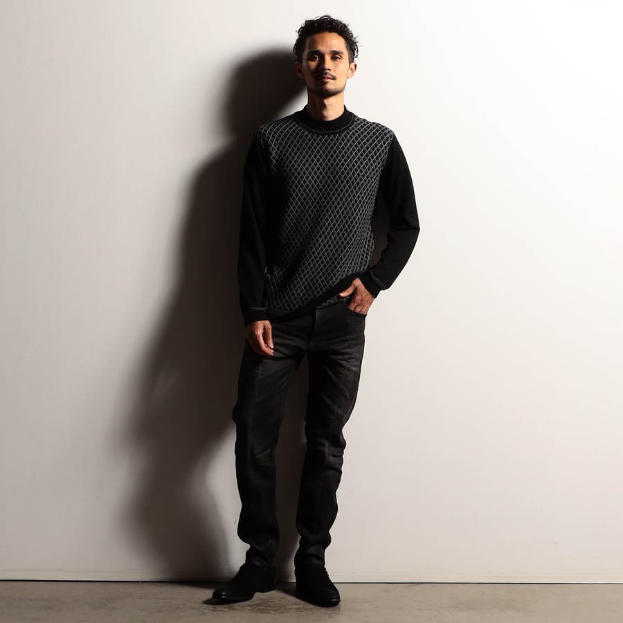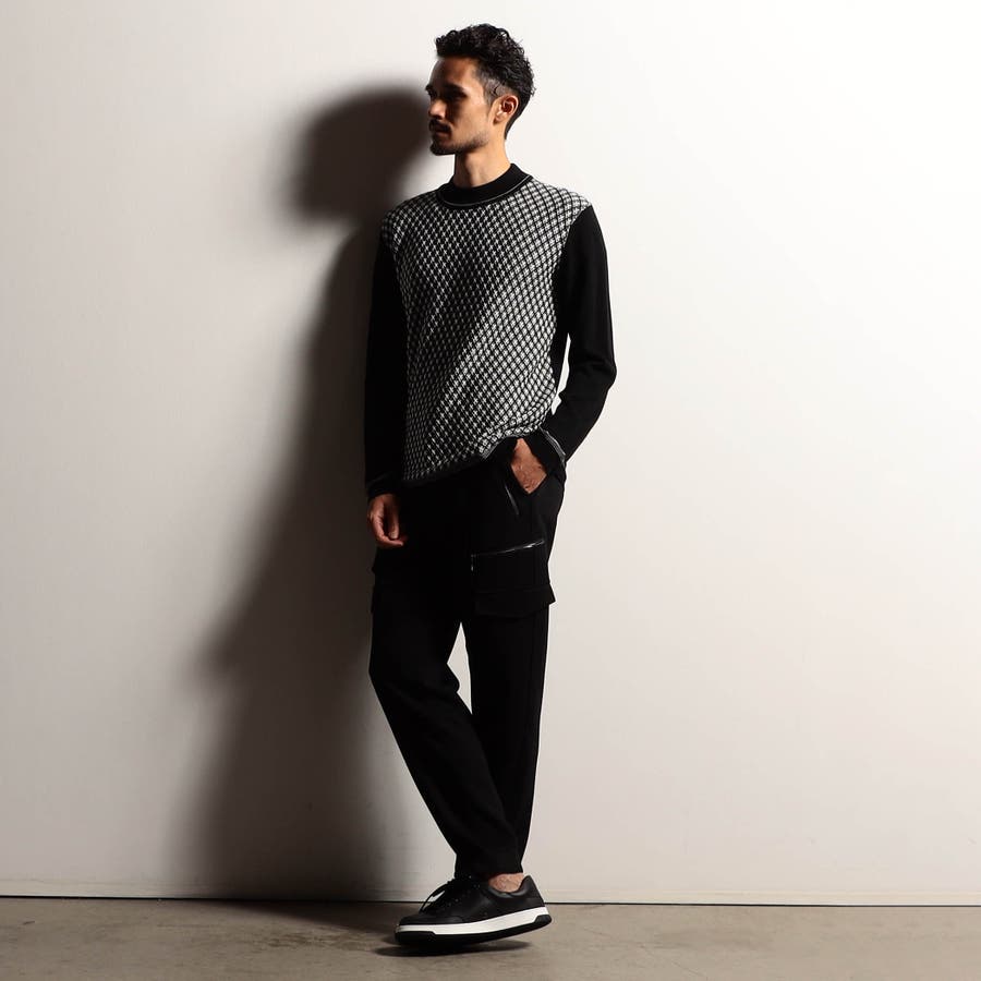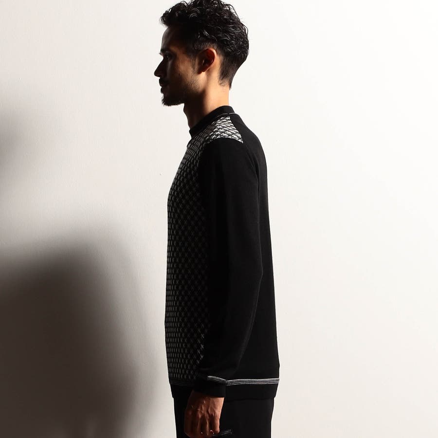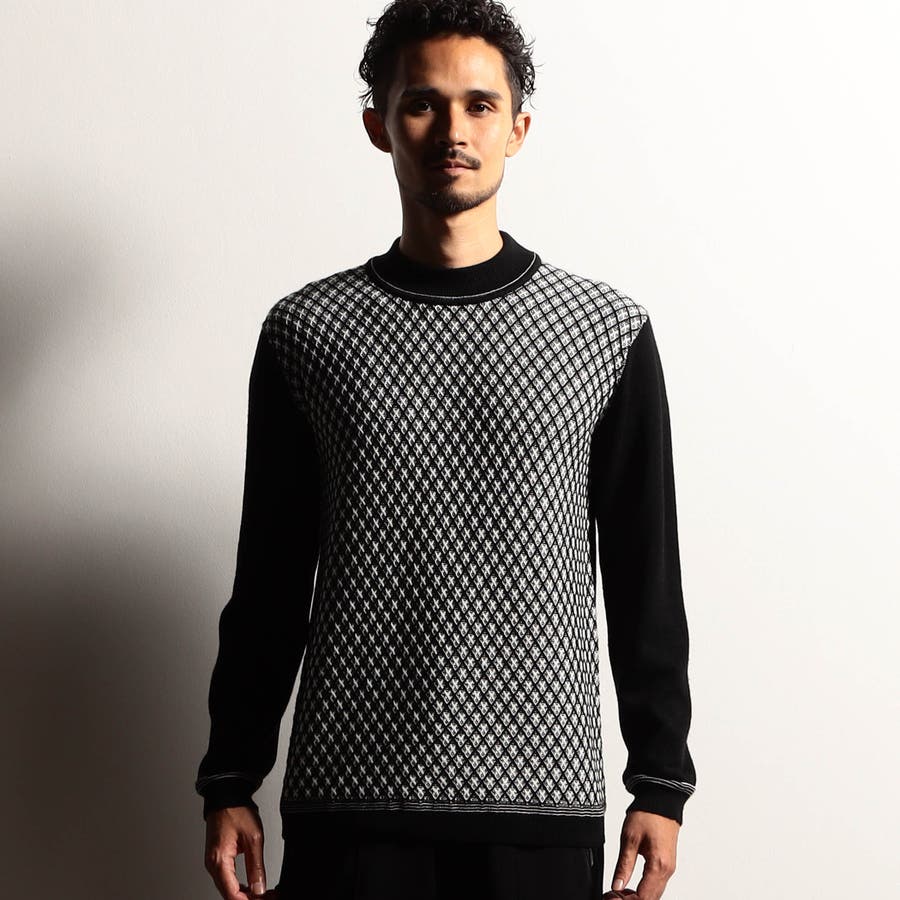 カットソー感覚で着られるモックネックプルオーバーニット。前身には細やかなリブ柄を立体的に組み合わせてダイヤ柄を表現しました。配色にすることで陰影感のある洗練された印象に仕上げました。衿付けと袖口、裾のリブ切り替え部分には配色ラインのリンクス編みを入れたニットらしい遊び心ある一着です。