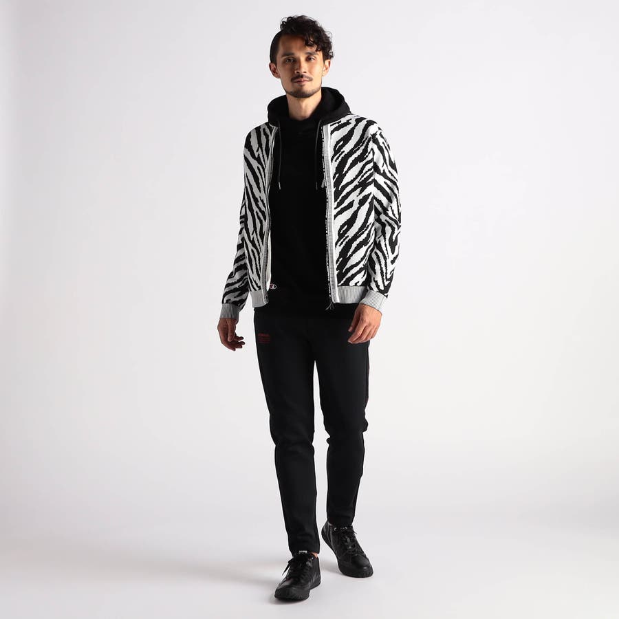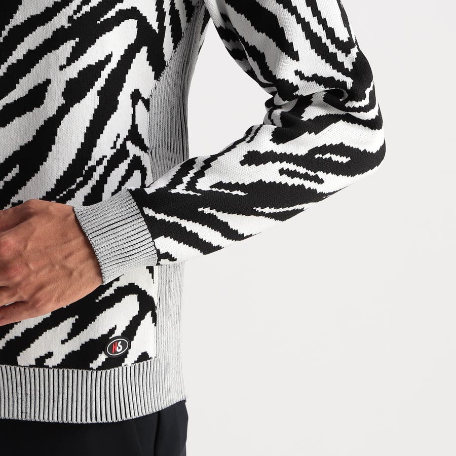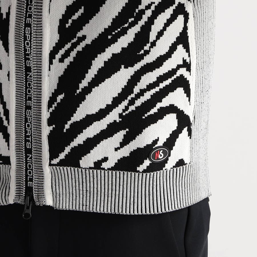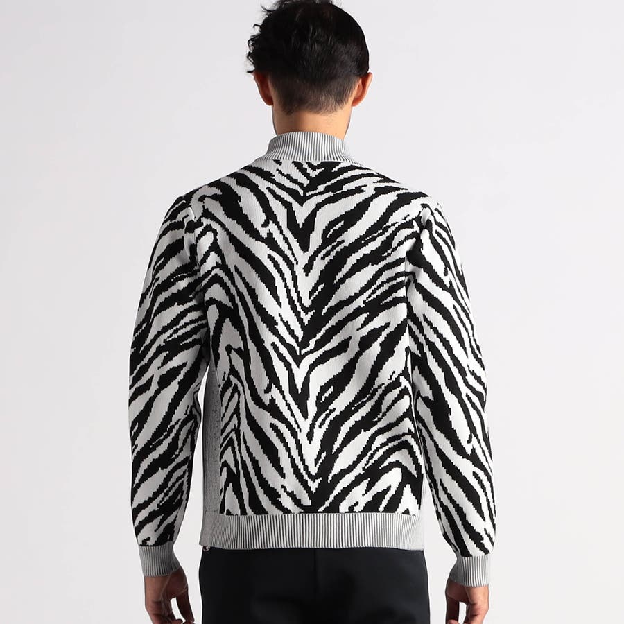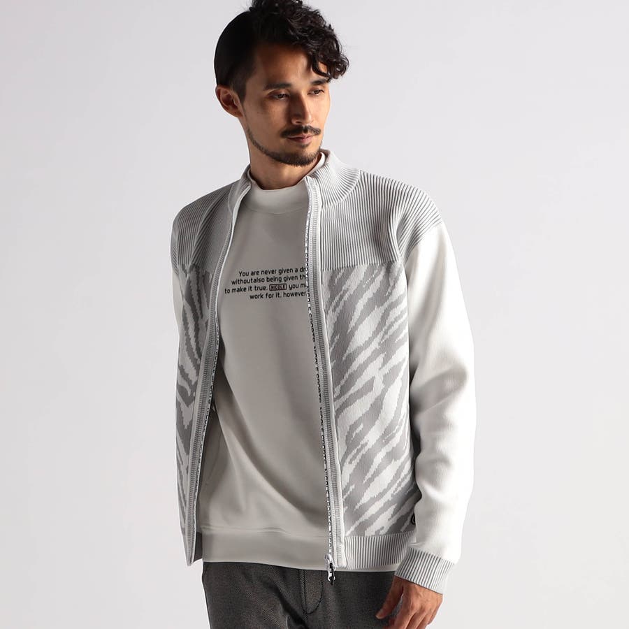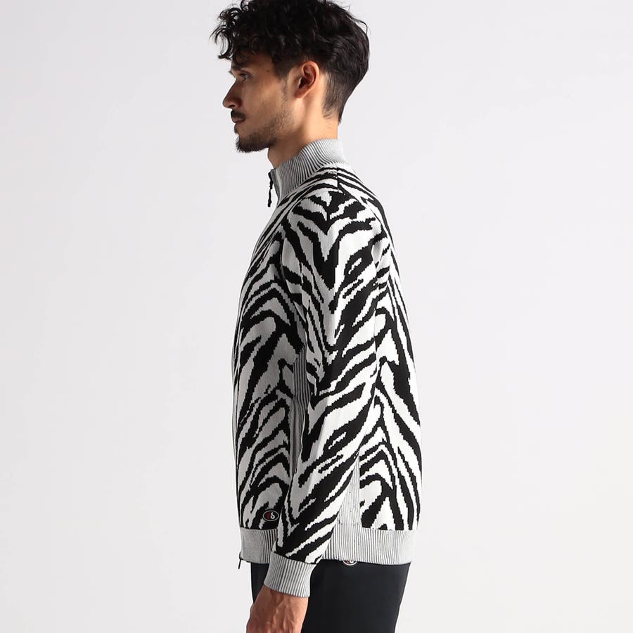 ハイゲ-ジ<12GG>で編み立てたゼブラ風ダブルジャカードのスタンドフルジップブルゾン。衿、肩まわり、細腹をプレーティングリブにすることで、引き締まったシャープな印象にしています。