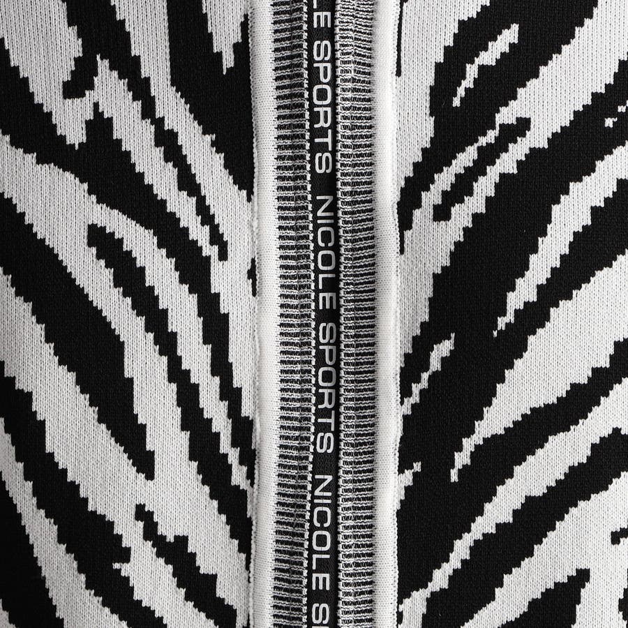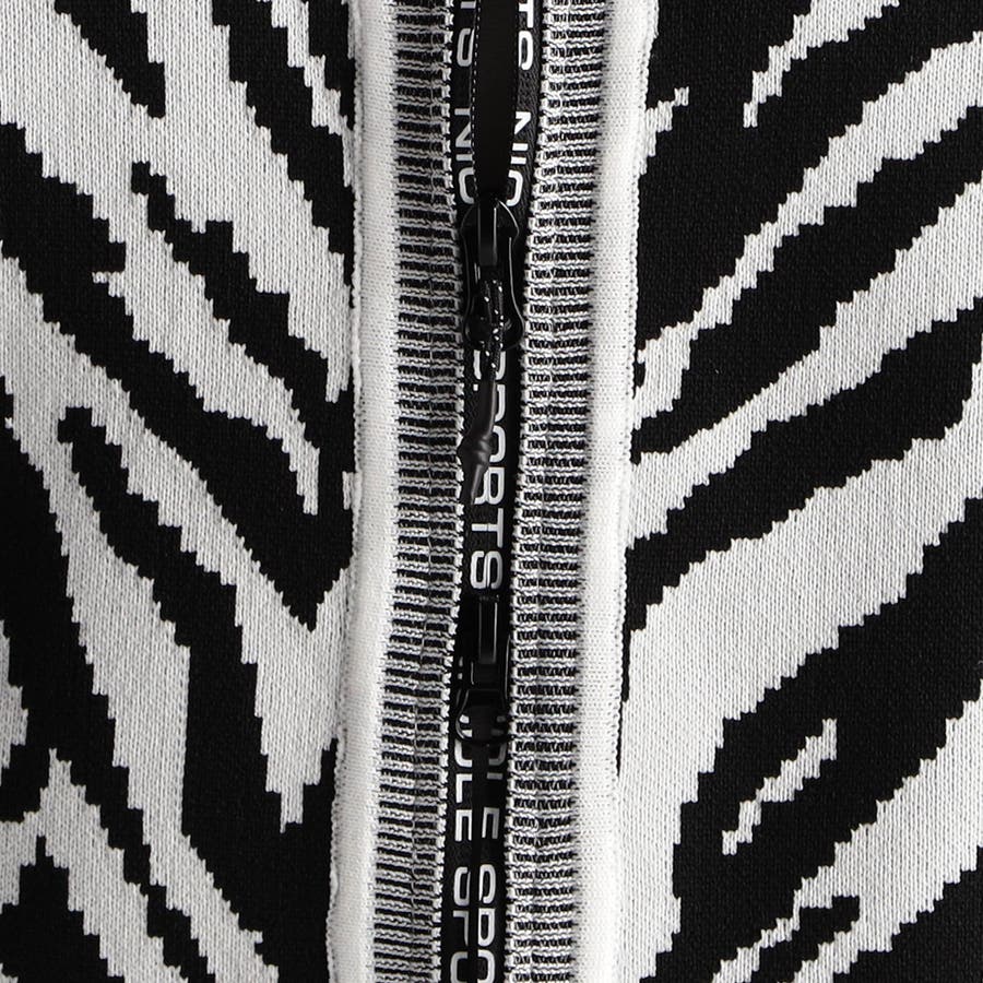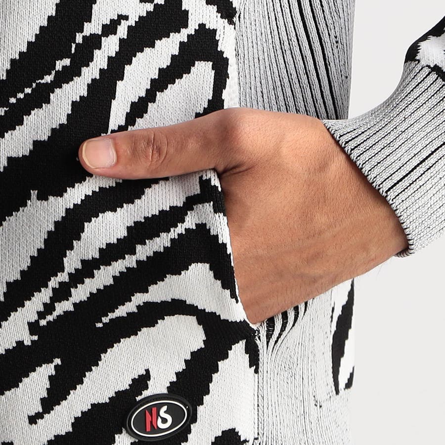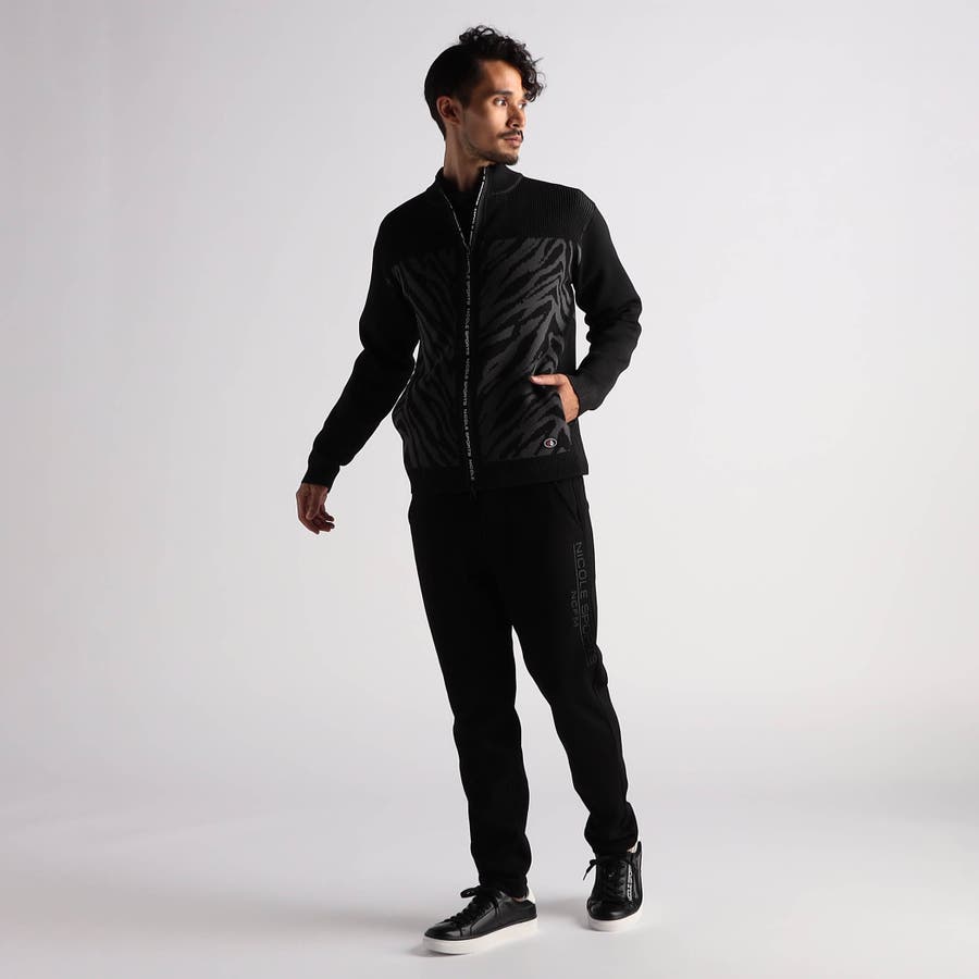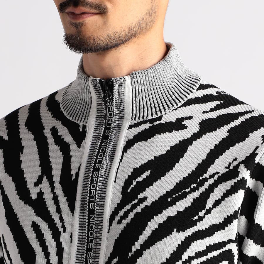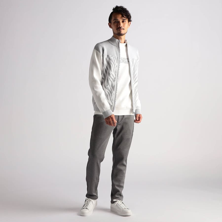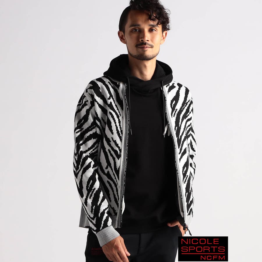 ハイゲ-ジ<12GG>で編み立てたゼブラ風ダブルジャカードのスタンドフルジップブルゾン。衿、肩まわり、細腹をプレーティングリブにすることで、引き締まったシャープな印象にしています。
