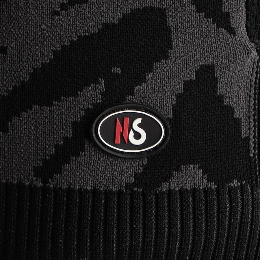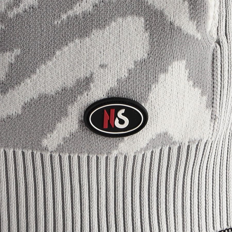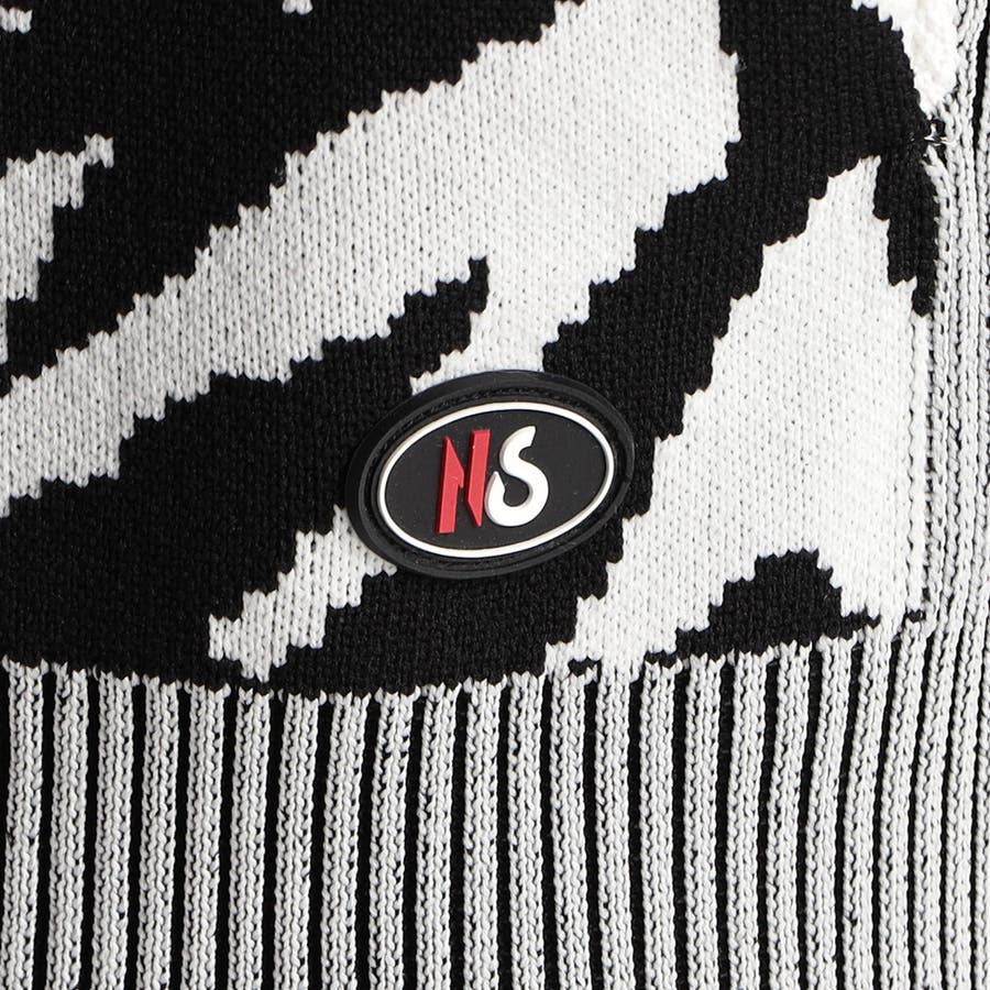 張りと艶、そして軽さを兼ね備えたポリエステル糸を使用。ハイゲージの綺麗な目面のゼブラ風ダブルジャカードでキックバック良く編まれています。肌触りの良い風合いでストレスフリーな着心地です。