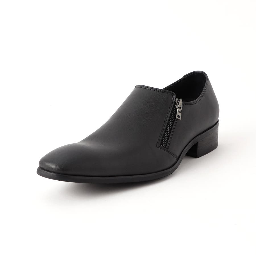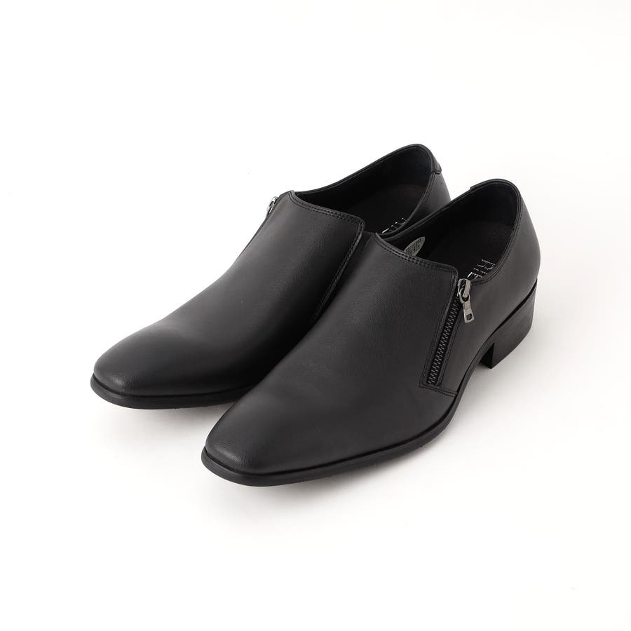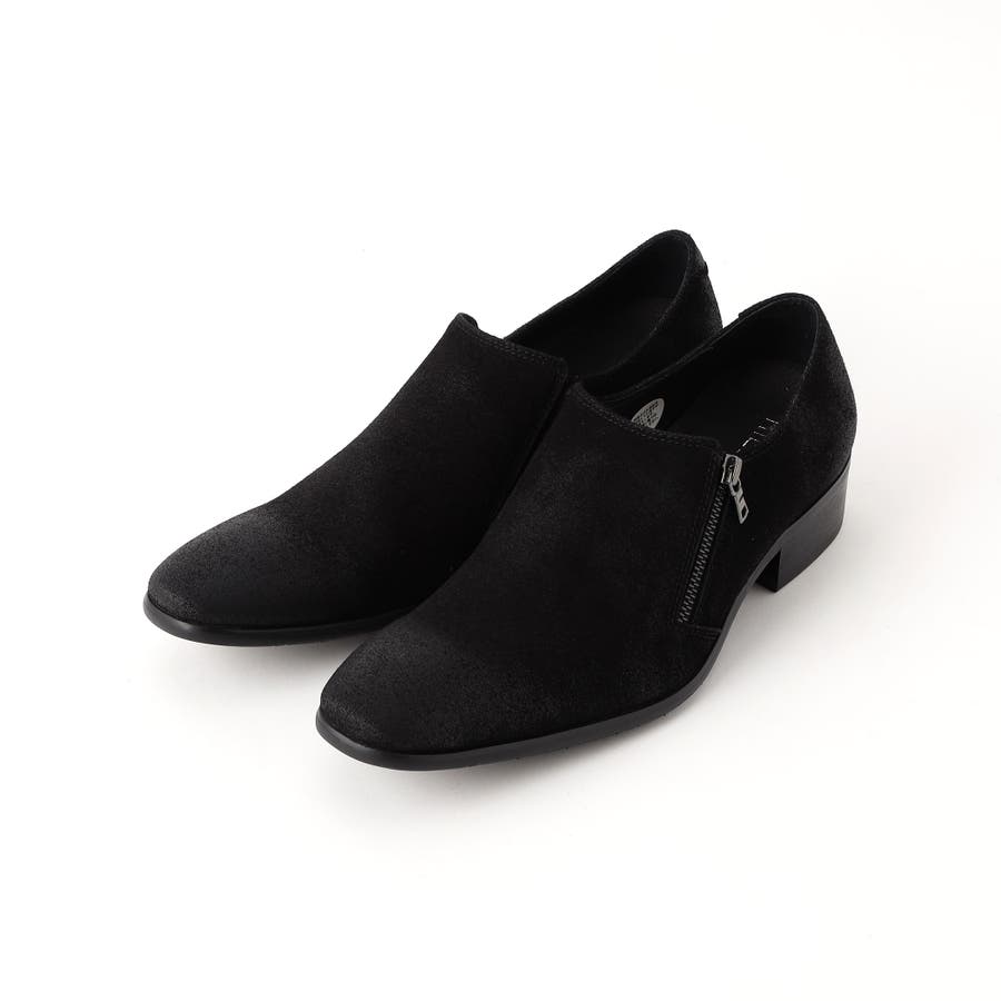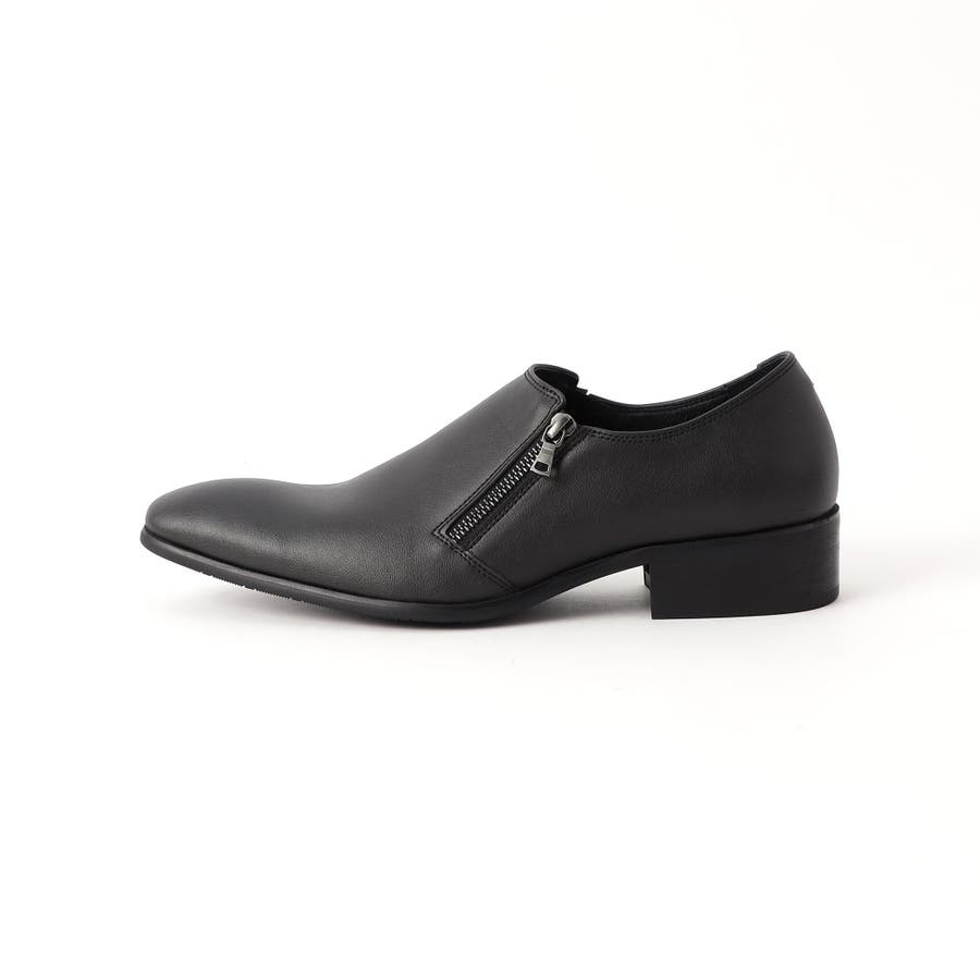 独特なシャープなラストのスリッポンシューズ。少し細長く、トゥスプリングの利いた木型(ラスト)をベースに、ブーツに使われる高いヒールのソールを採用し、サイドファスナー仕様で履きやすく、大人モードなシューズに仕上げています。履き口のラインもこだわって作っています。