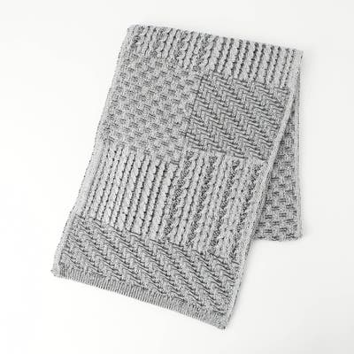 綿タッチポリエステル糸2本とレギュラーポリエステル糸4本を使用し、異なる編地を切り替えたブロックパーツをプレーティングで表現しています。二重編みのしっかりとした張り感と、ボリュームのある立体感が特徴。ポリエステル糸の発色の良さが上質感をプラスしています。