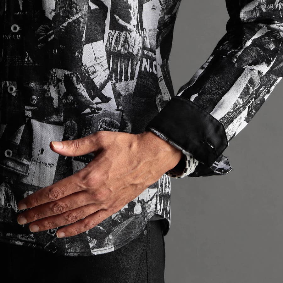 衿端にワイヤ-を仕込んだスタンド、イタリアンカラ-シャツ。カフス裏やヨーク裏には黒の無地裏地を使用、袖口には配色釦を付けてアクセントになる様にしています。