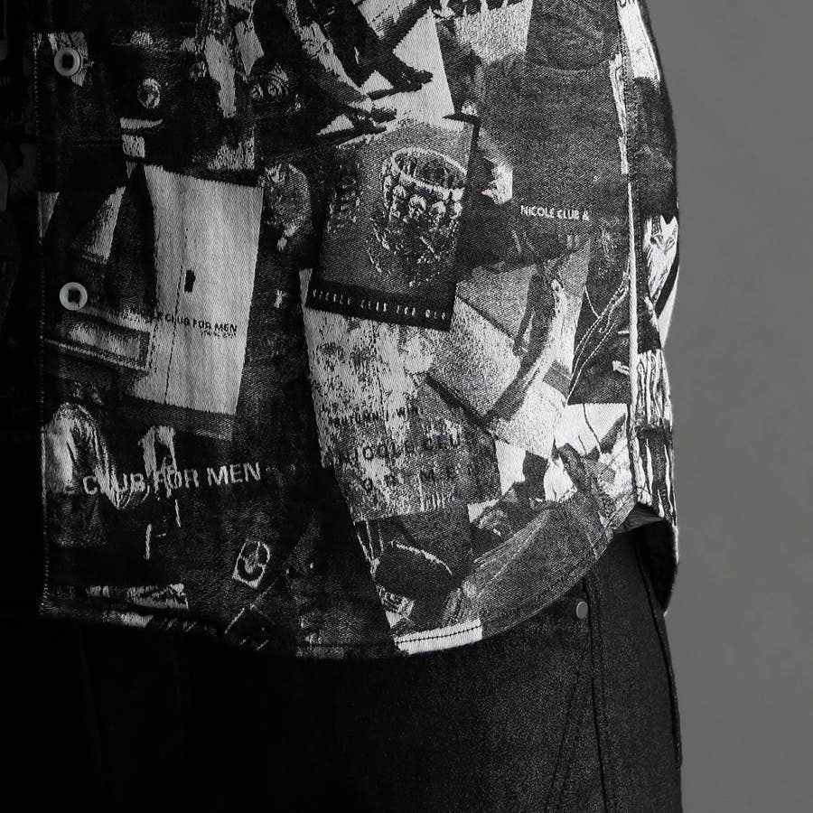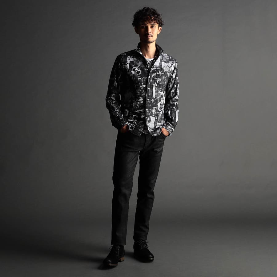 国内は兵庫県西脇で作られたオリジナル素材。過去のカタログ写真をコラージュした画像をそのまま生地に落とし込みました。プリントでは無く、織りで表現したスペシャルな生地です。大正6年創業100年以上の実績がある西脇織物業界でも一級品のジャカード織布工場で製織しています。経糸の総本数は6000本以上、緻密で繊細な柄表現は産地でも数台のコンピュータージャカード機でしか作れません。経糸はコンパクトヤーン50/1の白を使用、緯糸は黒糸を高密度で打ち込み、2色表現でありながらも、いくつもの組織を組み合わせ濃淡で立体的な柄を表現しています。織物は経糸、緯糸の上がり、下がりのみで柄を作り出す為、紋作成の工程があり、職人による柄(紋紙)の作成には知識と経験がないと製織出来ませんので重要な工程になります。プレーンな織物に比べ、製織出来る量も3分の1程度しか織れない為、非常に時間がかかります。熟練の職人がジャカード織機を用い、糸に1本1本心を込め、丁寧に織り上げた生地になります。
