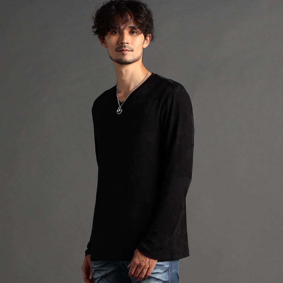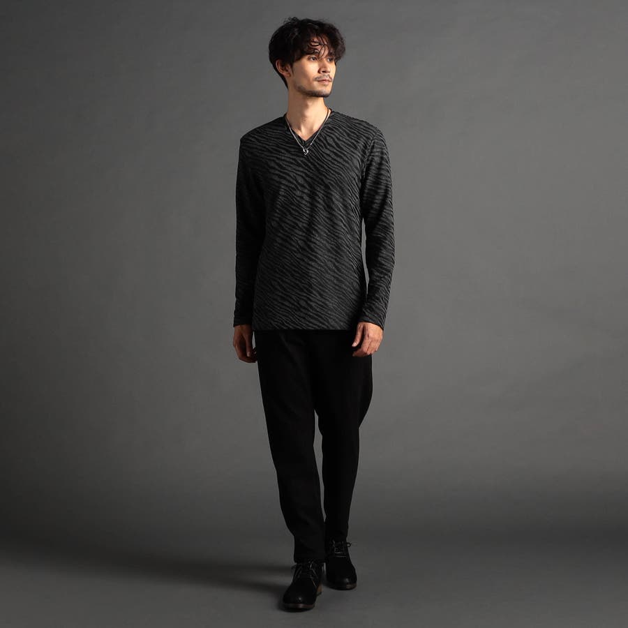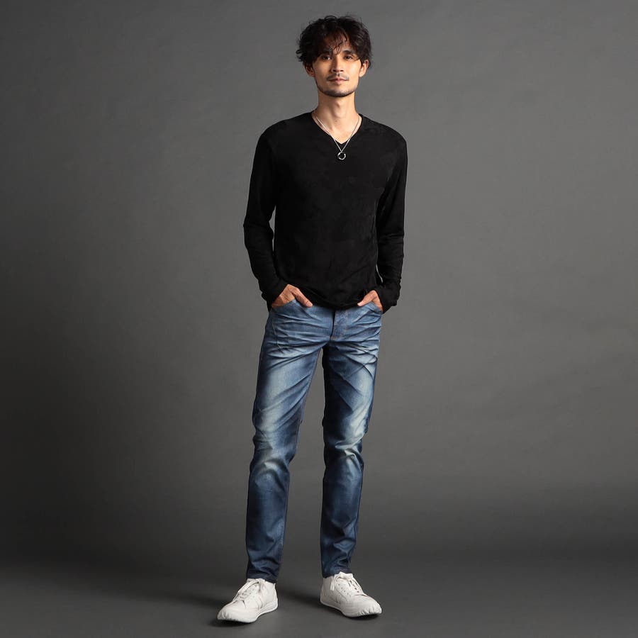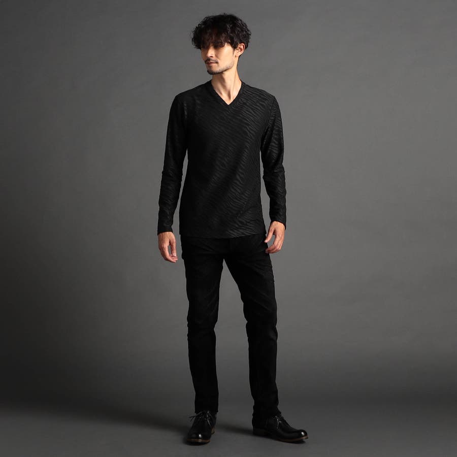 艶っぽい素材感にマッチしたシンプルなVネック。やや細身のシャープなシルエットで展開します。