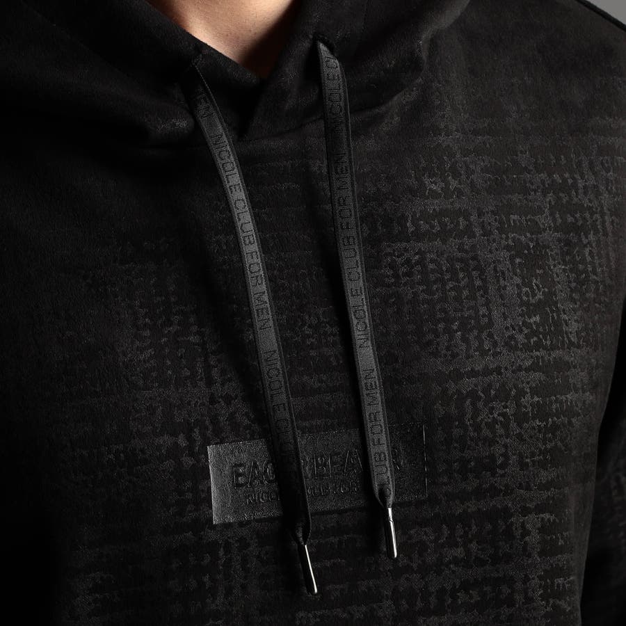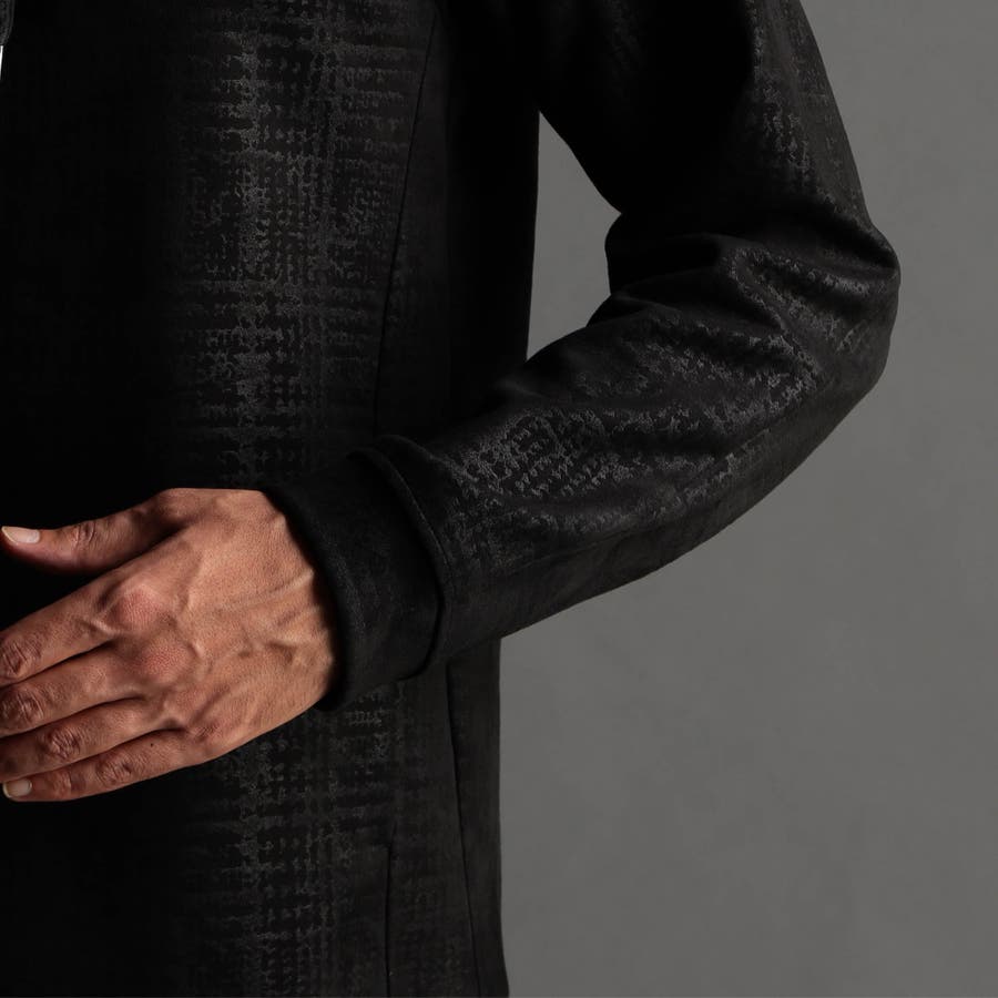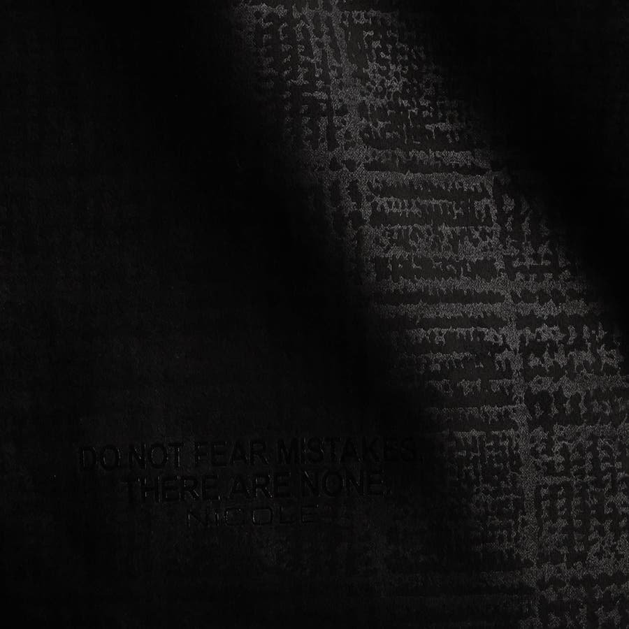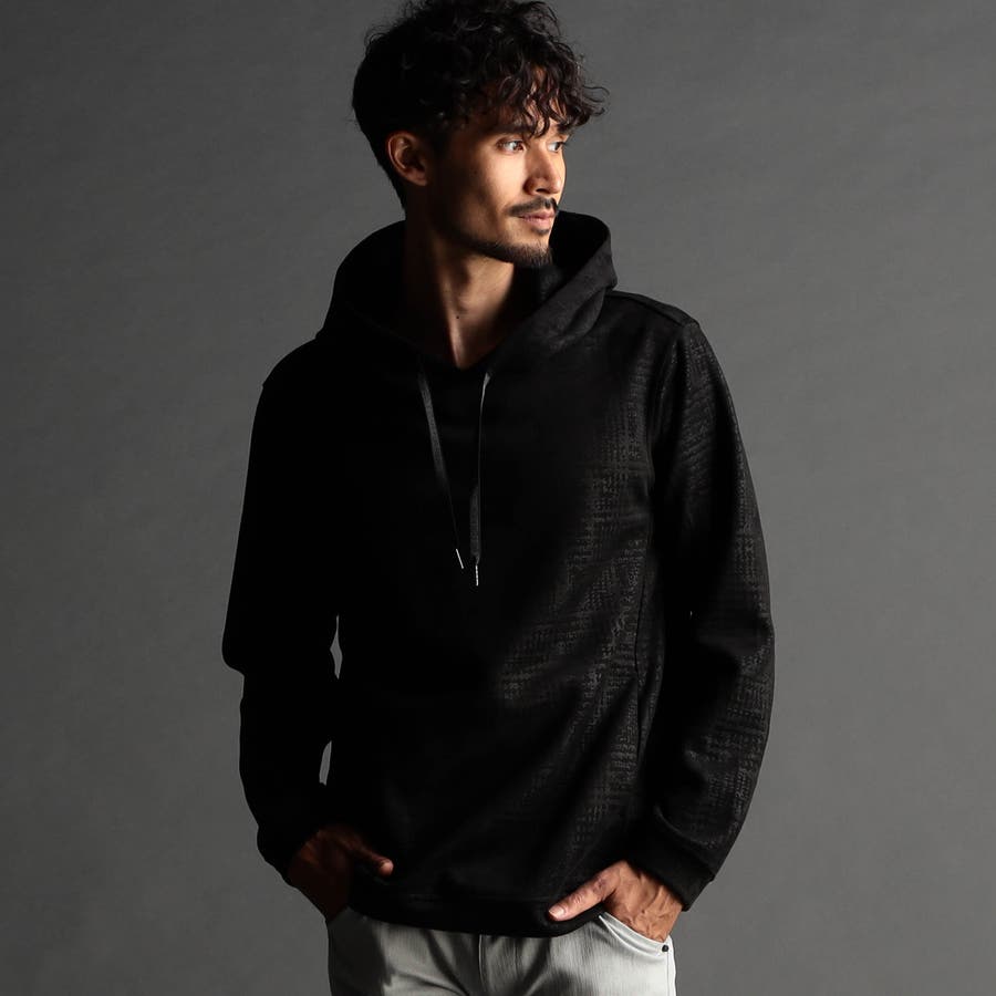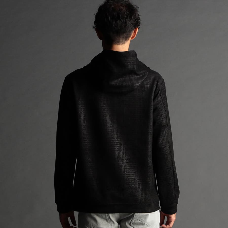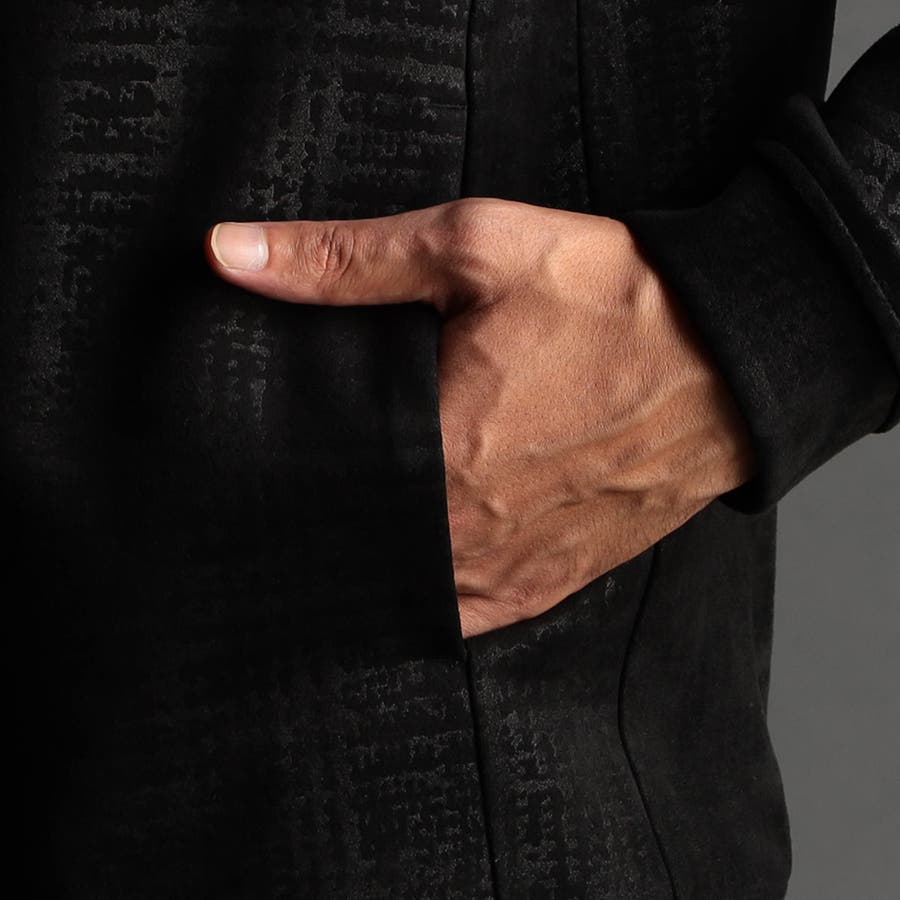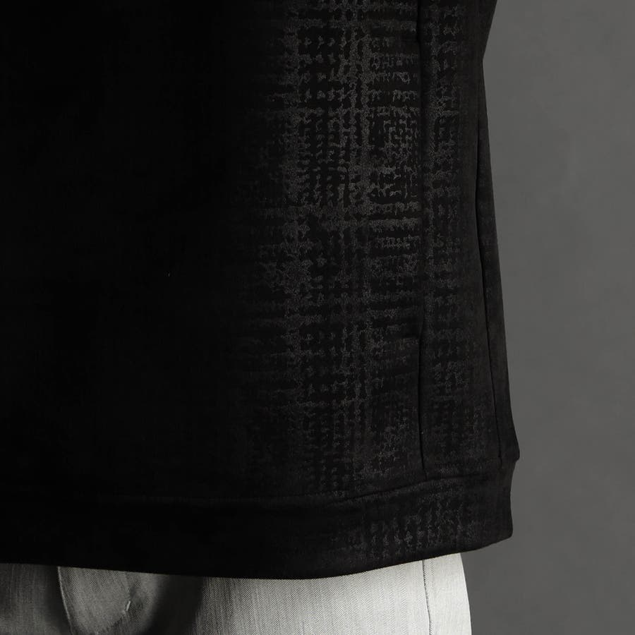ポリエステルのマイクロファイバーで編まれたポンチ素材の表面をスウェード起毛加工を施したカットソー素材です。滑らかなタッチとソフト風合いを特徴に、程良い軽さとストレッチ性、ジャージ素材なのではのプリッとした横張り感がエアリーなシルエットを作ります。49ブラックには、掠れたムラ調のチェック柄を生地プリントする事で、ただの黒無地より素材感を出しています。