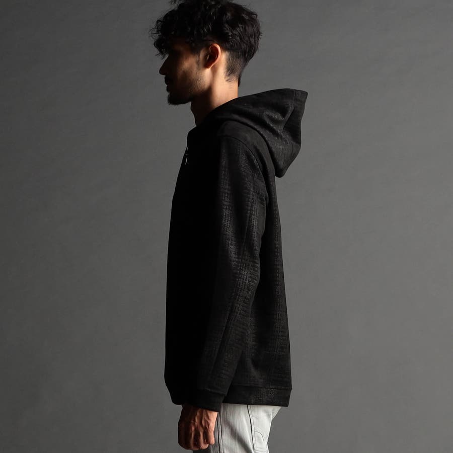 細腹をとる事で立体的な綺麗なシルエットのプルオーバーパーカー。袖も2枚接ぎで綺麗に見え、普通のパーカーとは一線を画すモ-ドテイストに仕上げています。ロゴ入りのジャカードテープをフードスピンドルに採用し、切替を活かしたシームポケットはスッキリしたデザインに仕上げています。前身と後身頃に透明シリコンプリントを施して、同色系の落ち着いた配色に見せながら光沢感でアクセントになる様にしています。冬はコートの下に着用しても着ぶくれしないスッキリしたシルエットです。製品で撥水加工を施して防汚効果をつけています。