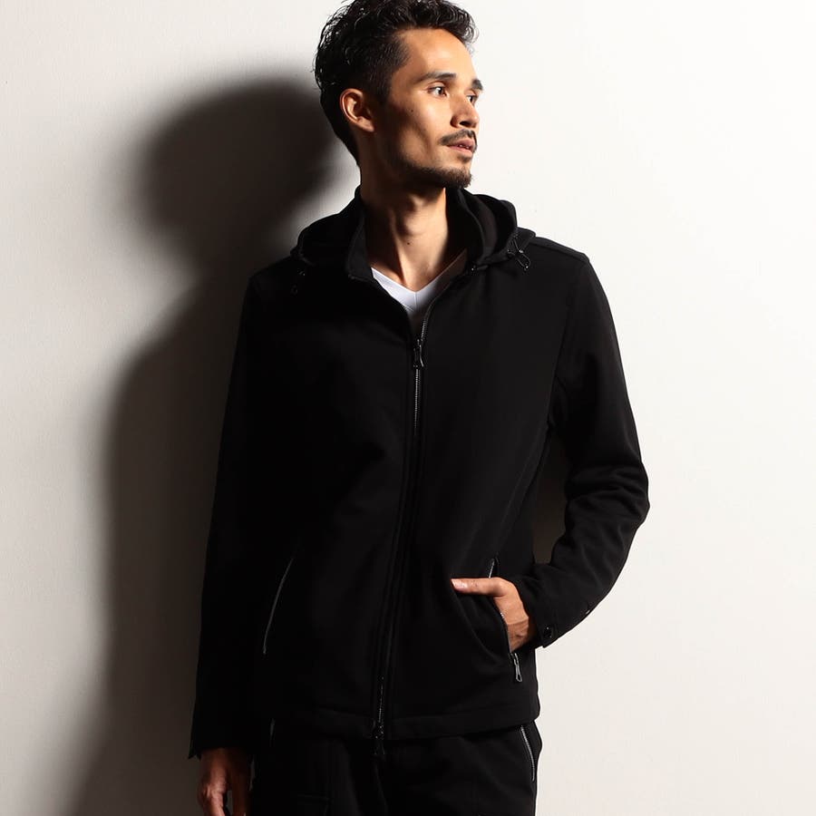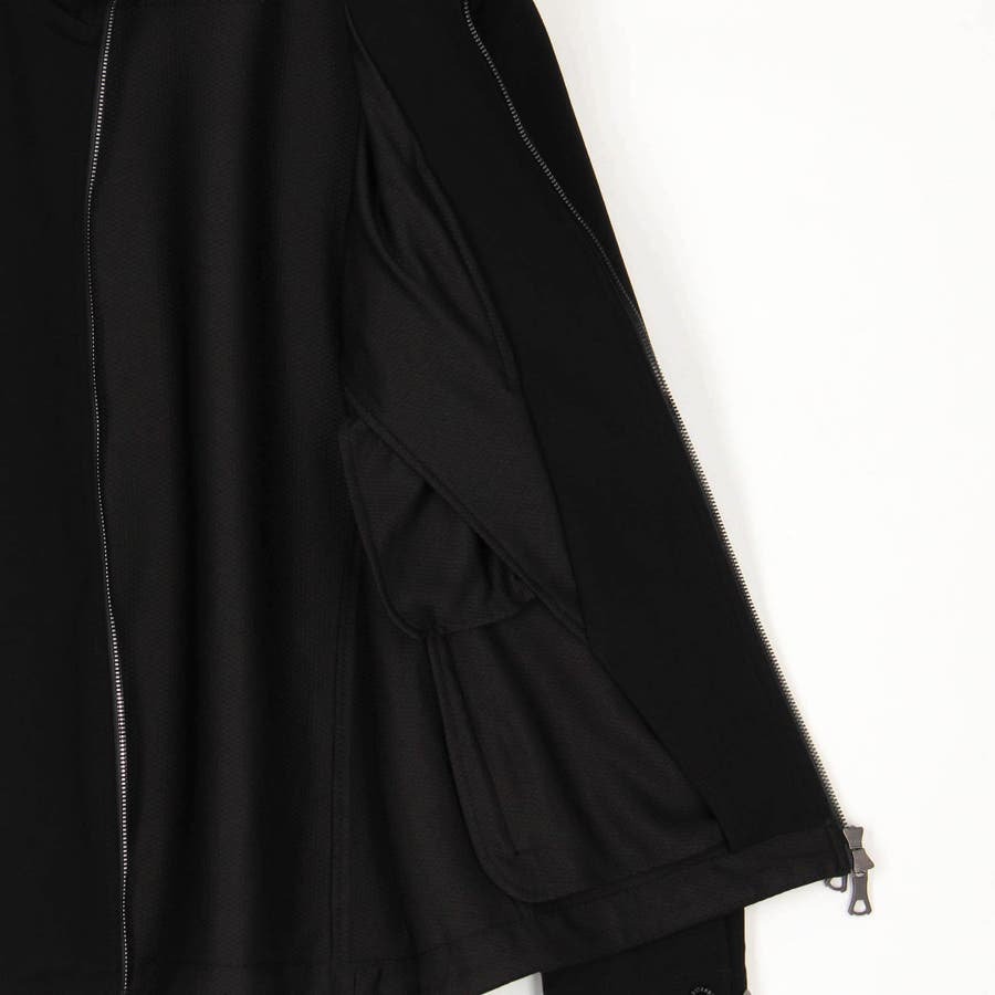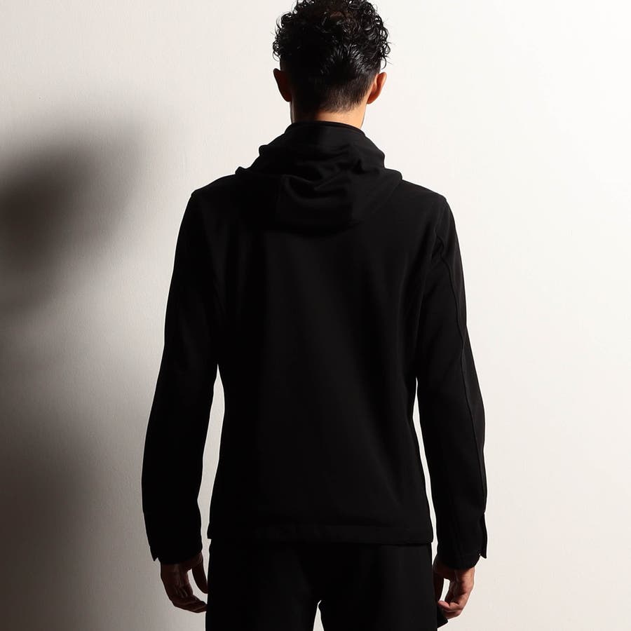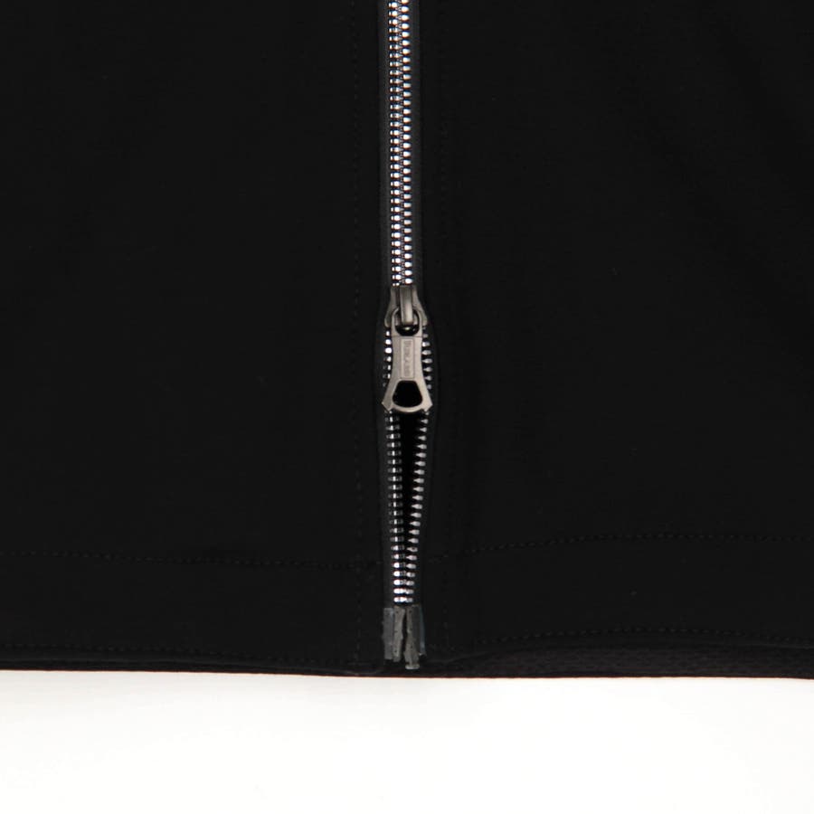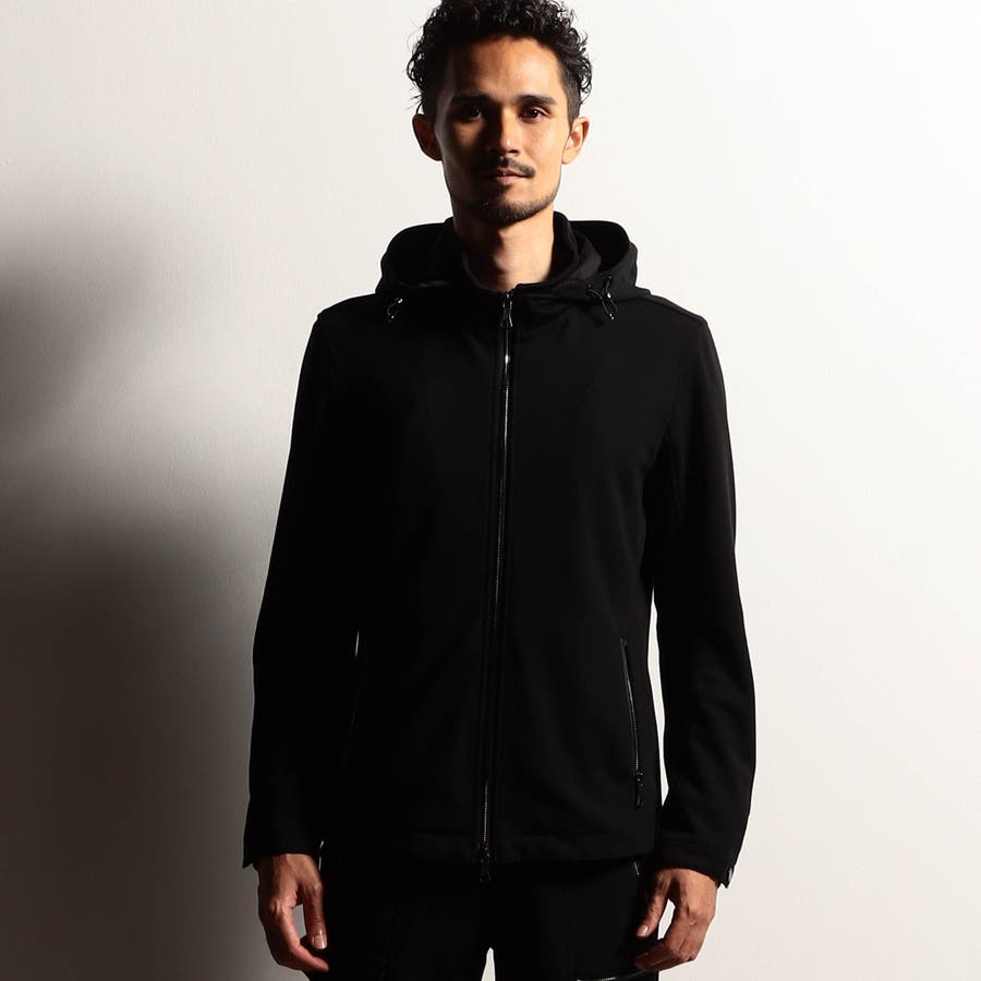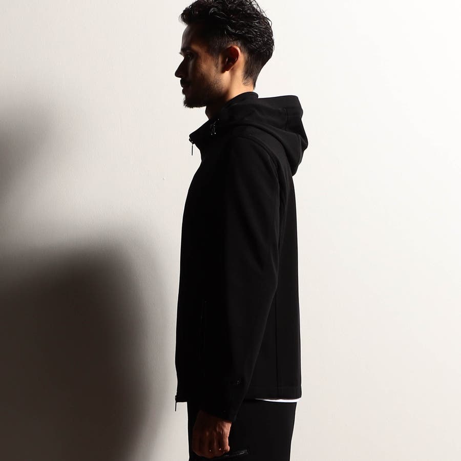 フード着脱仕様のスタンドジップブルゾン。ボンディング素材の特徴である張り感による立体的なシルエットとキックバックの効いたストレッチ性があるので、シンプルながら着やすいブルゾンです。ボンディングの裏素材は織柄の入った組成の違う同色別布を採用しています。脇の縫代部分にはデオドラントテープを入れる事で機能性も追加。YKKの箔転写ファスナーをアクセントにラグジュアリーなスポーツモードブルゾンに仕上げています。