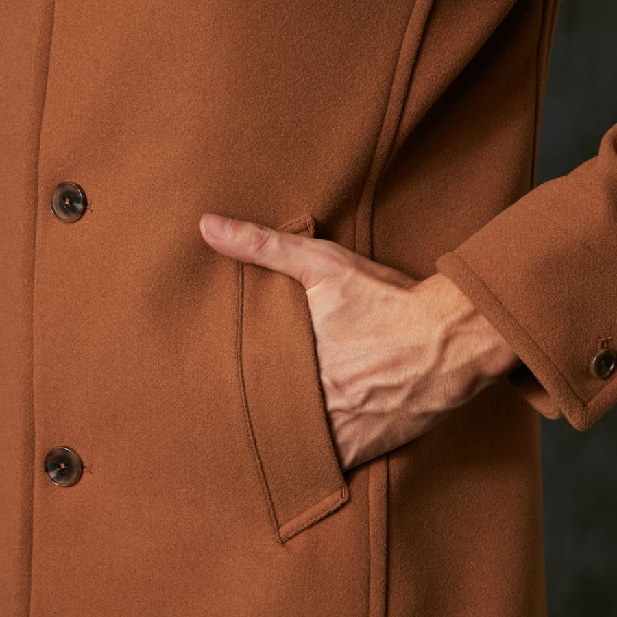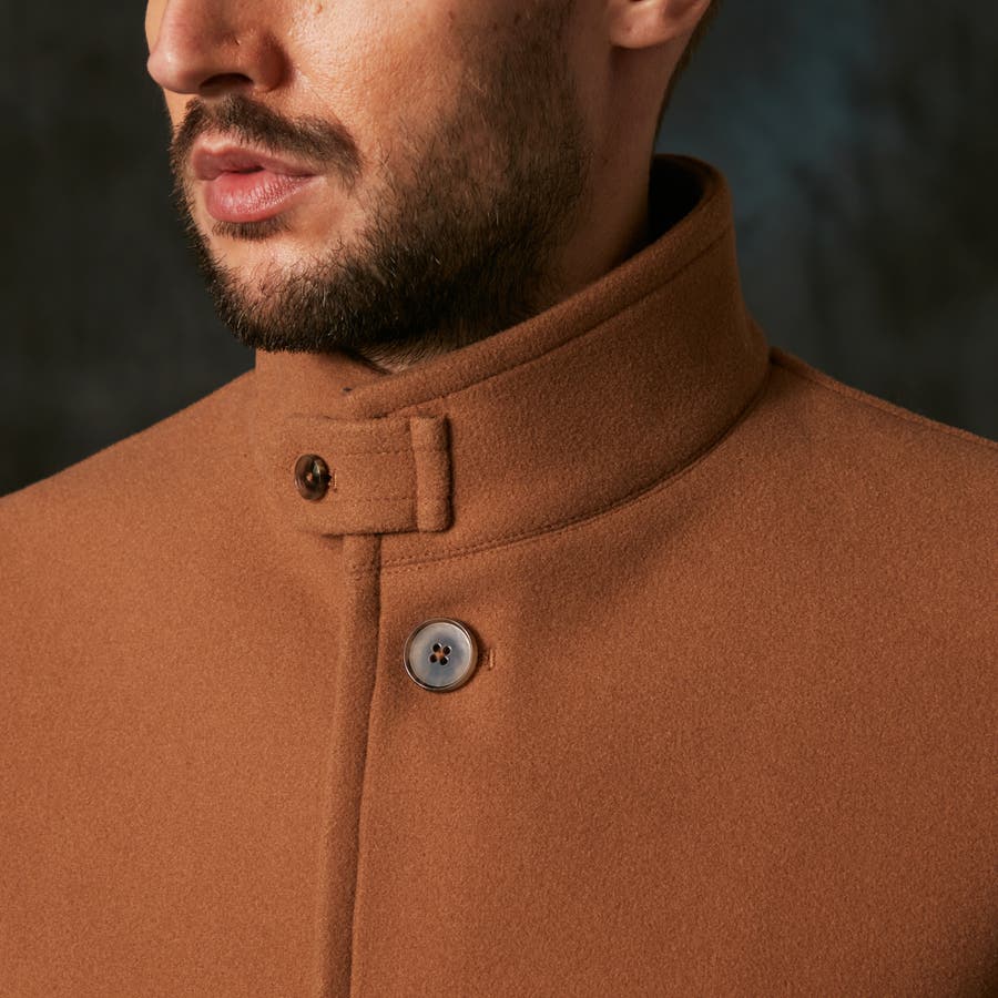 シンプルなデザインのミドル丈スタンドコート。