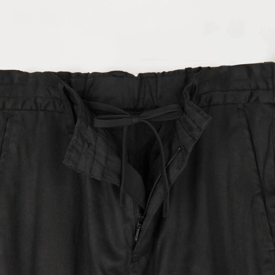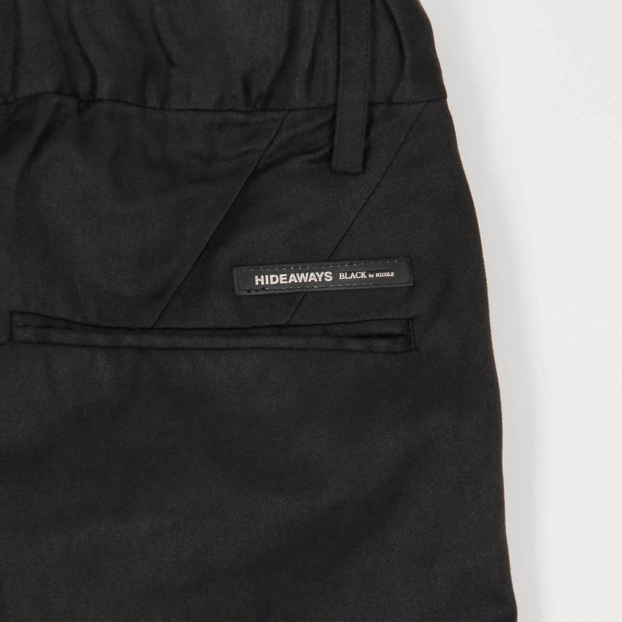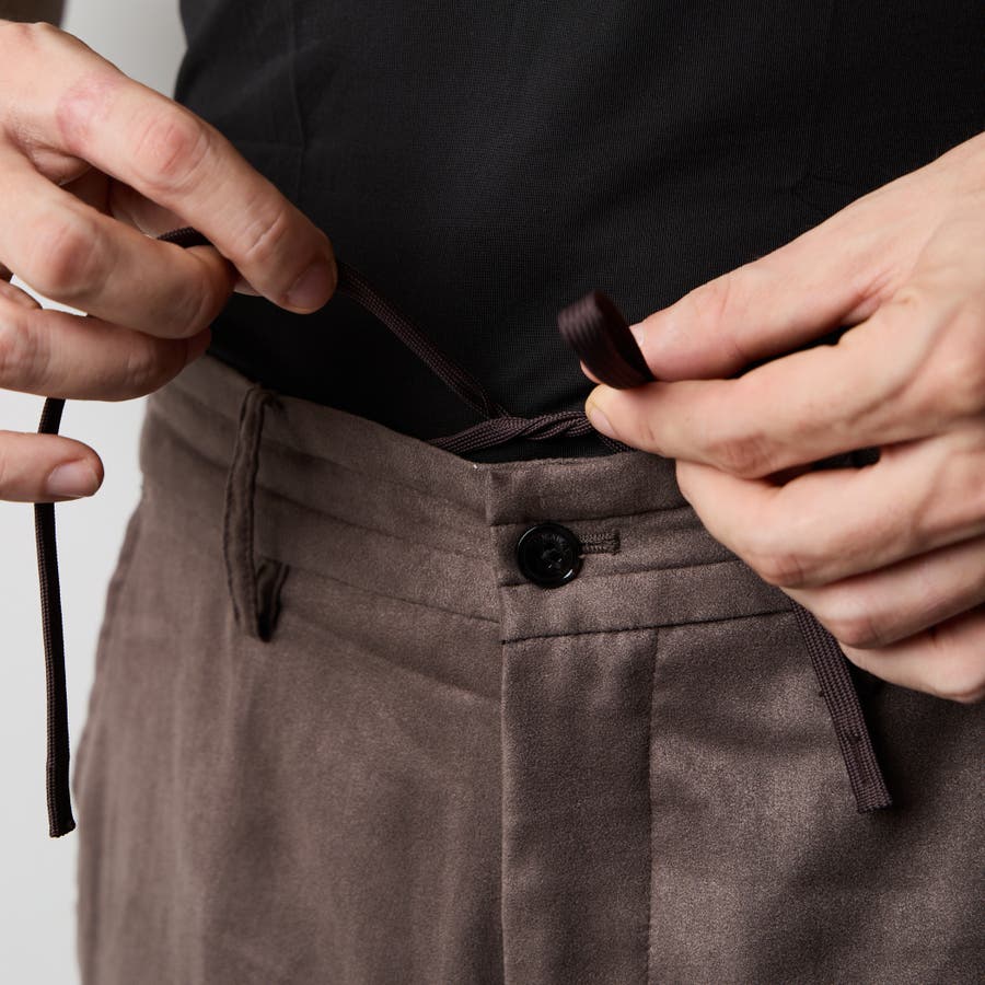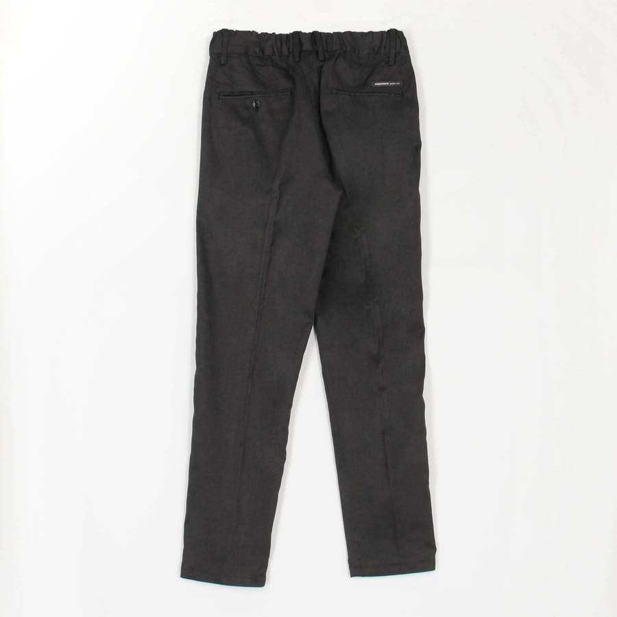 ウエストベルトには平ゴムとスピンドルを入れたイージー仕様のスラックスパンツ。