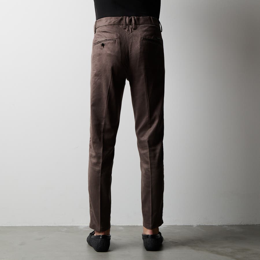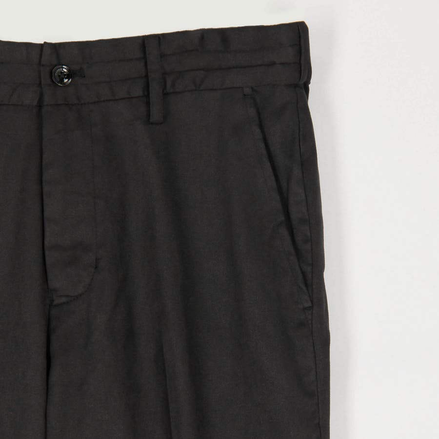 生地のテンションもありますのでウエストのシャーリング分量を少なくし、ヒップ周りから渡り幅を細くして裾口にかけてテーパードした細身シルエットに仕上げています。