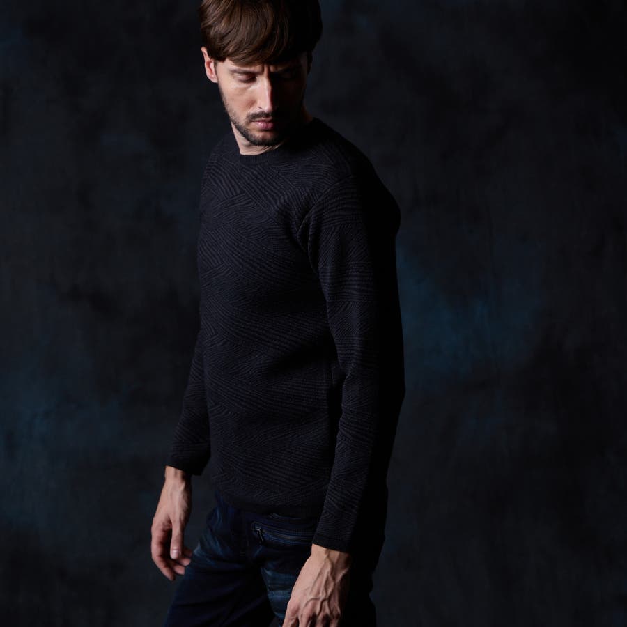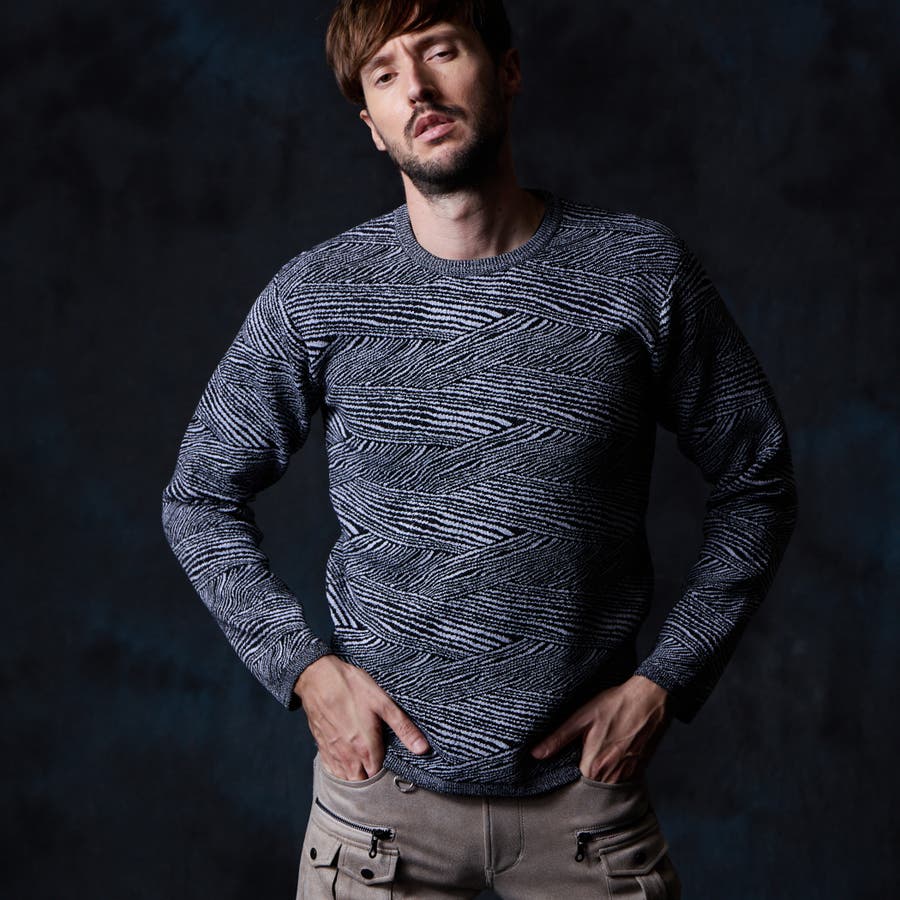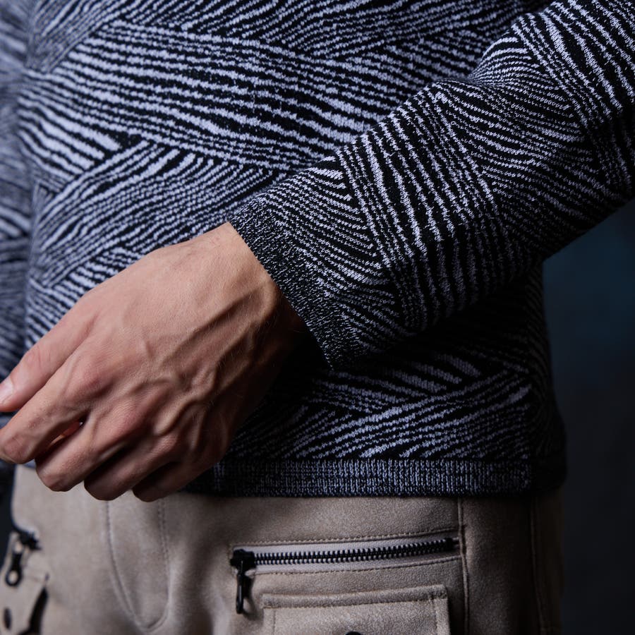 柄に凹凸があることで、他にないインパクトのあるニットに仕上がっています。