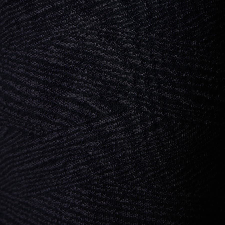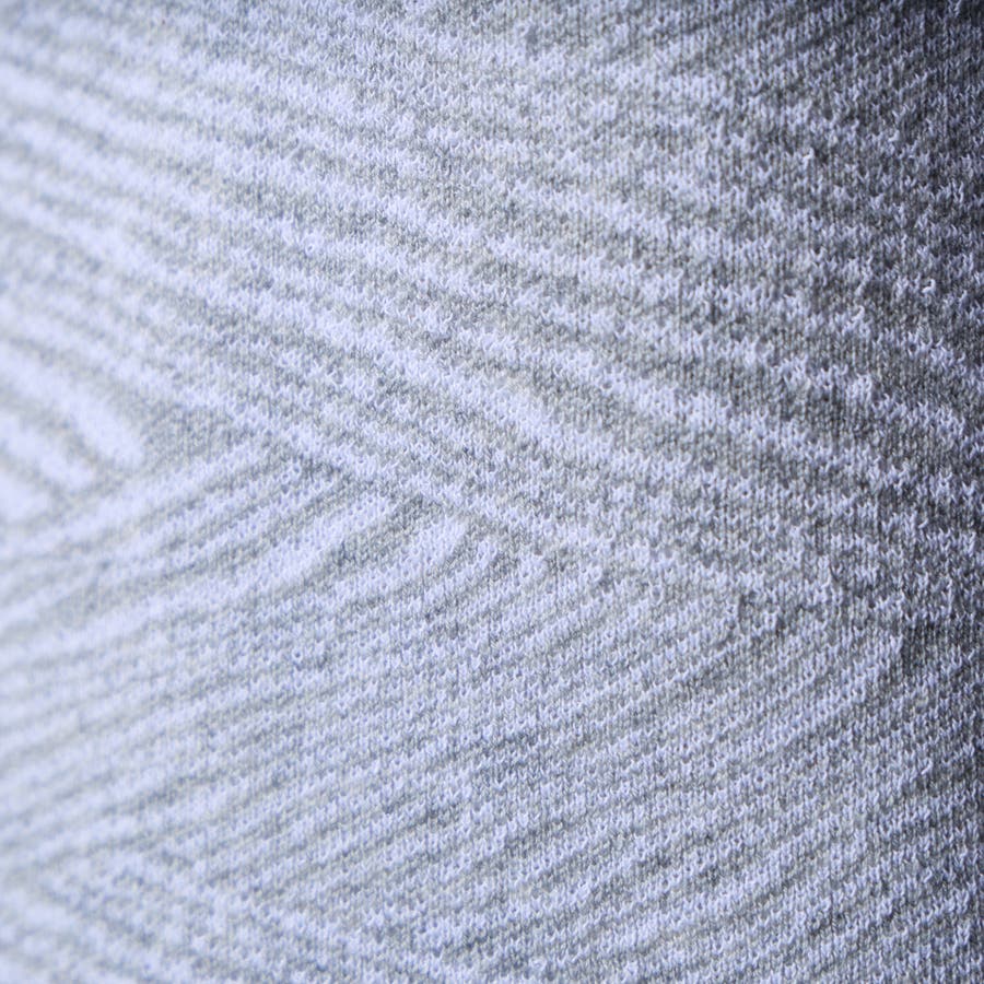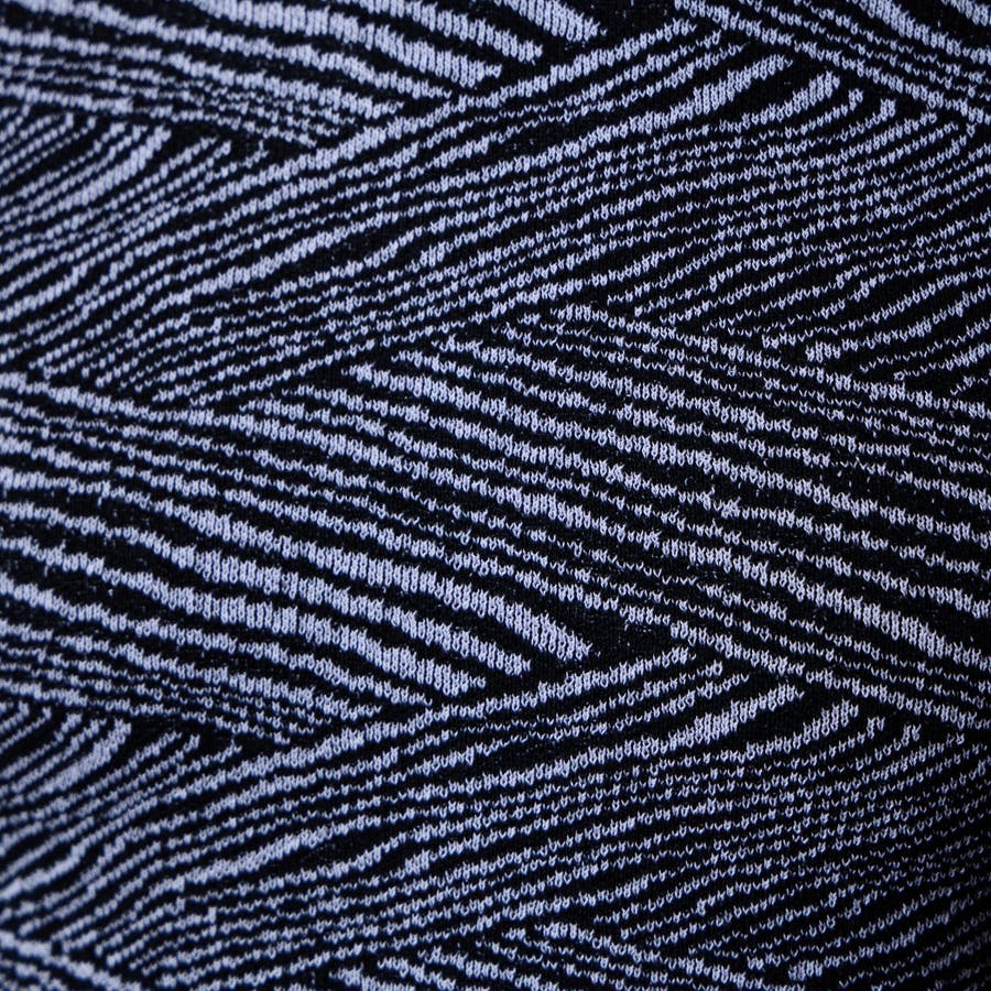 表側をレーヨンナイロン糸、綿アクリル糸、裏側を高収縮ポリエステル糸を使用して幾何学風バイアス柄をタックジャガード編みで表現しました。