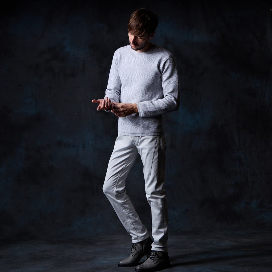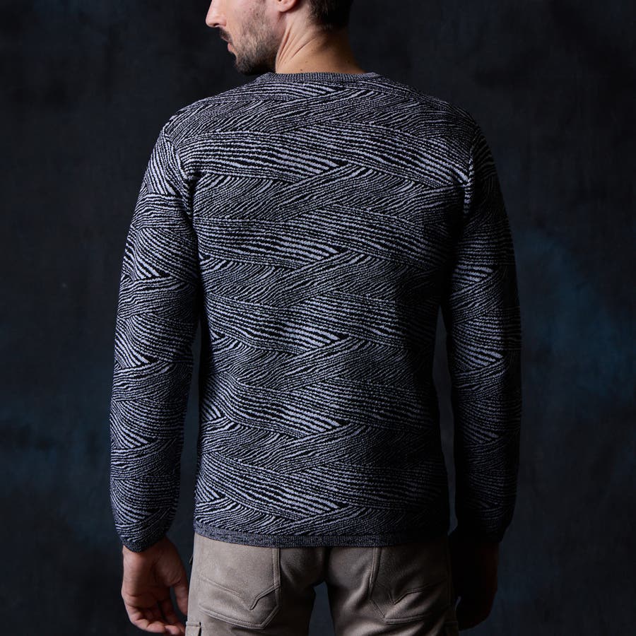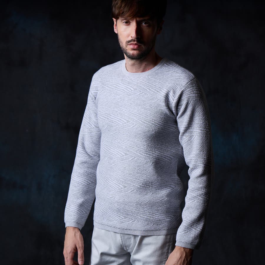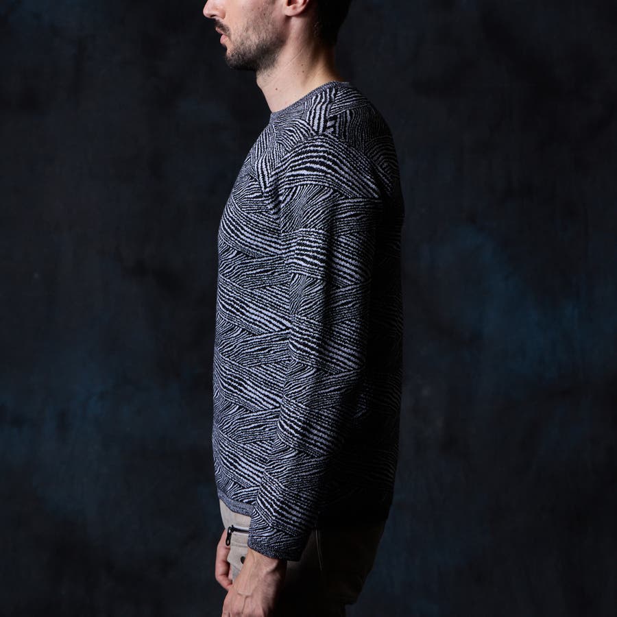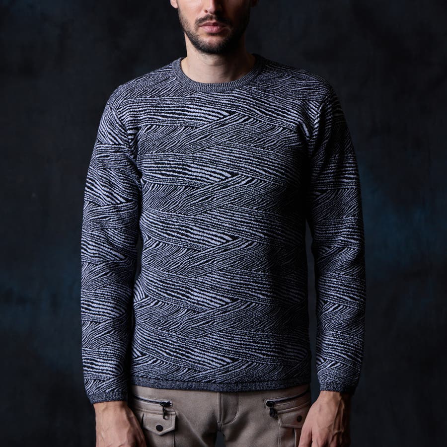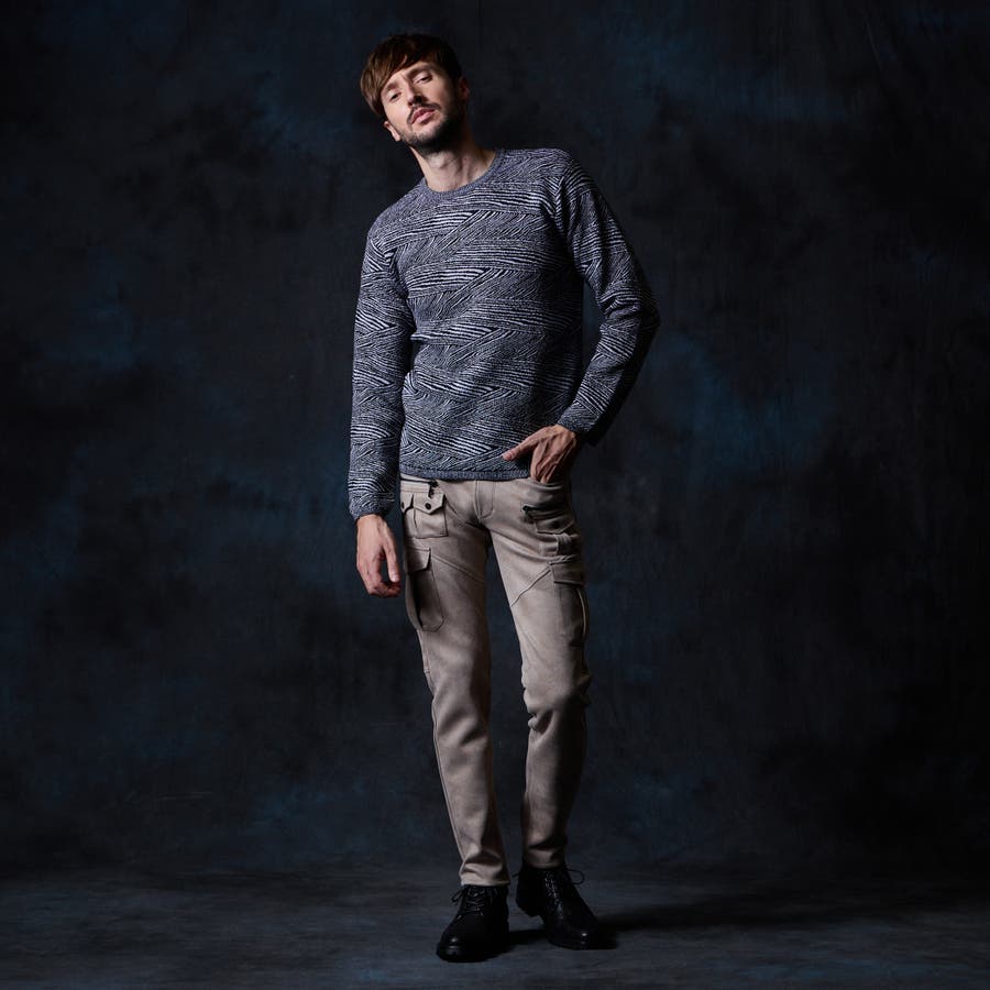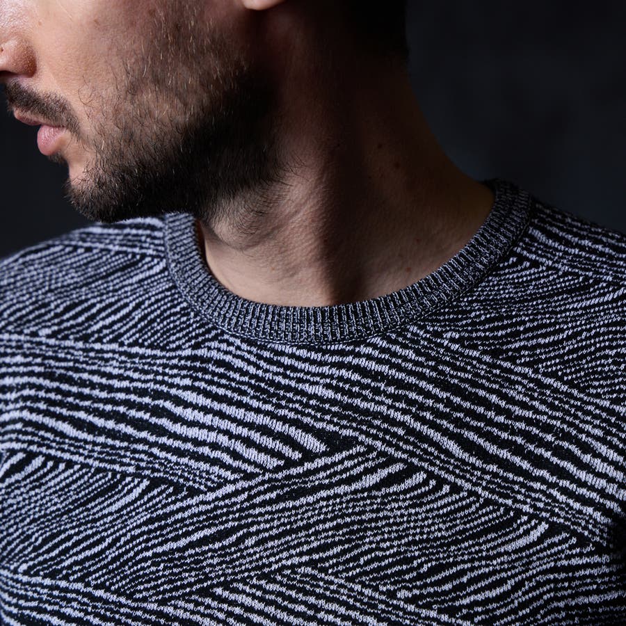 幾何学風バイアス柄をジャカード編みで表現したクルーネックプルオ-バ-ニットになります。