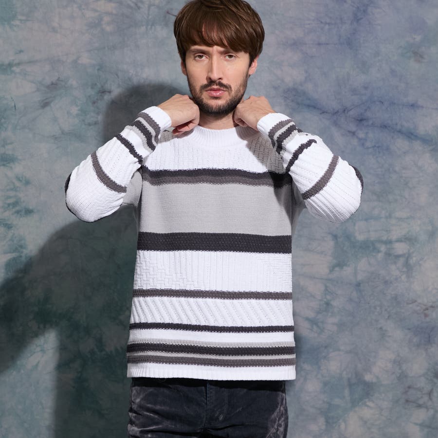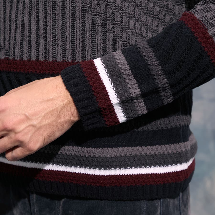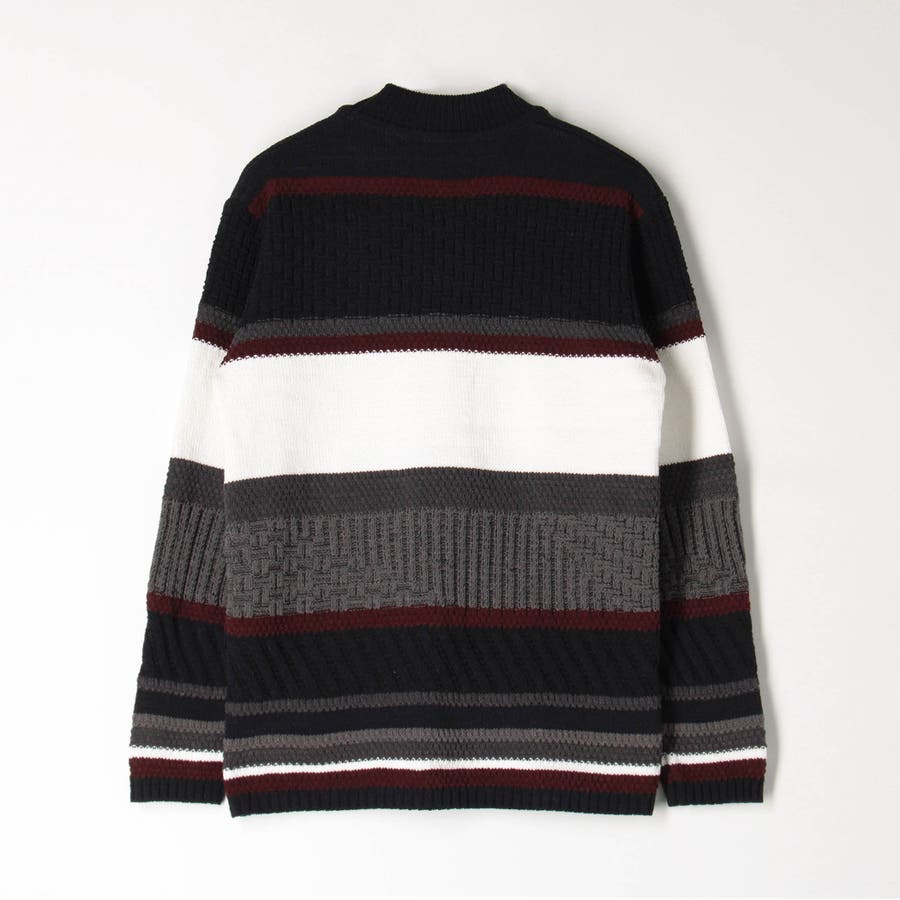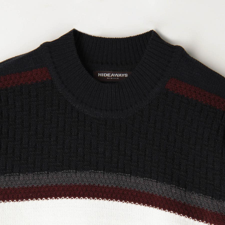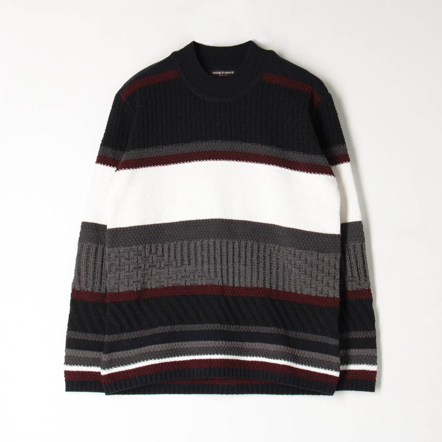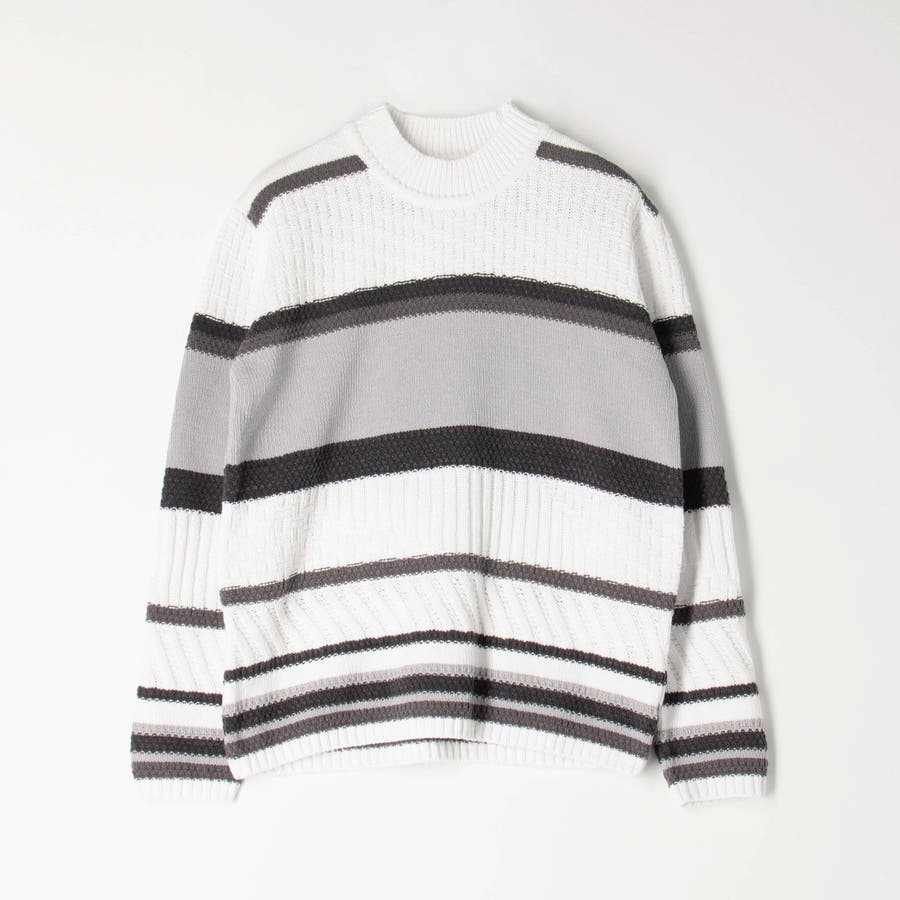 柄と色をランダムに組み合わせたボーダー柄のクルーネックニットになります。モール糸とアクリル糸を交編することで肌触りの良いウォーム感のあるニットに仕上げています。