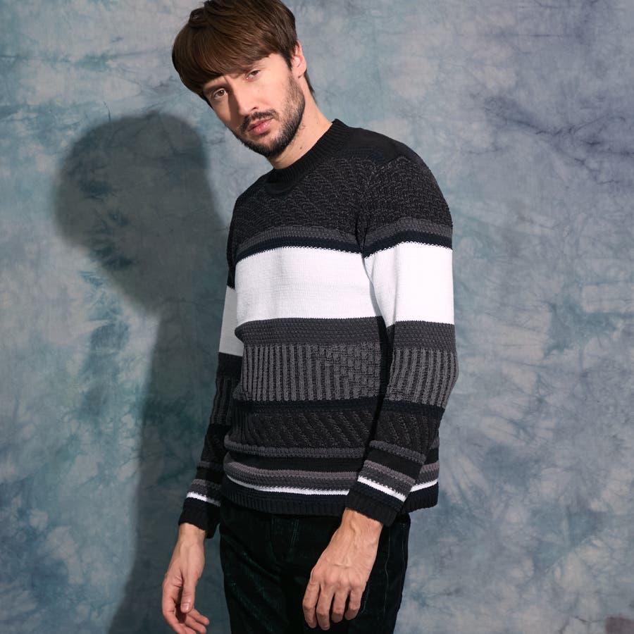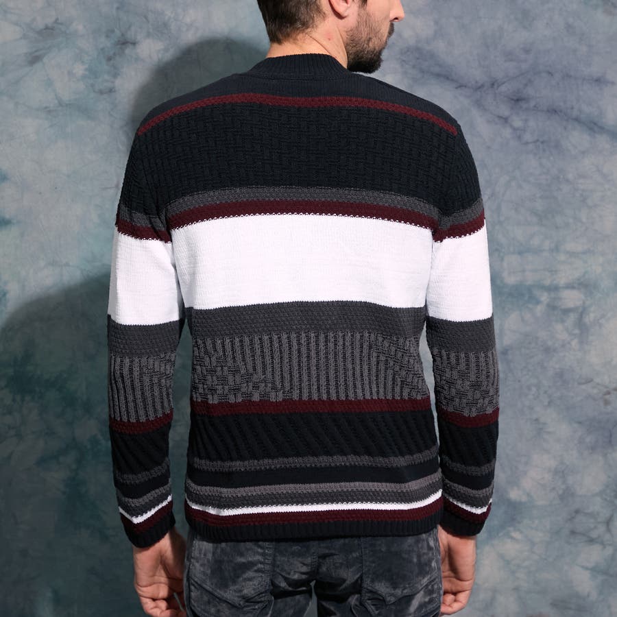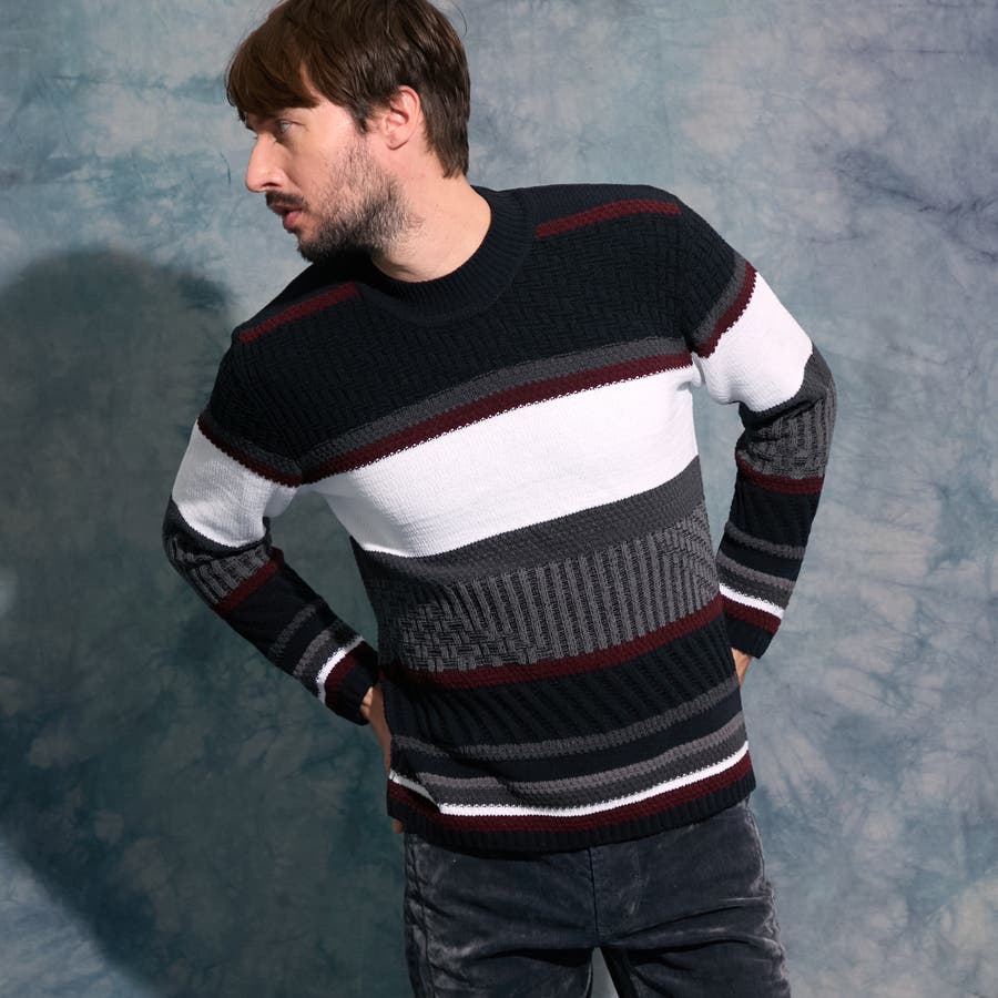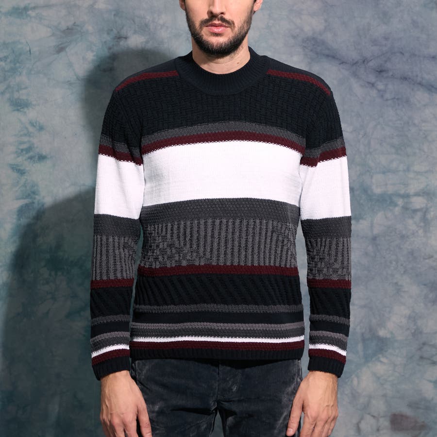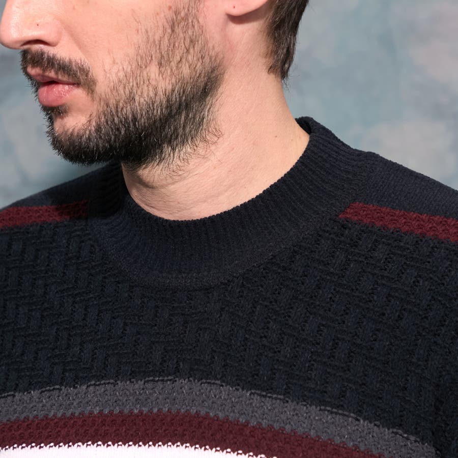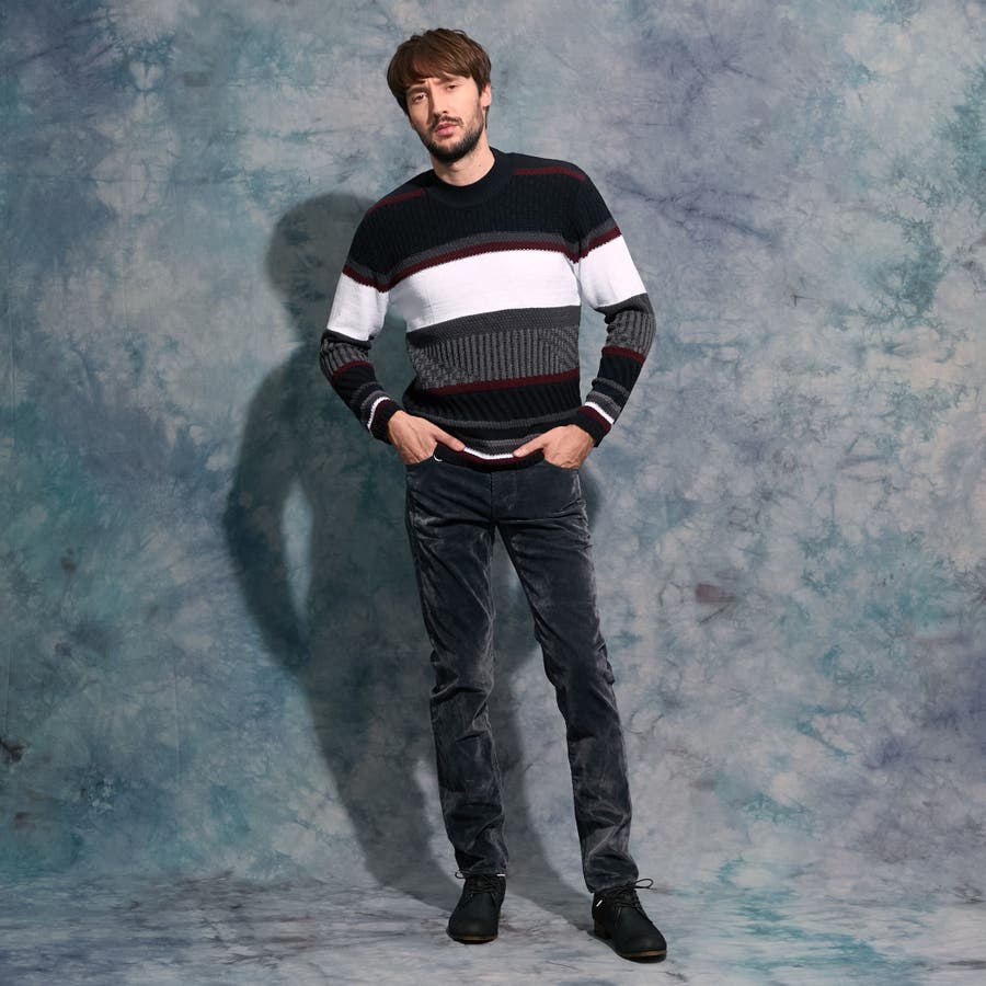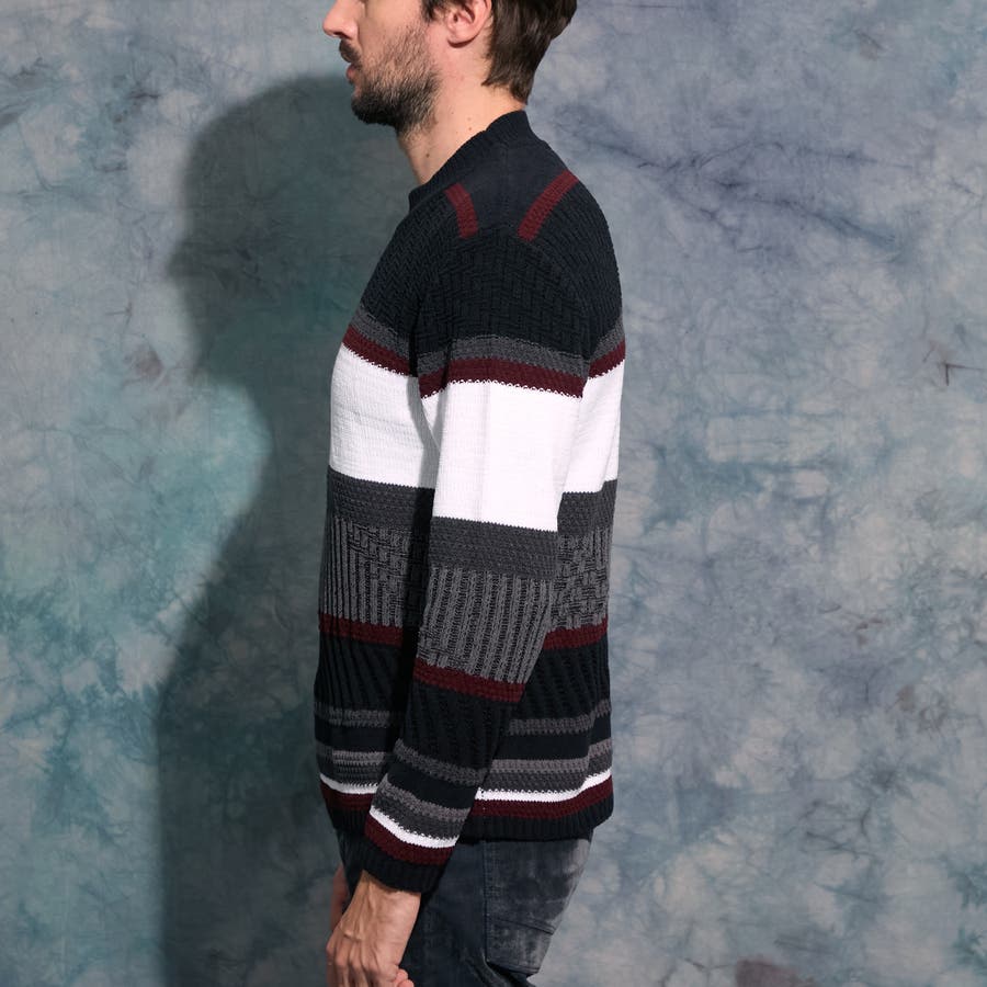 柄と色をランダムに組み合わせたボーダー柄のクルーネックニットになります。モール糸とアクリル糸を交編することで肌触りの良いウォーム感のあるニットに仕上げています。