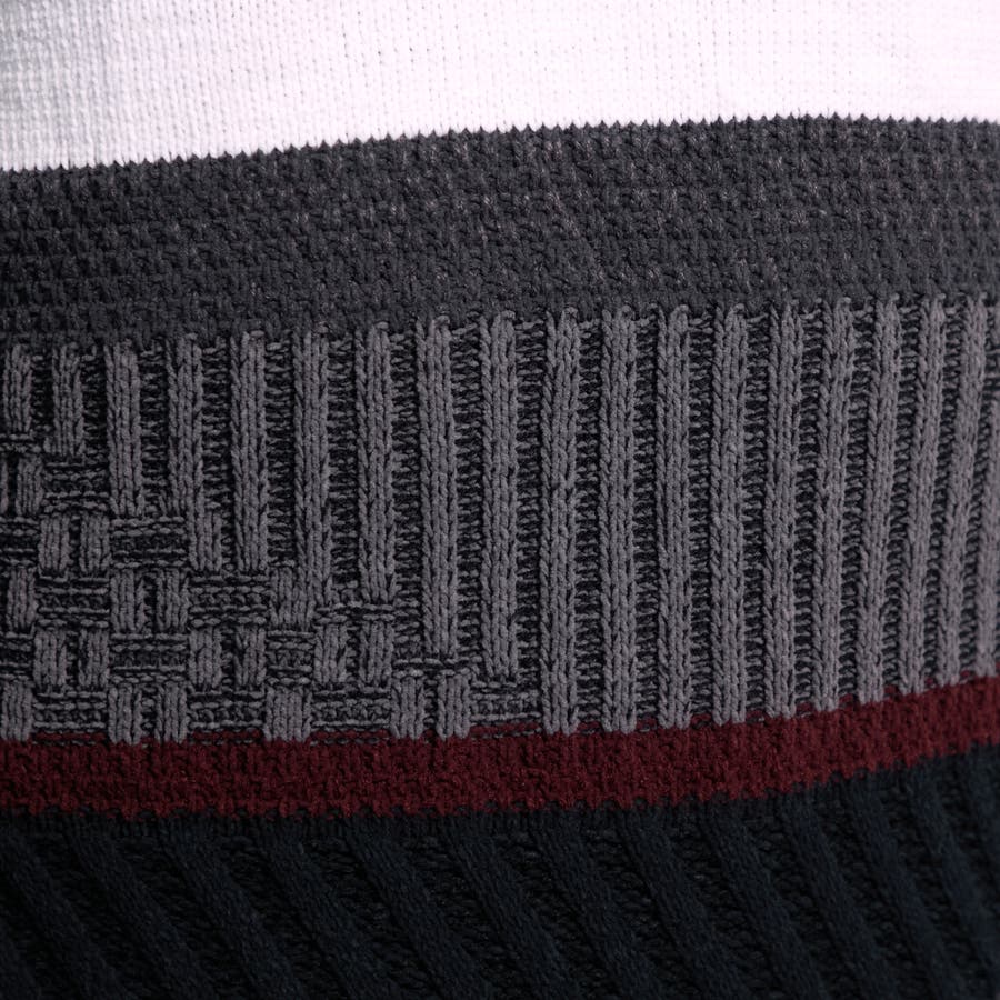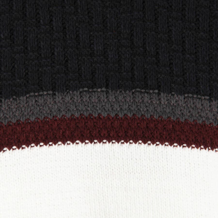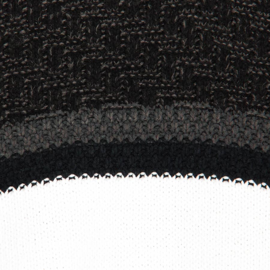 ランダムリブ、幾何学、ケーブル、バイヤス柄を斜めに組み合わせ、色をボーダー状で分けている複雑な柄をリンクス編みで表現しています。モール糸とアクリル糸を交編することで肌触りの良い、ウォーム感のある編地になっています。
