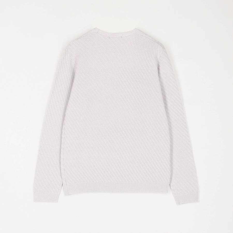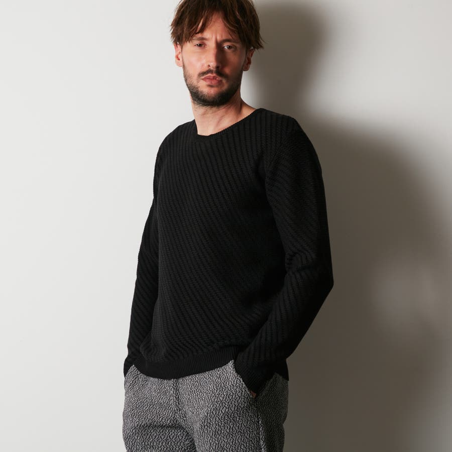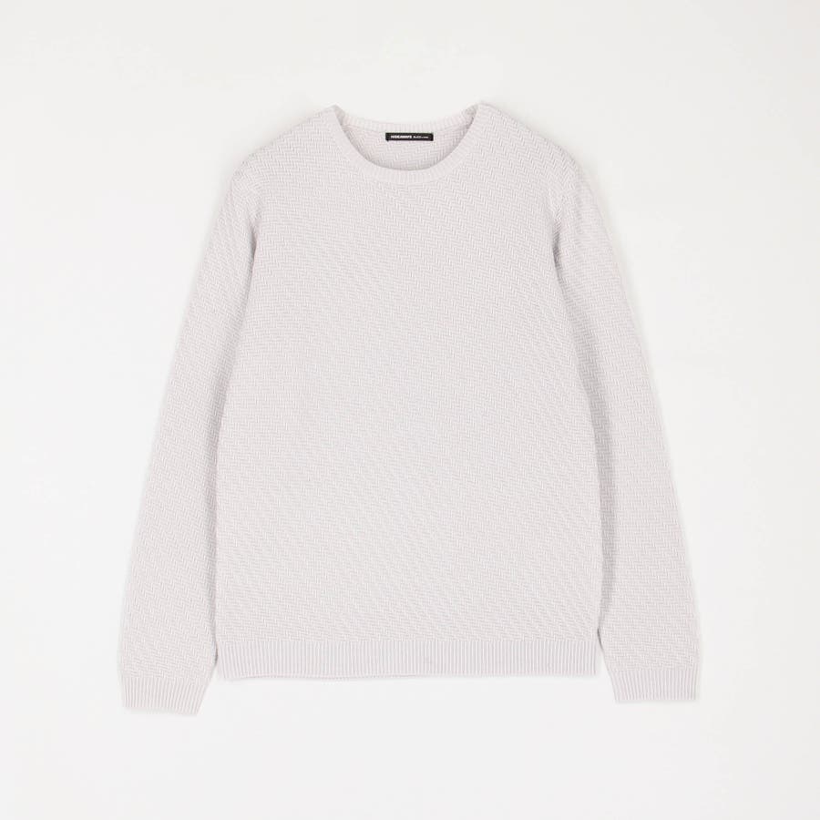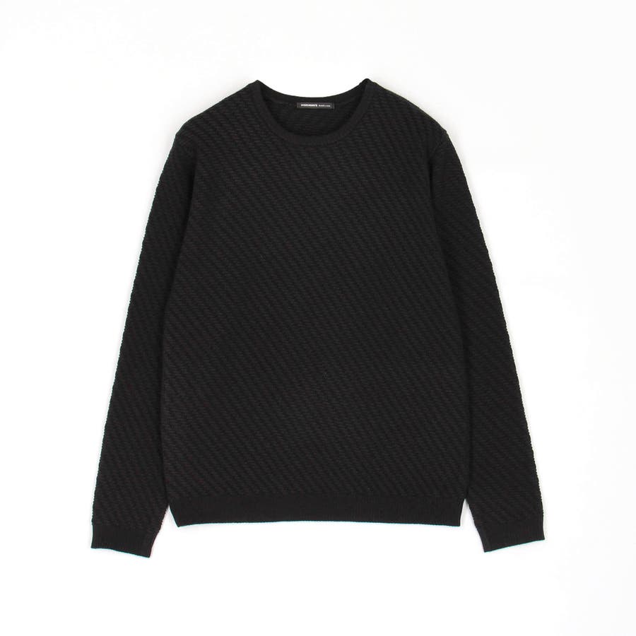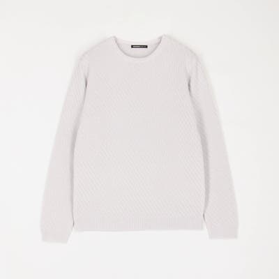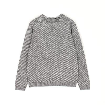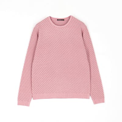 微配色で派手さを抑えながらも存在感のあるバイアスの編地で上品に仕上げたクルーネックニットになります。