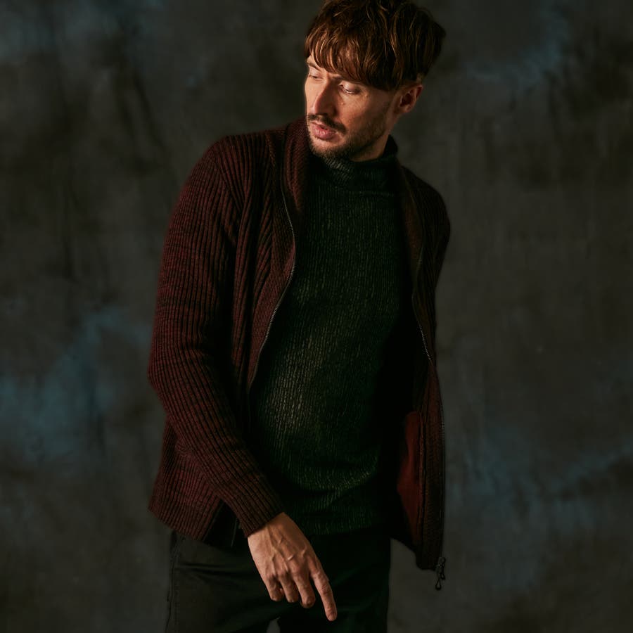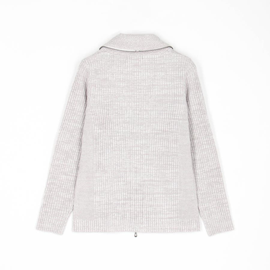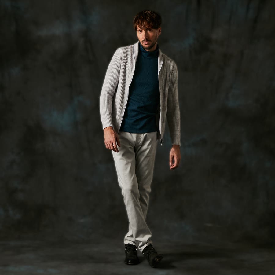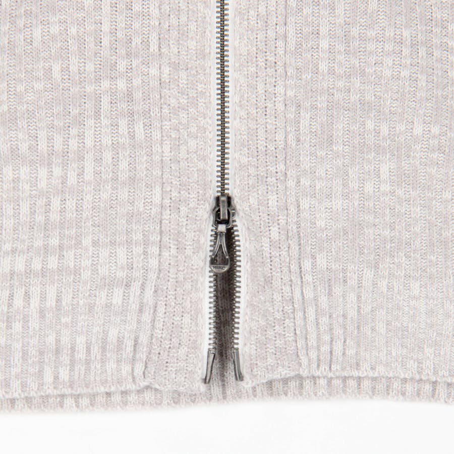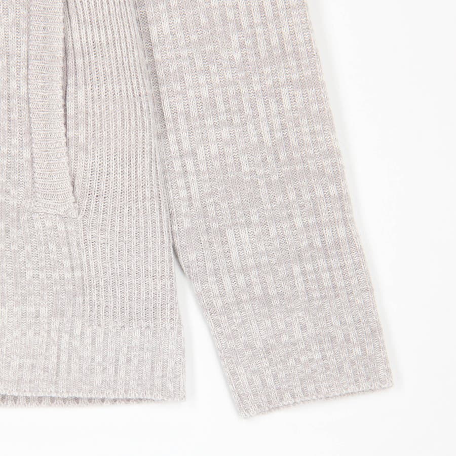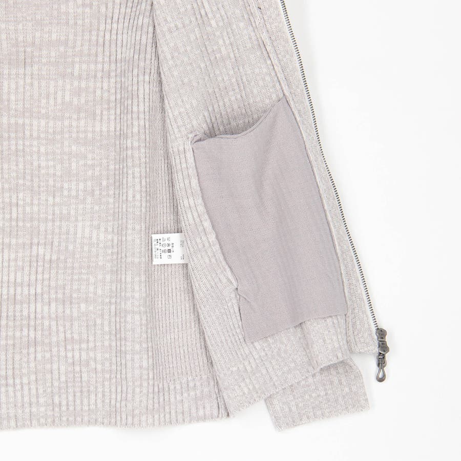 リブ編みをベースに、フロント~衿の切替部分は程良い立体感が特徴の変形カノコ編みでボリューム感を持たせています。