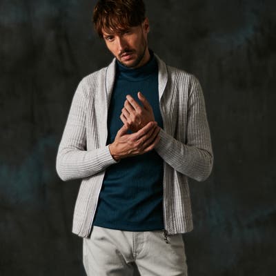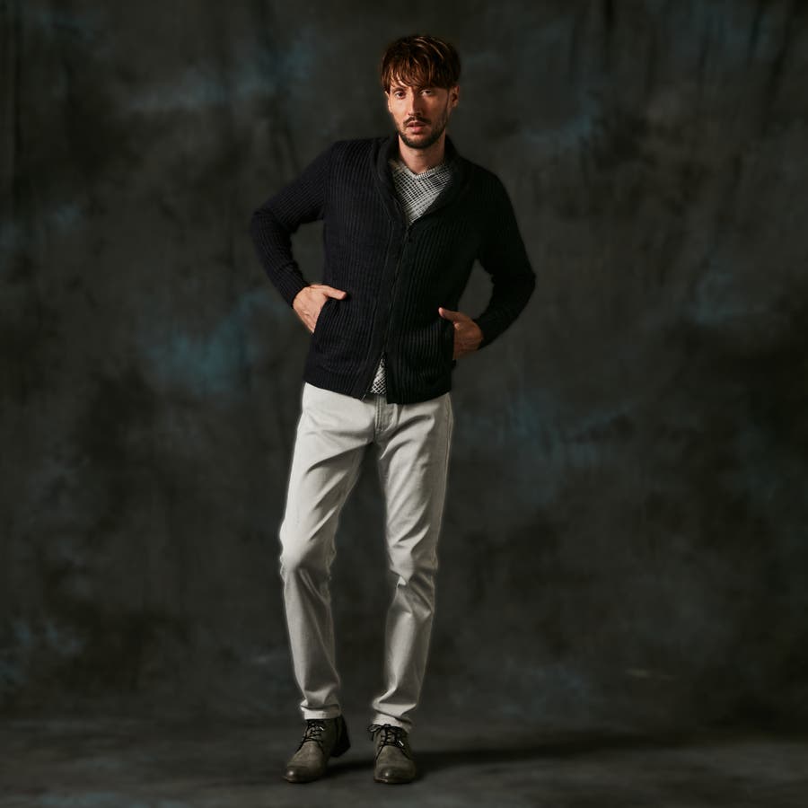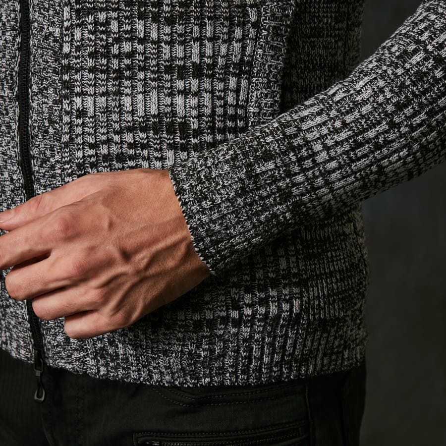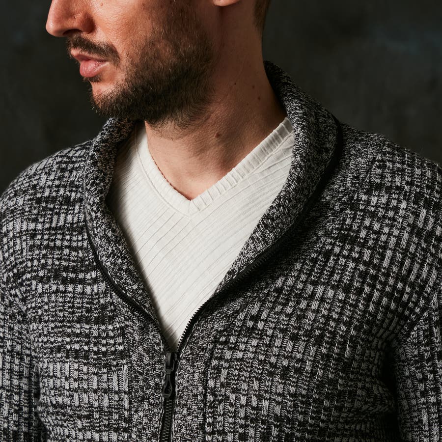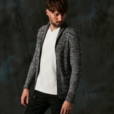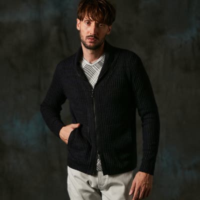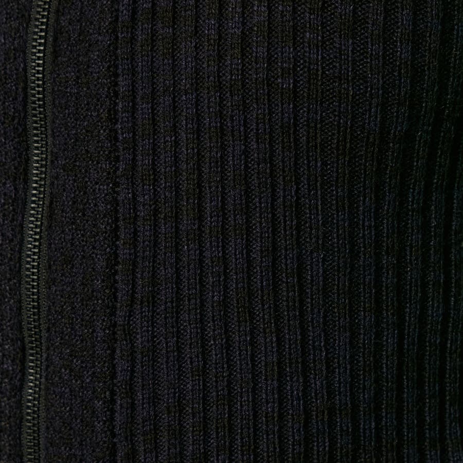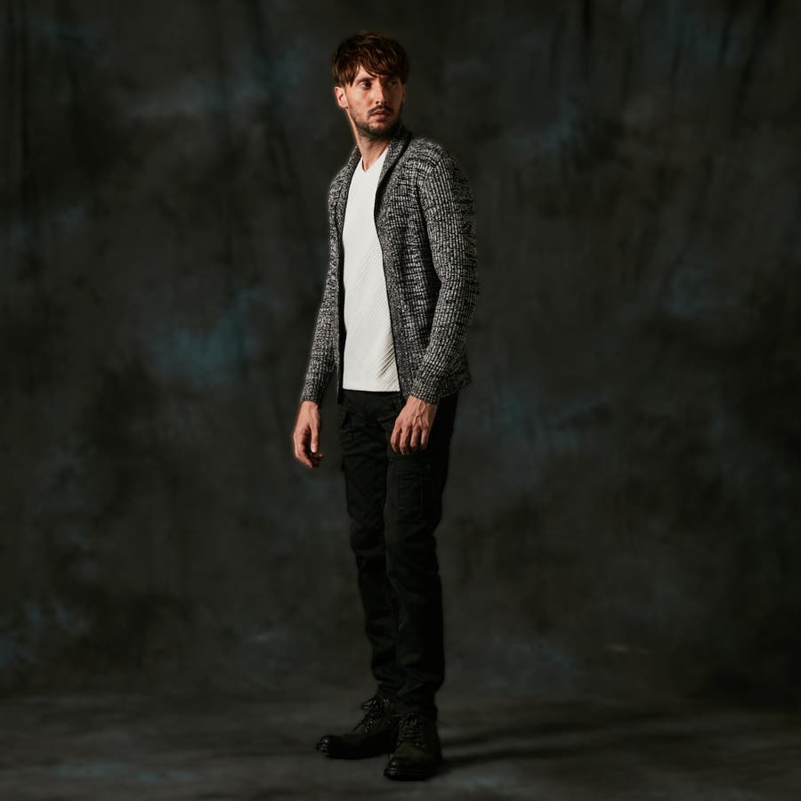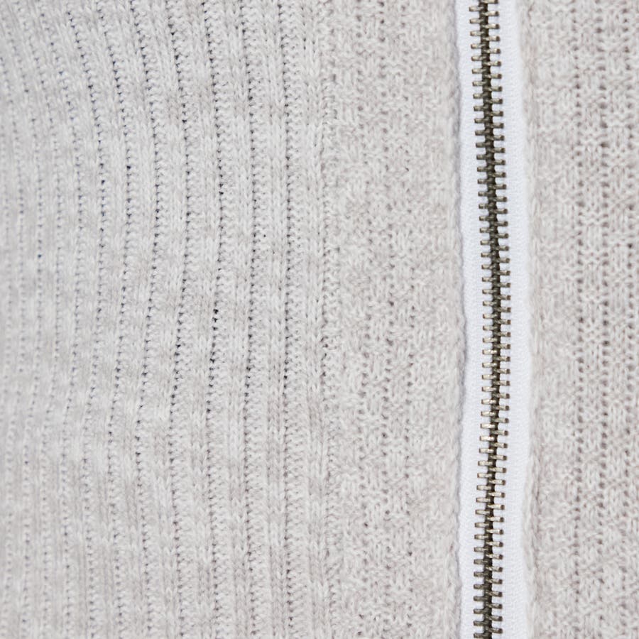 リブ編みをベースに、フロント~衿の切替部分は程良い立体感が特徴の変形カノコ編みでボリューム感を持たせています。
