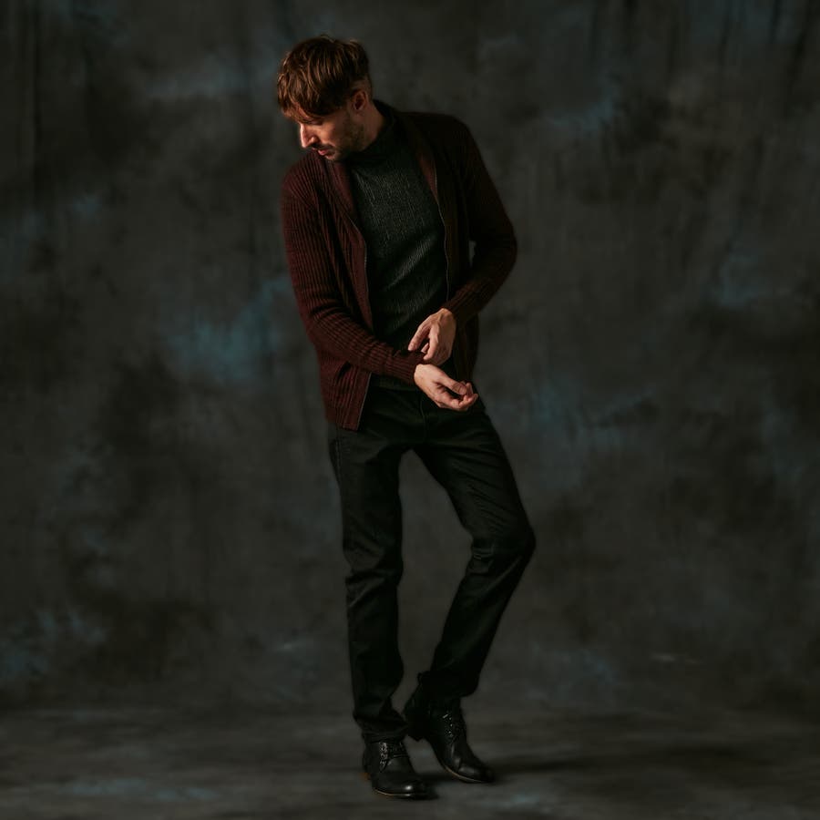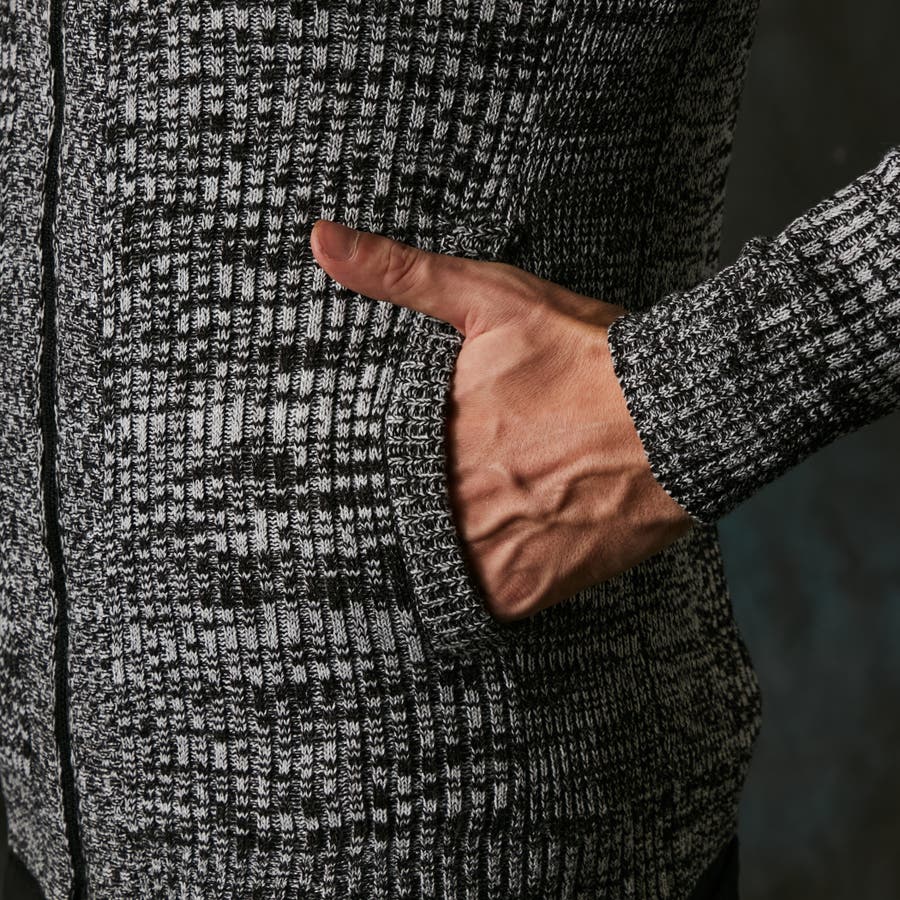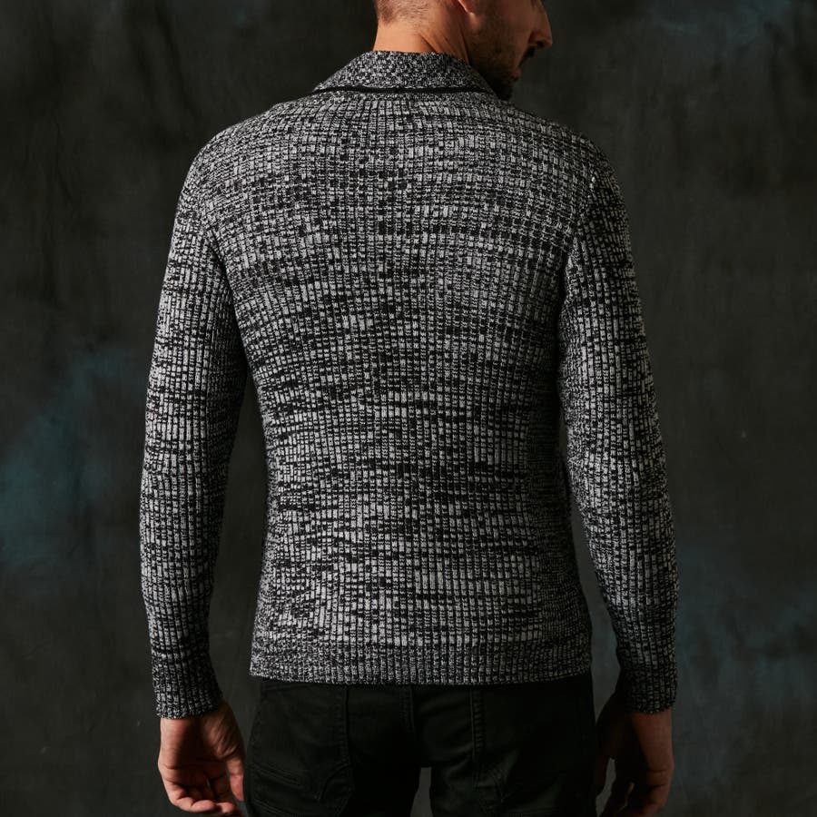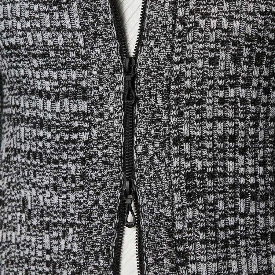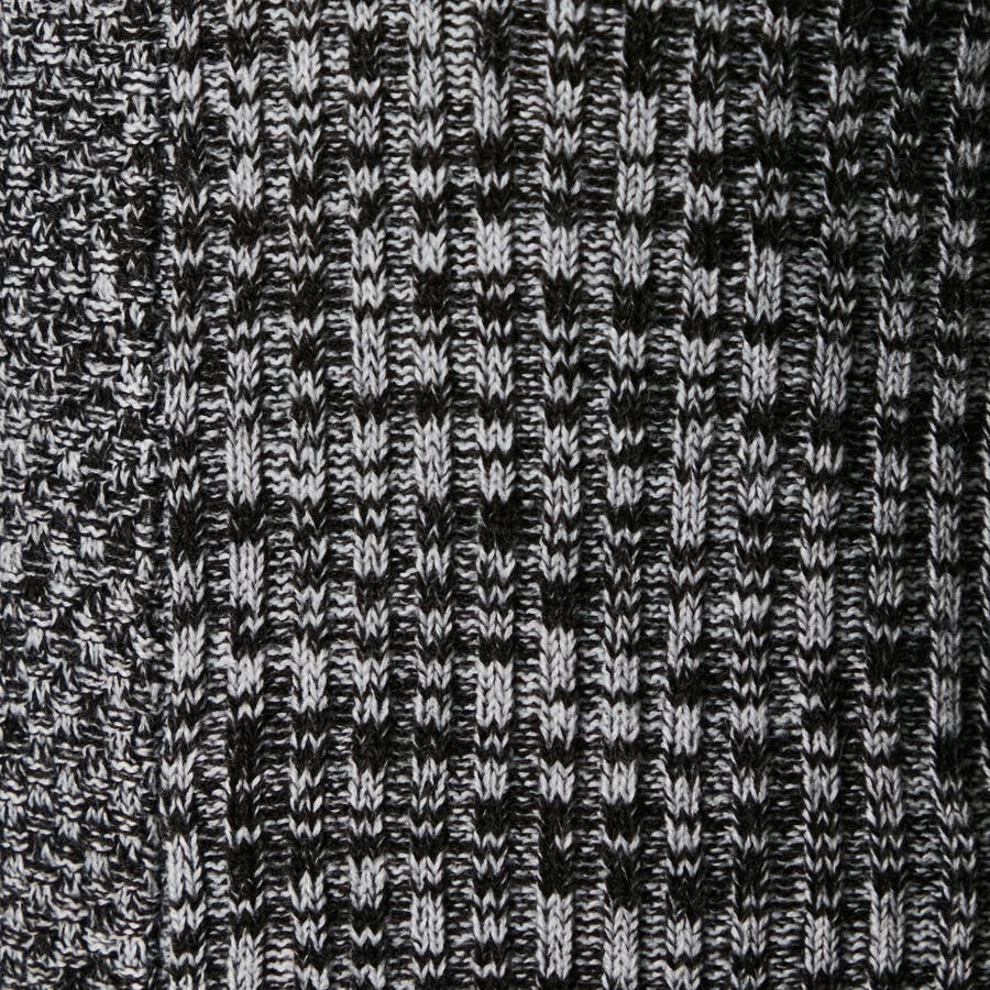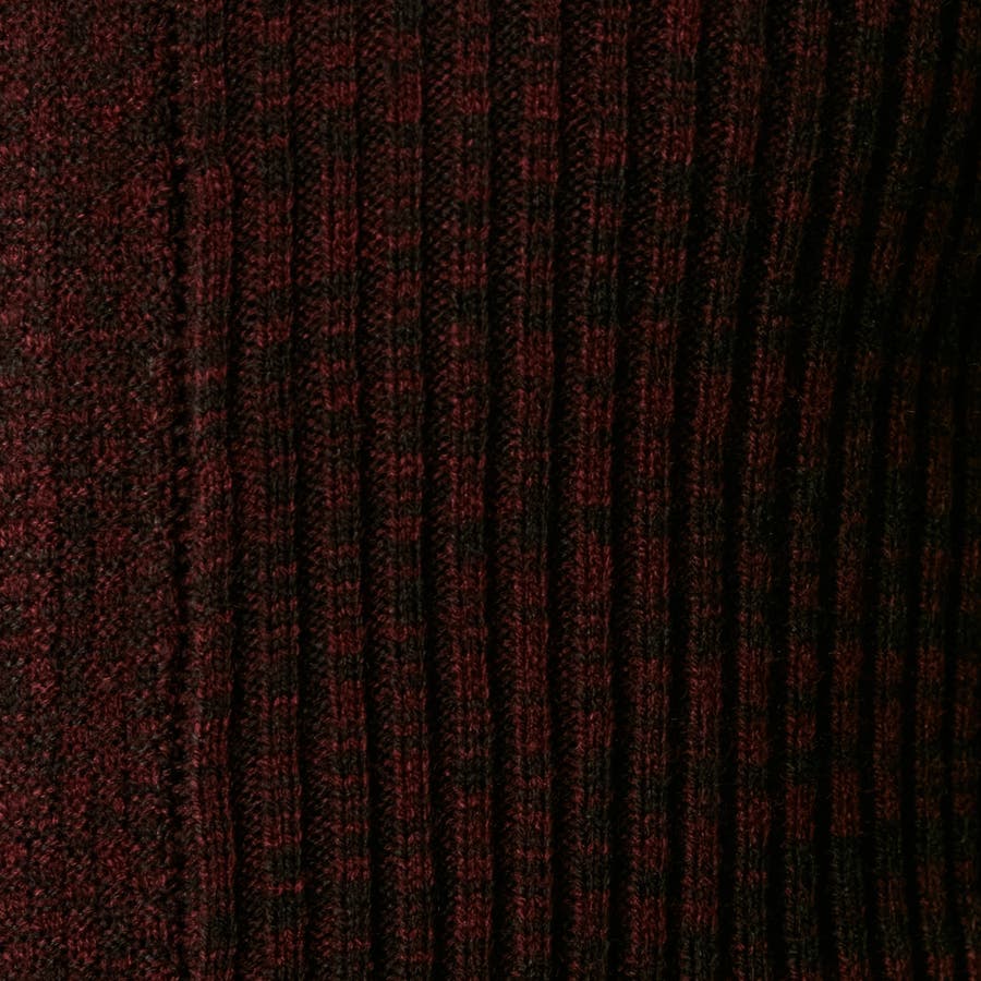 2色のアクリル糸を引き揃えて、7GGで編みあげています。杢調に編み上げることでワンランク上の表情に仕上がっています。