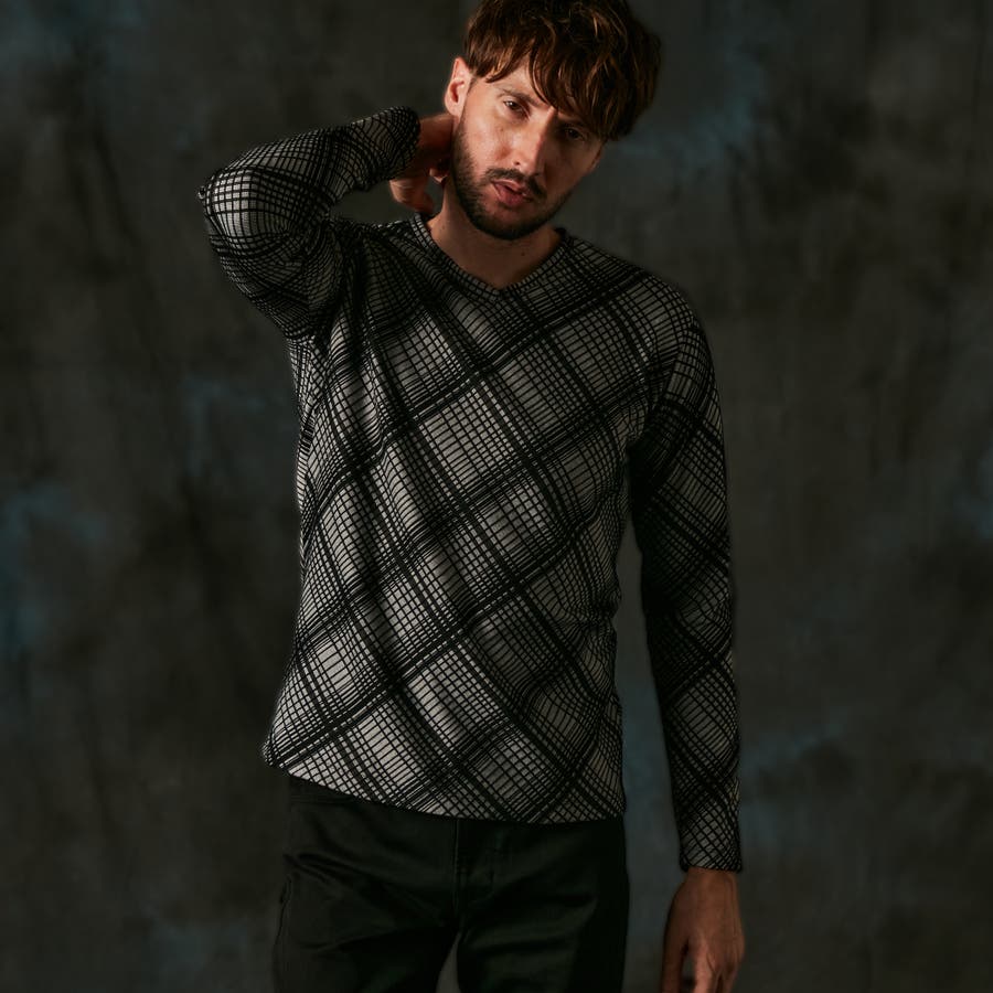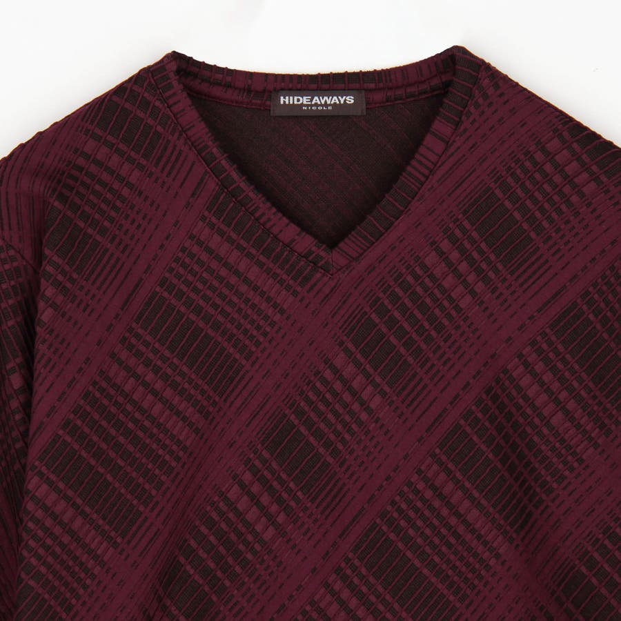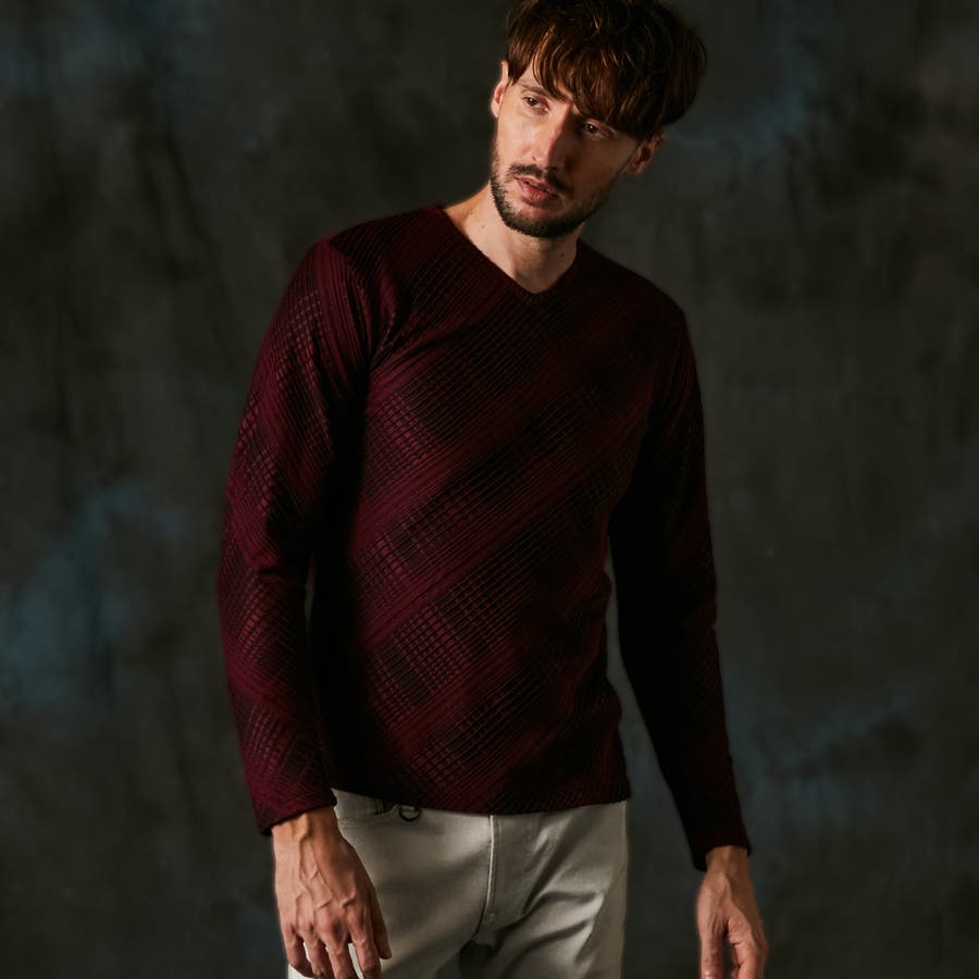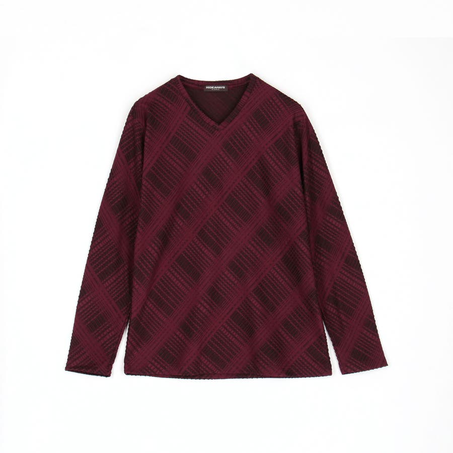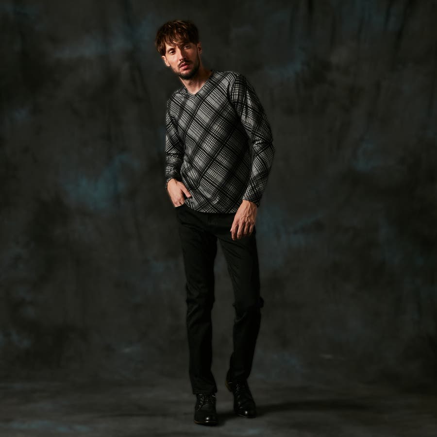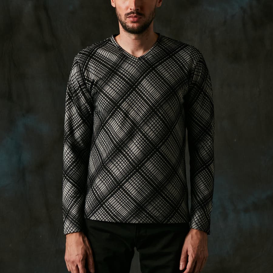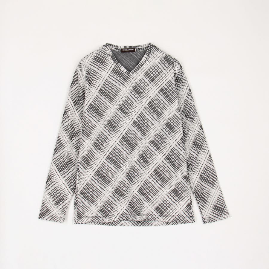 通常のチェック柄との差別化を図ったバイヤス仕様が一際目を引く、Vネックプルオーバーになります。