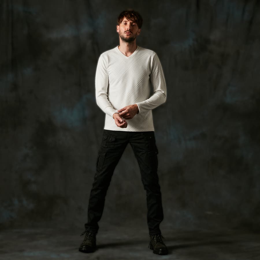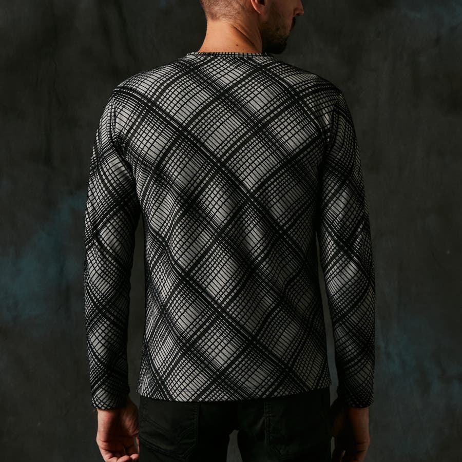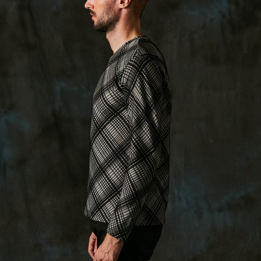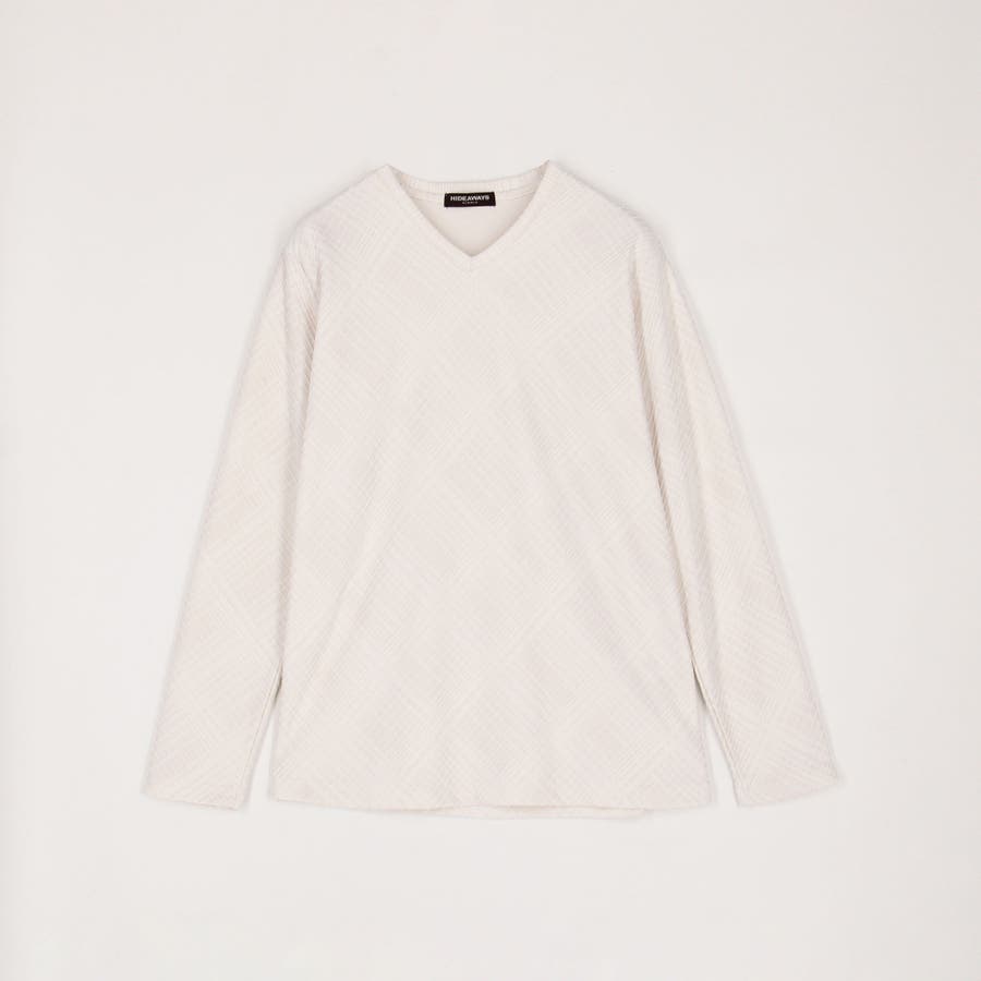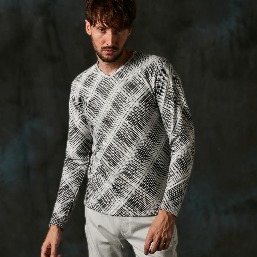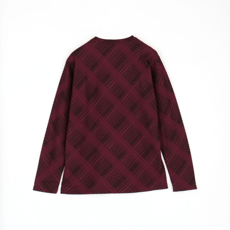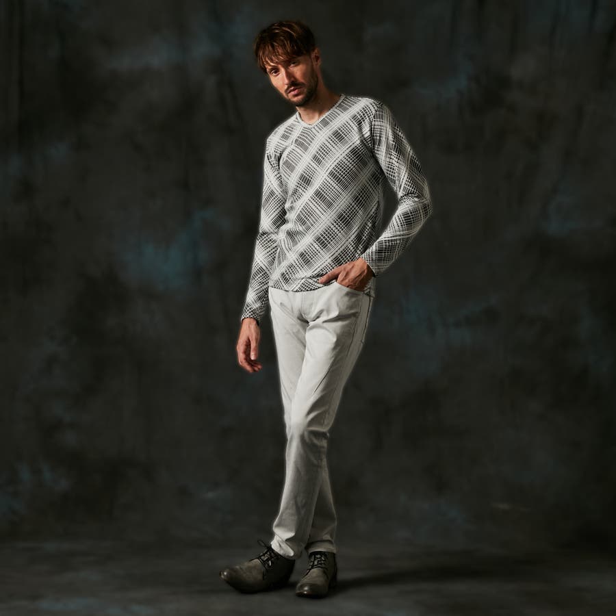 通常のチェック柄との差別化を図ったバイヤス仕様が一際目を引く、Vネックプルオーバーになります。