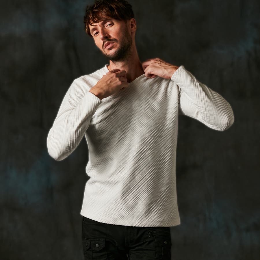 立体感のある編地にすることで独特な印象の地柄感に仕上げました。