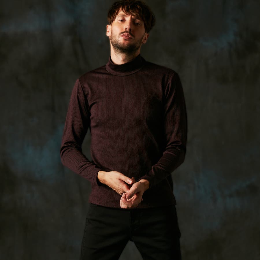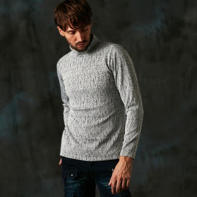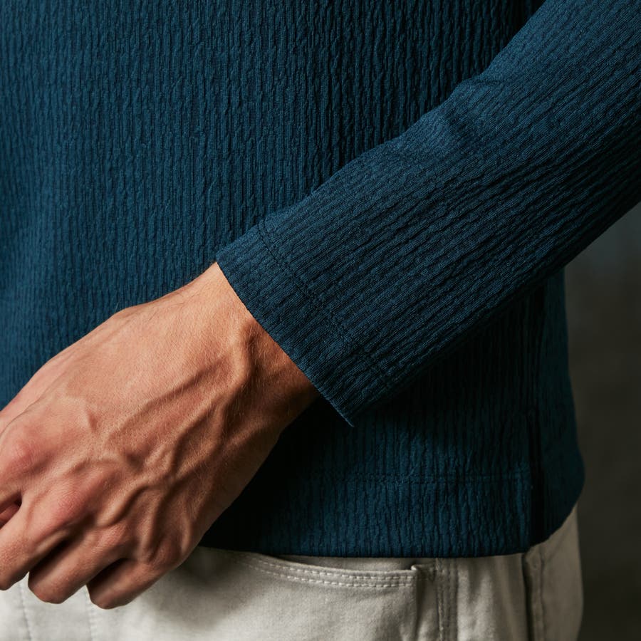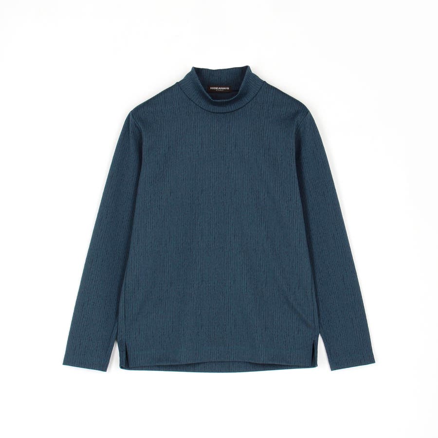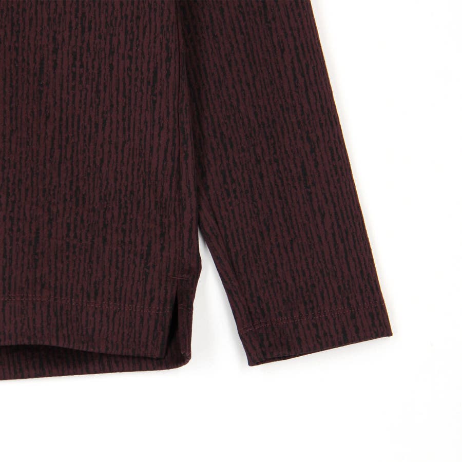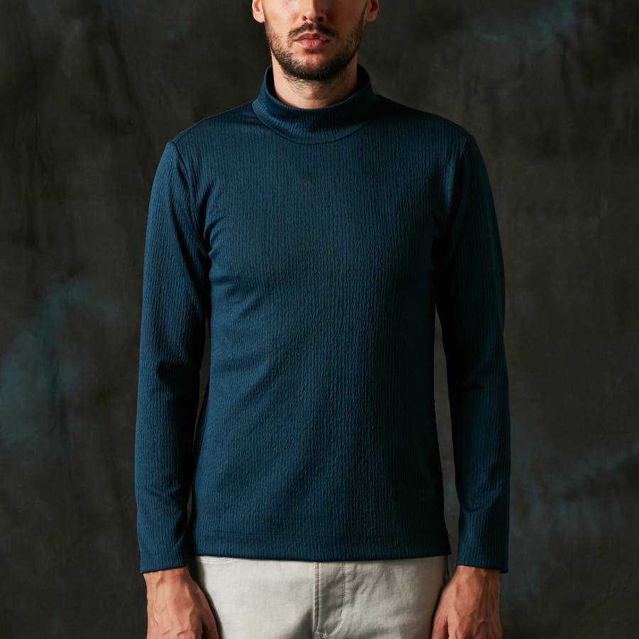凹凸のあるランダムなストライプ柄が目を惹く、モックネックプルオーバーになります。