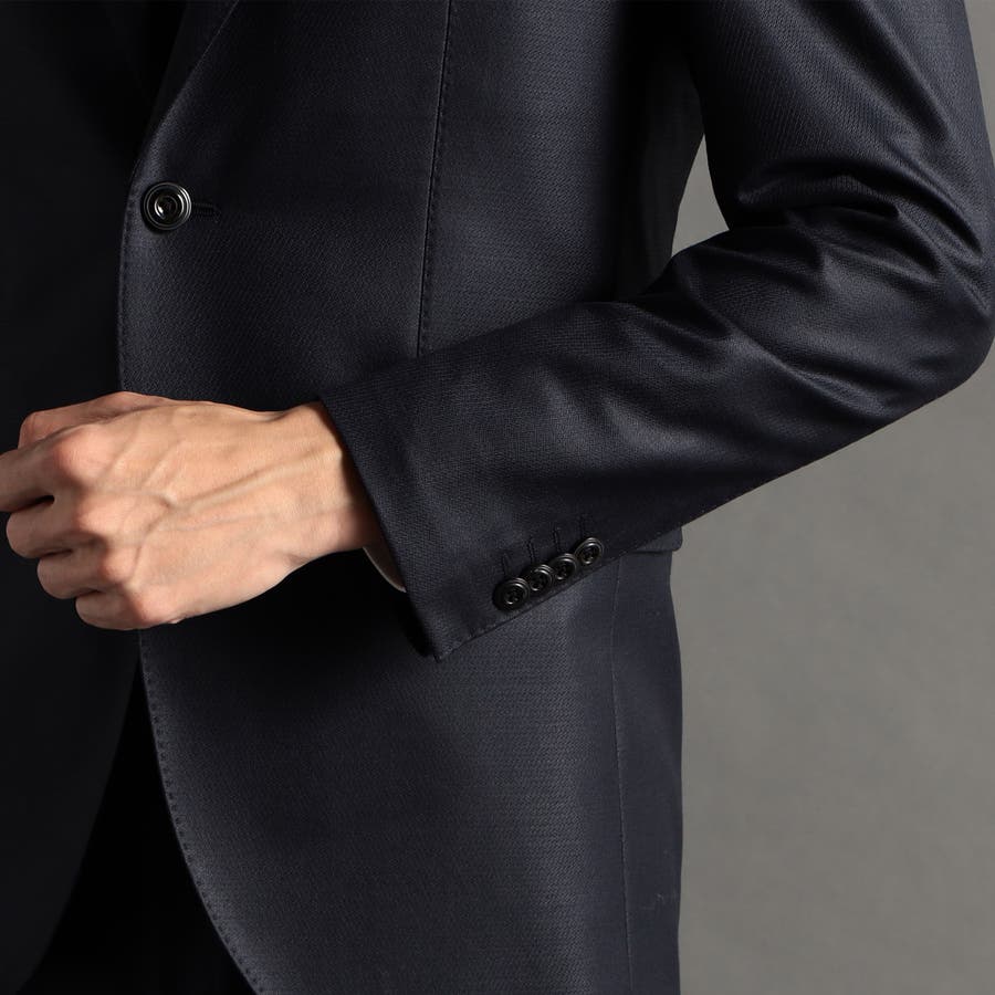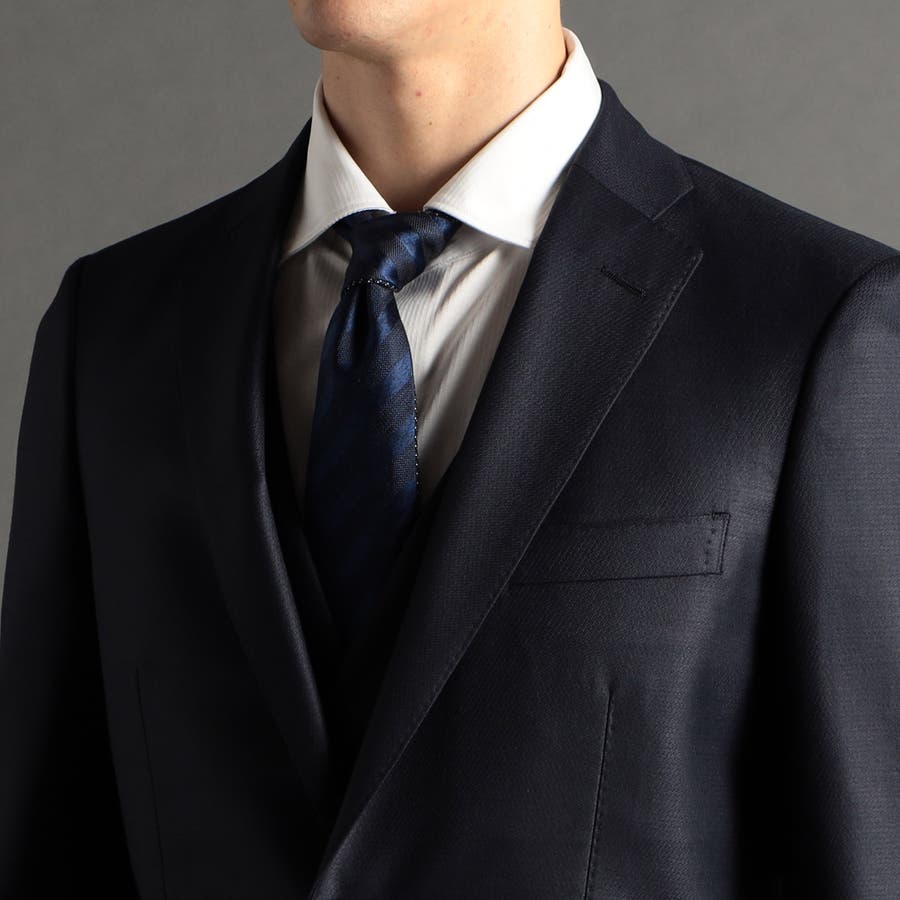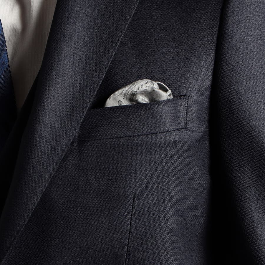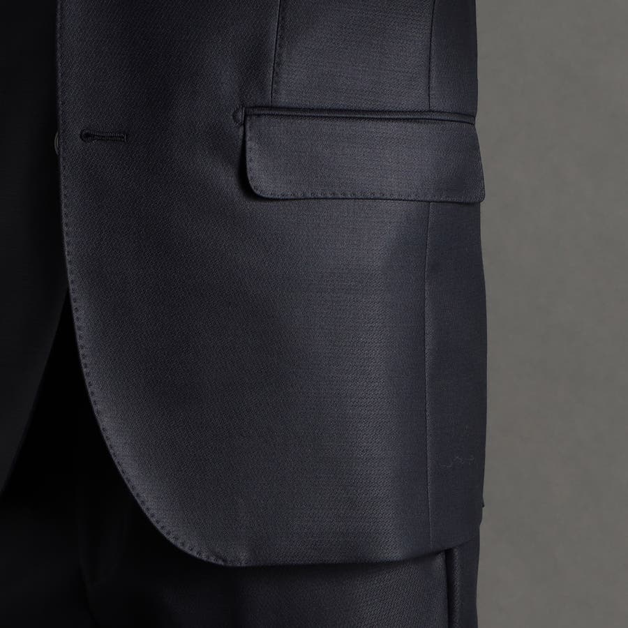 ジャケットはレギュラーモデルのノッチドラペル2つ釦、背抜き仕様。襟・ラペル・腰ポケットフラップにAMFステッチを入れています。胸ポケットの袋布を表に出せばポケットチーフ仕様になります。