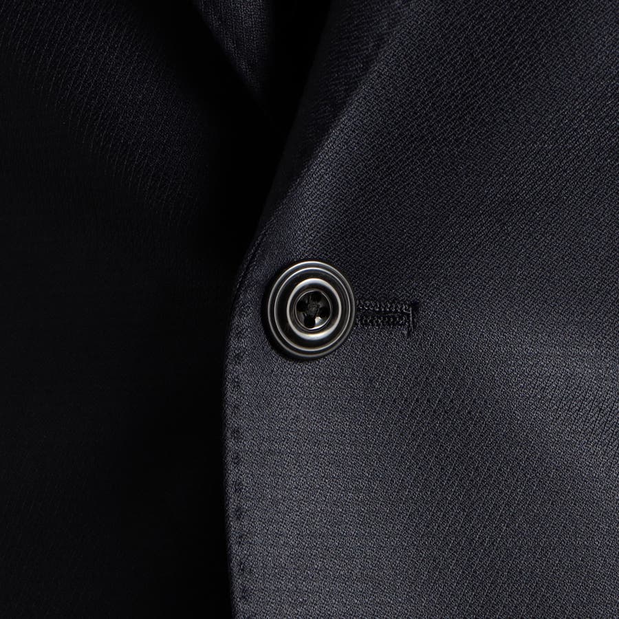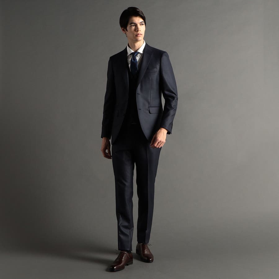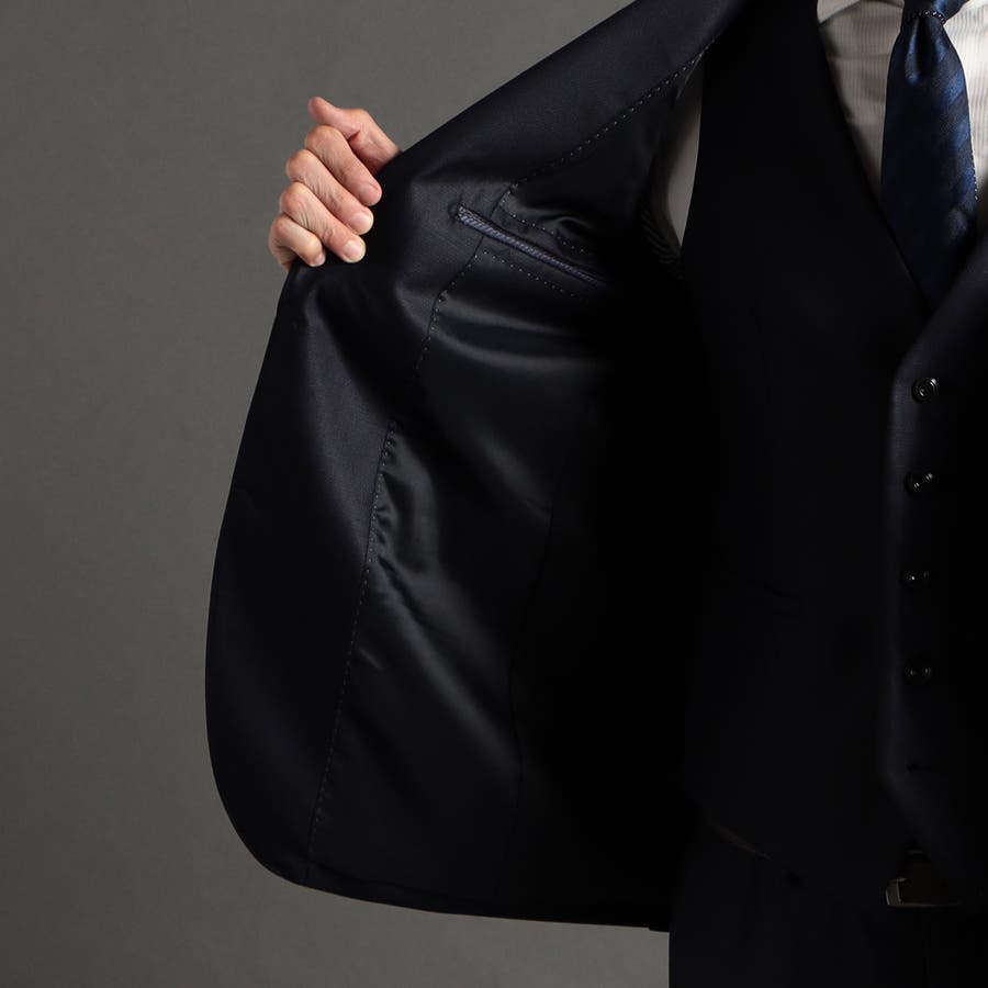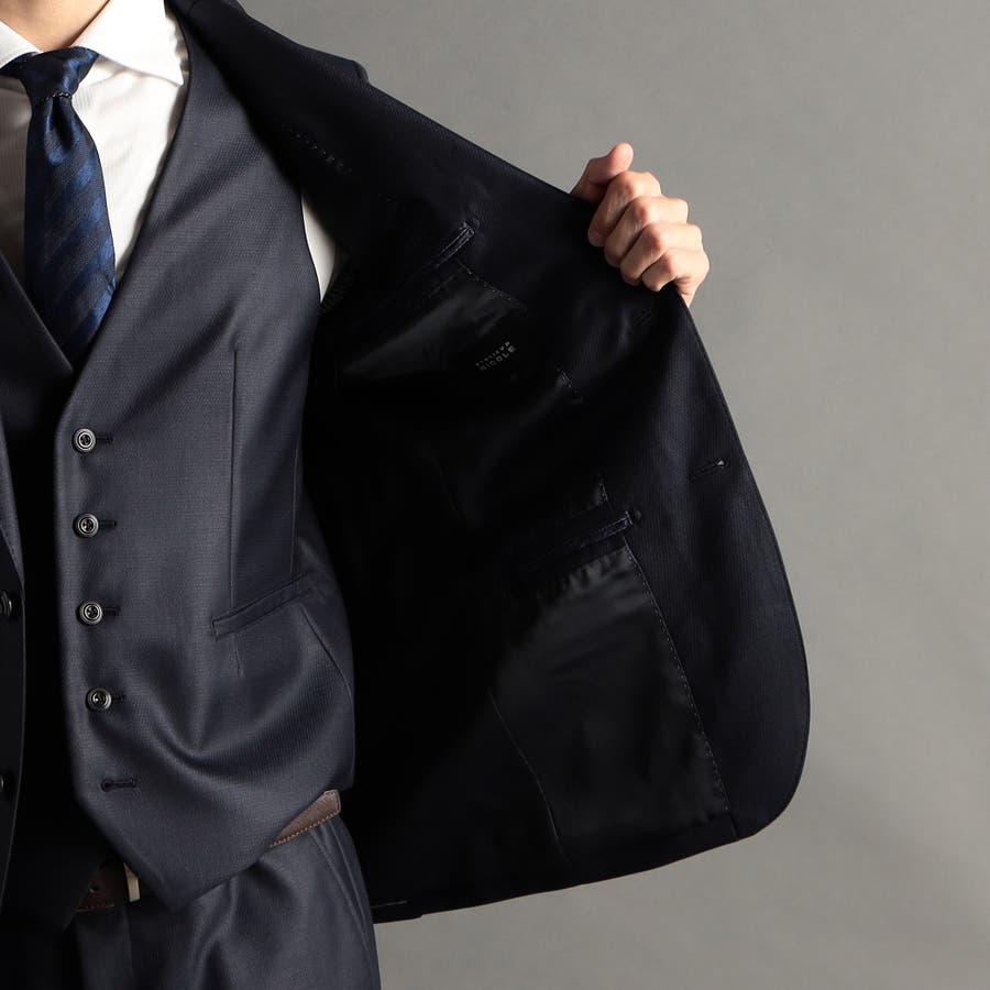 ジャケットはレギュラーモデルのノッチドラペル2つ釦、背抜き仕様。襟・ラペル・腰ポケットフラップにAMFステッチを入れています。胸ポケットの袋布を表に出せばポケットチーフ仕様になります。