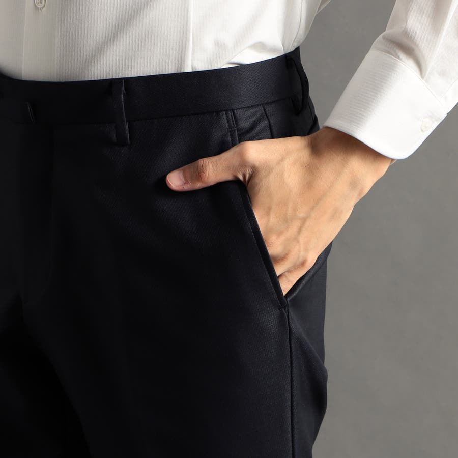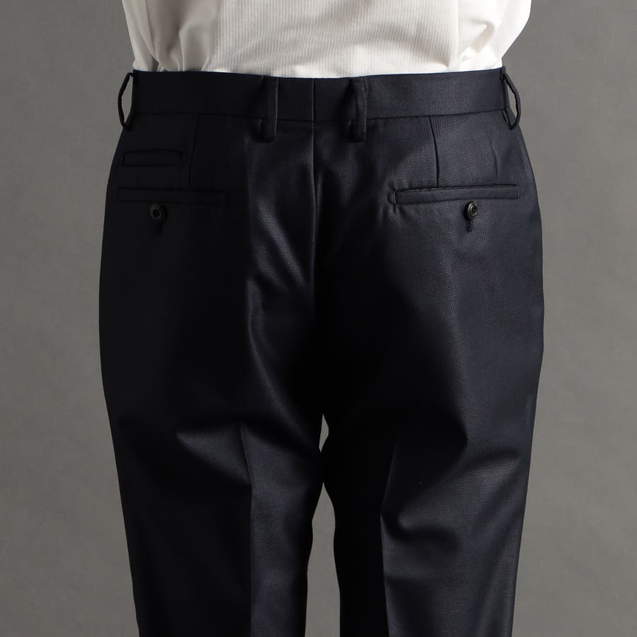 パンツはノータックのテーパードシルエット。腰裏のロゴ入り滑り止めテープがシャツのズレを防止します。左後ポケットにはモバイルポケットを付けました。