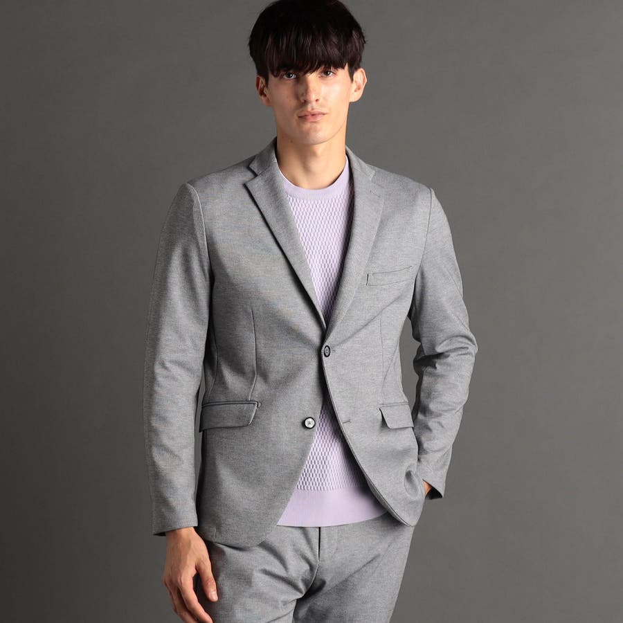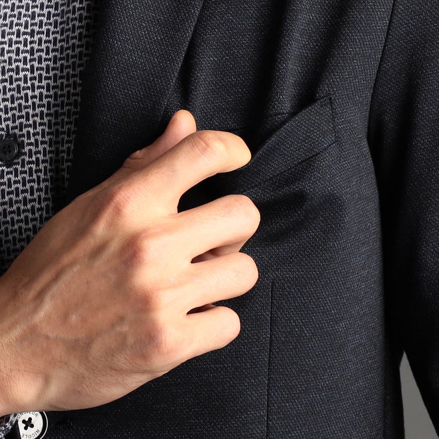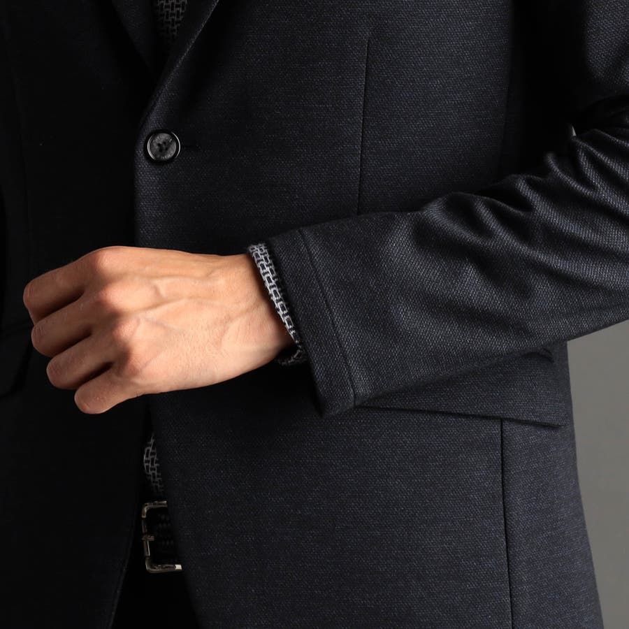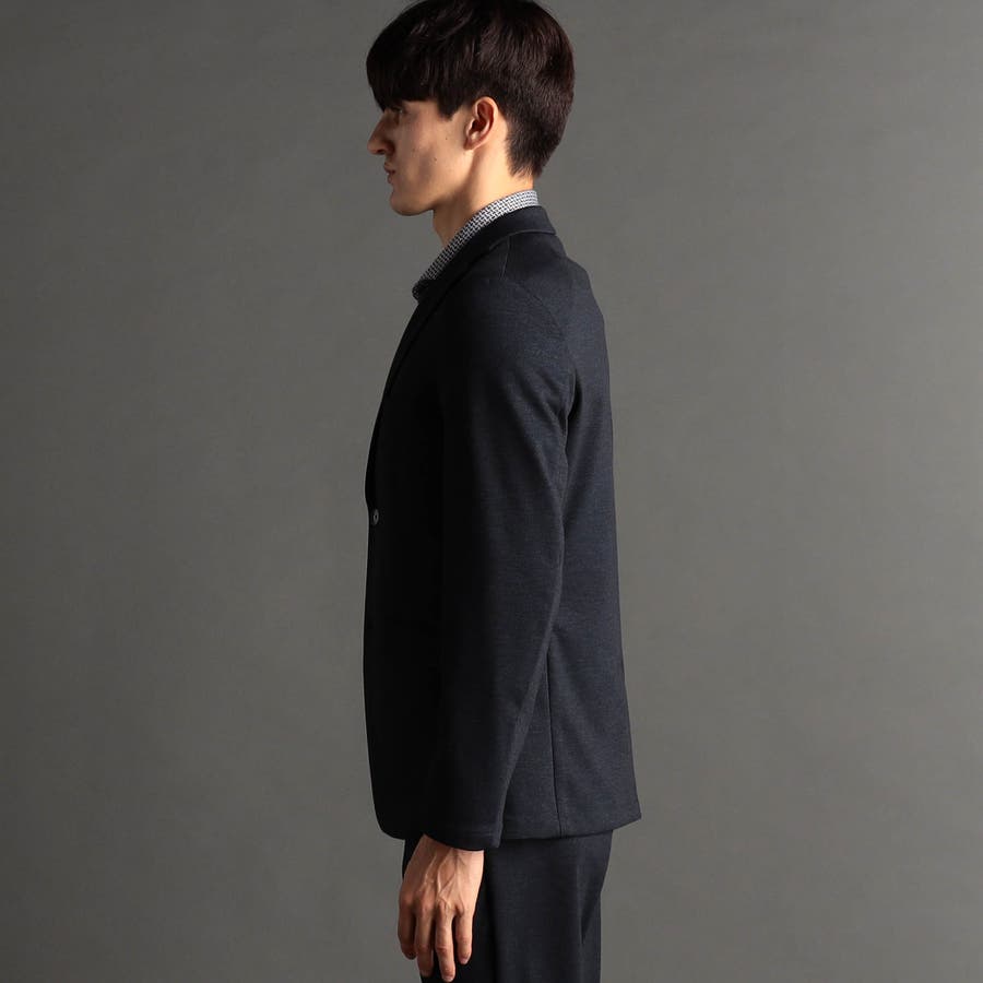 ミニマルなナローラペルに、ややスクエアラウンドしたフロントカットのベーシックな2つ釦シングルジャケット。